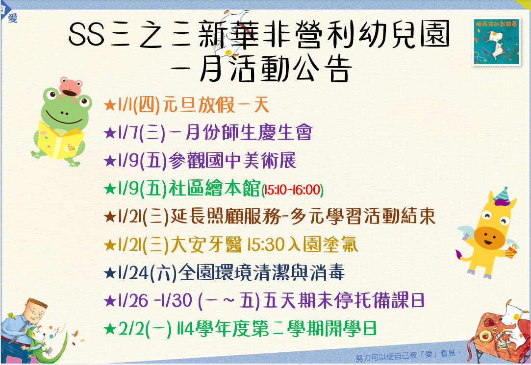 以下說明12月及1月的重點活動 (部分活動開放家長參與請留意喔!)