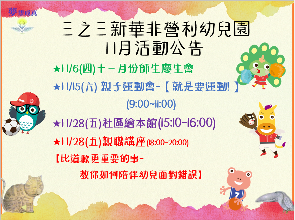 - 當天開放家長與親友一起帶大小朋友一起入園同樂喔!(若家長一起參與,活動結束本園幼兒同家長返家放學)