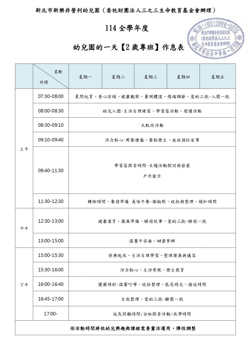 一日作息表 【2歲專班】PDF檔下載 ☞ 下載請點我