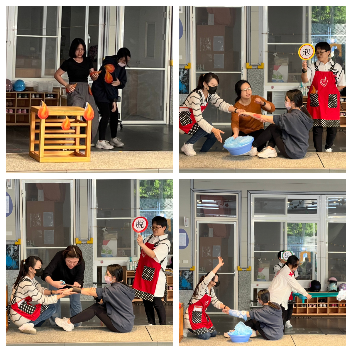 透藉由劇場演出讓孩子了解1.燒燙傷時的處理方法:沖、脫、泡、蓋、送;2.不要將水泡戳破或亂塗抹藥膏;3.遵守醫生的指示並每天換藥;遇到緊急事故時不要慌張,成人會陪伴、給予安慰和協助。