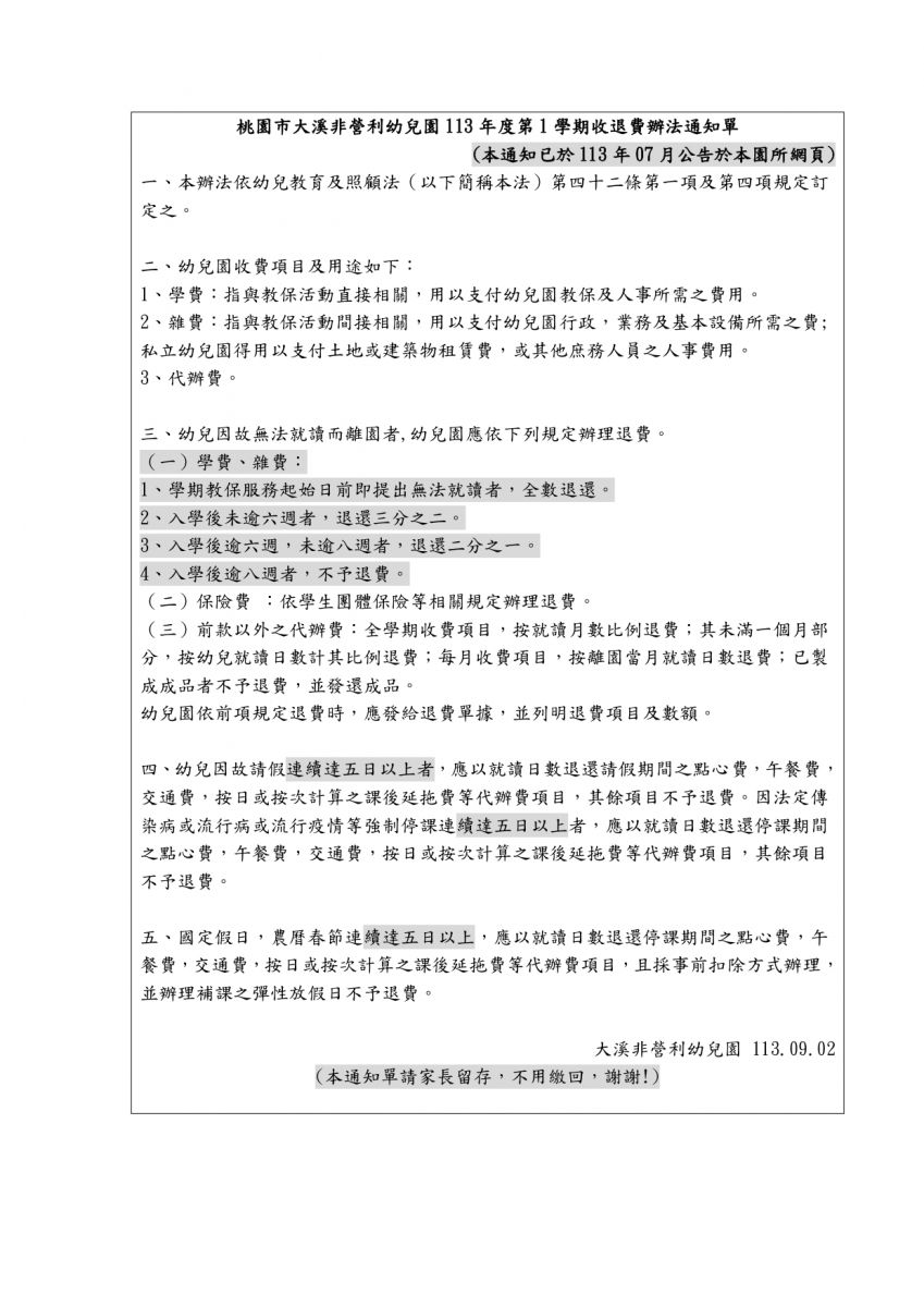 『非營利幼兒園退費相關辦法』