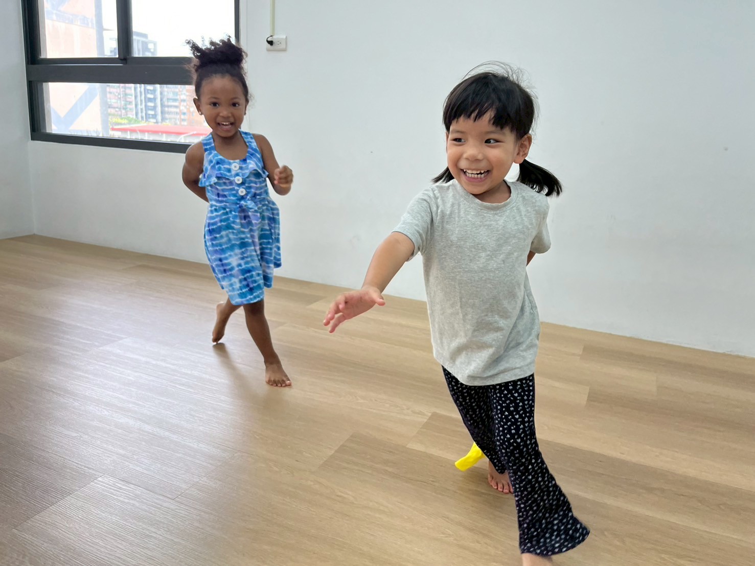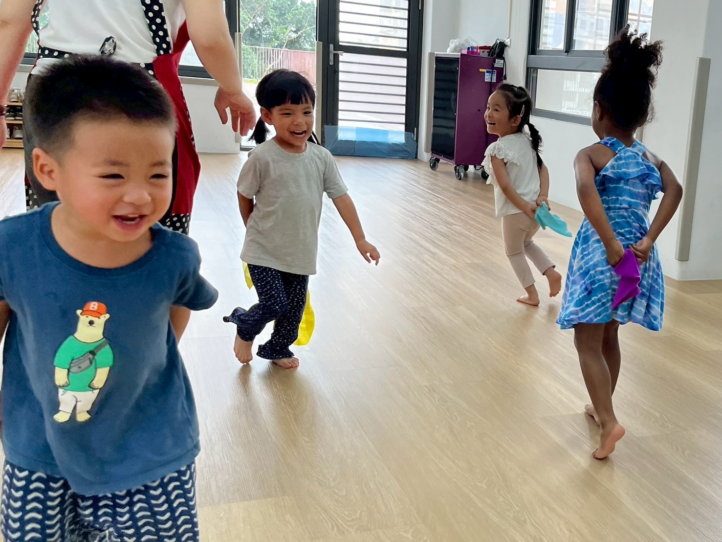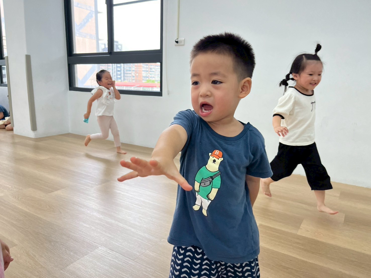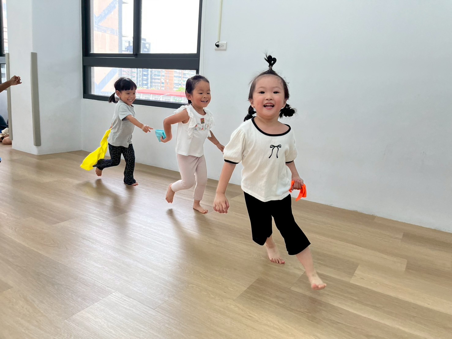 孩子們手拿小毛巾,透過互相閃躲、揮動與快速移動,訓練身體協調。活動中能提升反應速度與專注力,同時增進大肌肉的靈活性與控制力。