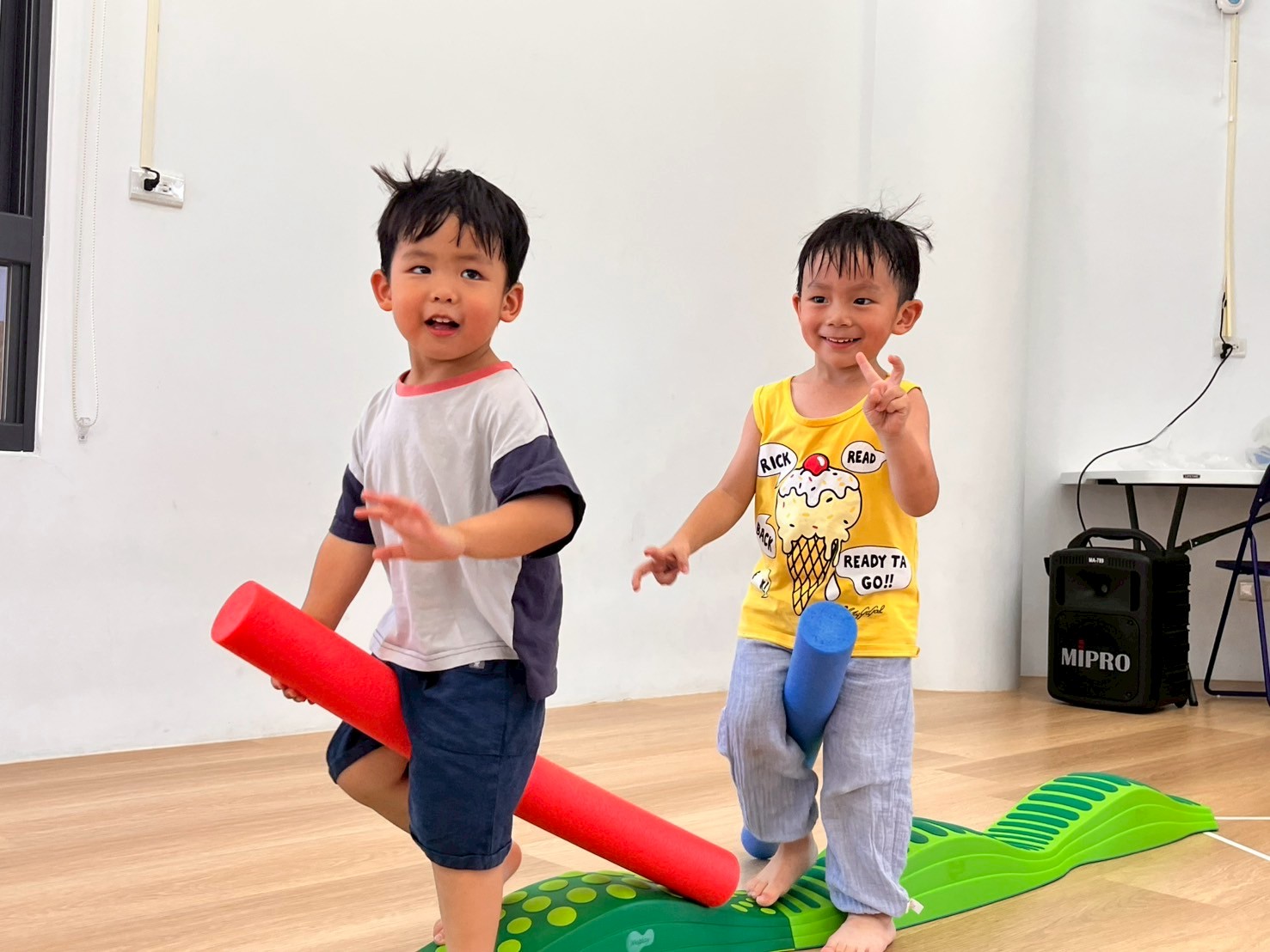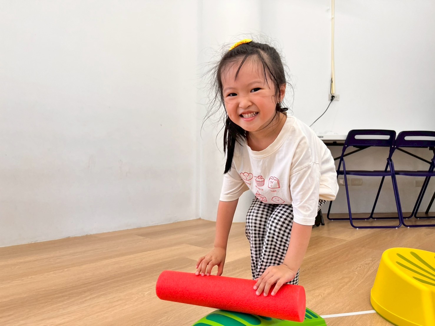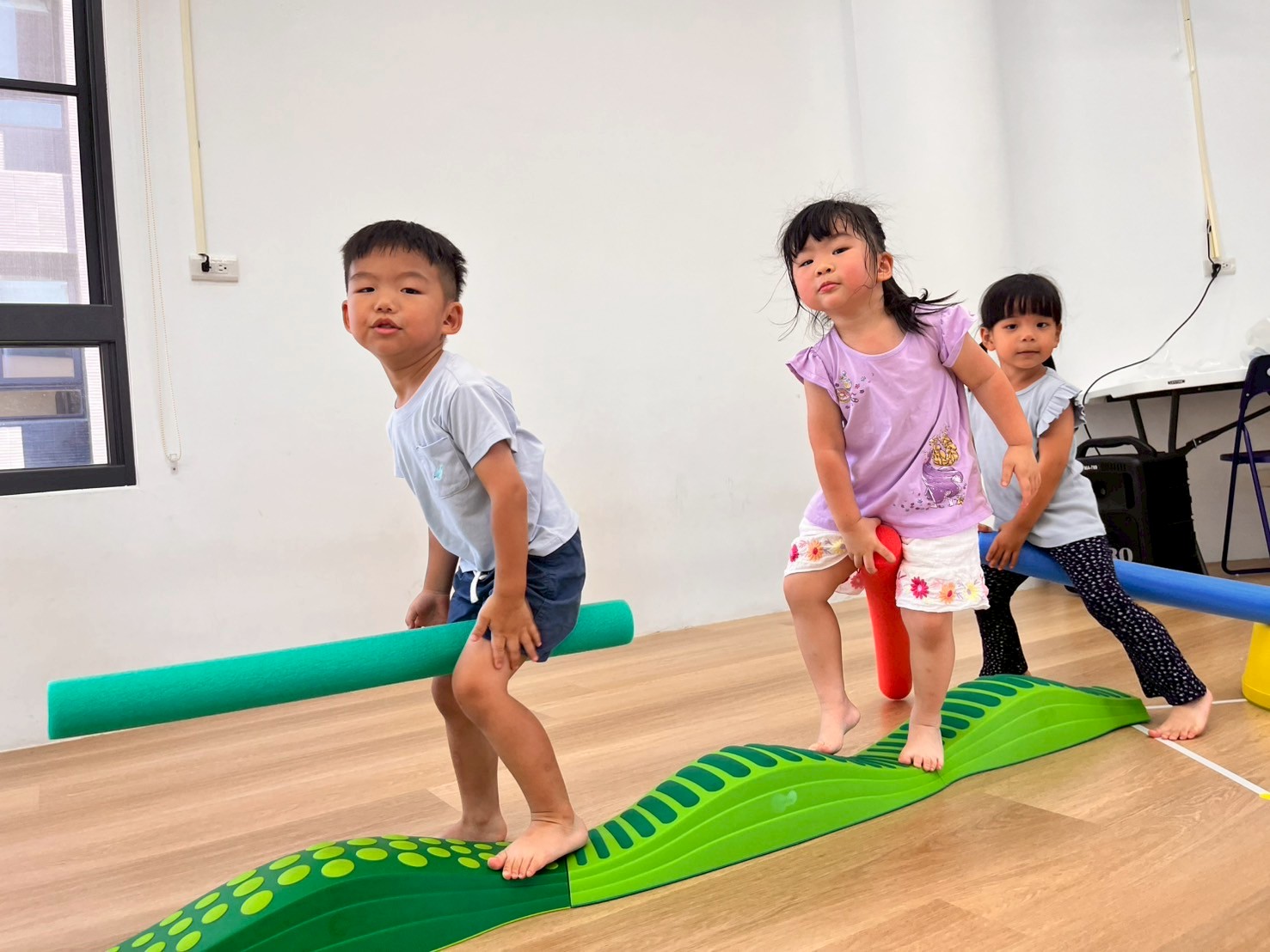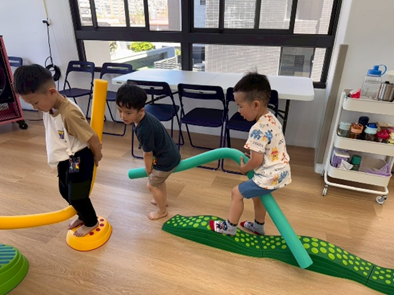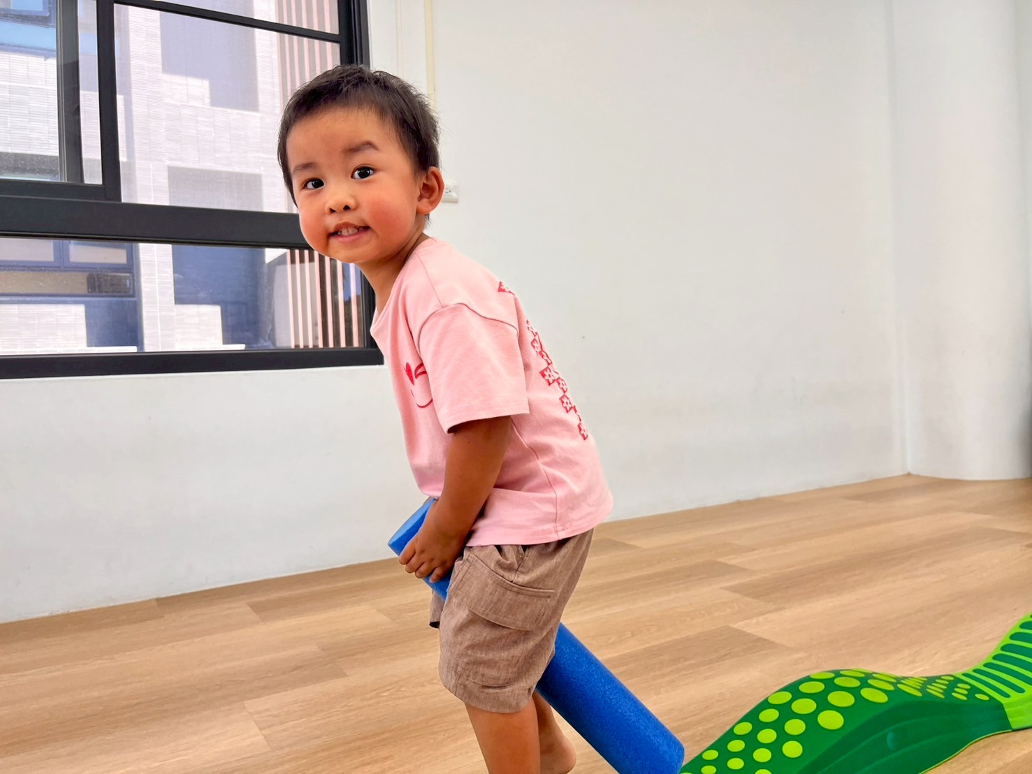 孩子透過雙腿夾泡棉棒的活動,孩子練習在行走中維持平衡與協調,提升下肢力量與身體控制,也從遊戲中建立專注與挑戰自我的信心。