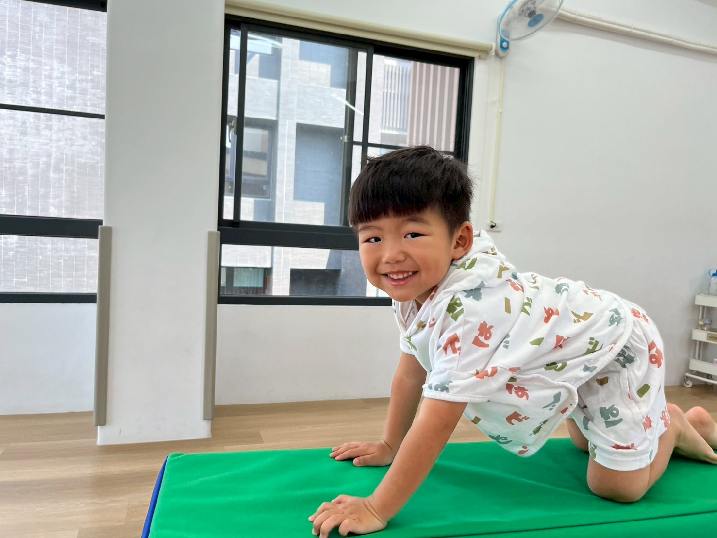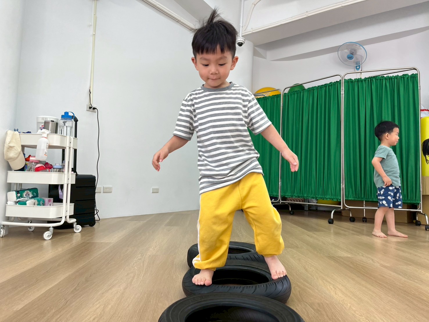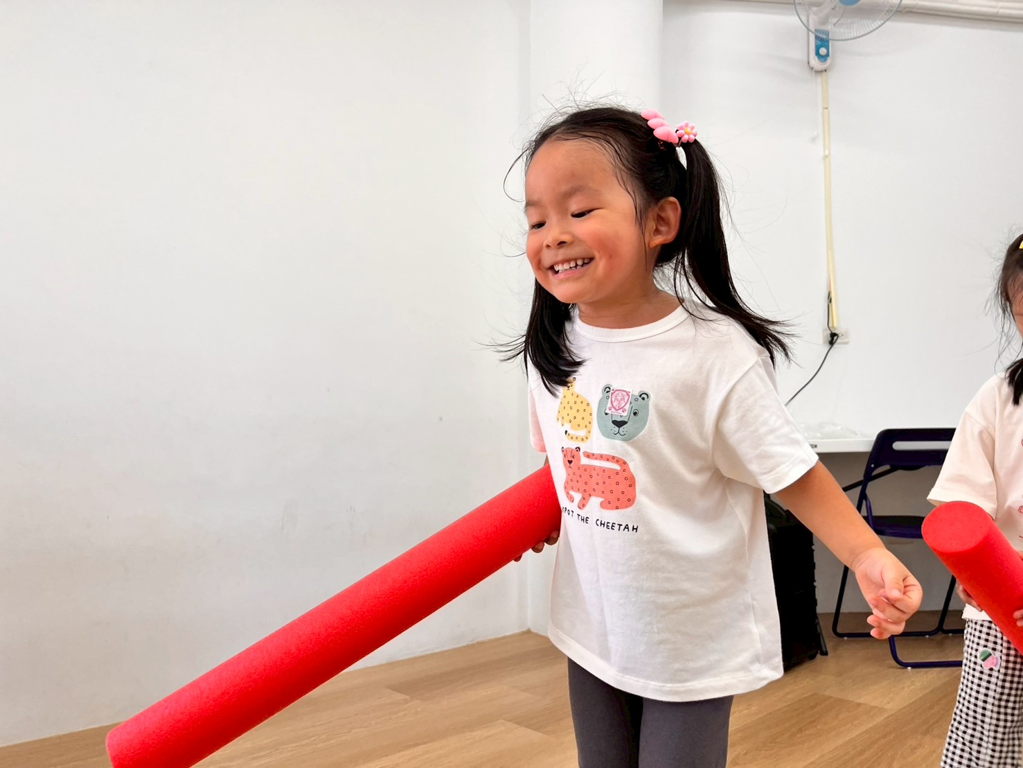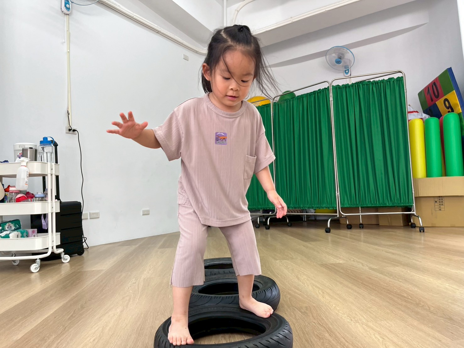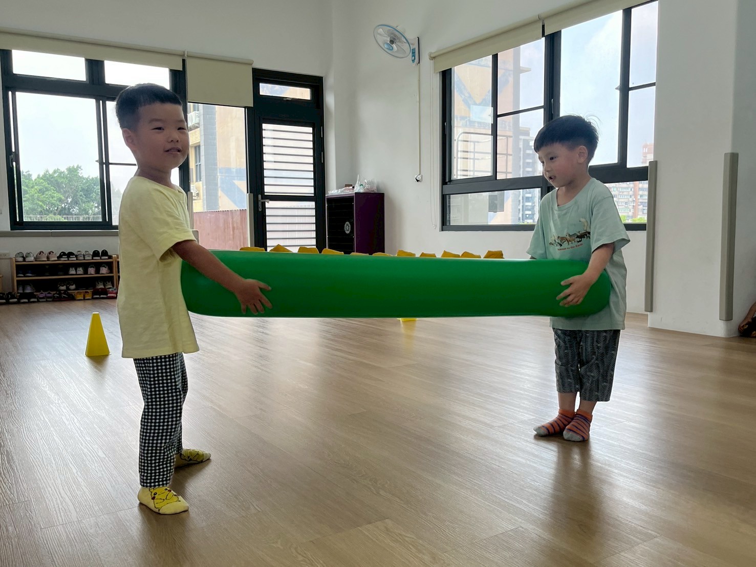 孩子透過雙腿夾泡棉棒的活動,孩子練習在行走中維持平衡與協調,提升下肢力量與身體控制,也從遊戲中建立專注與挑戰自我的信心。