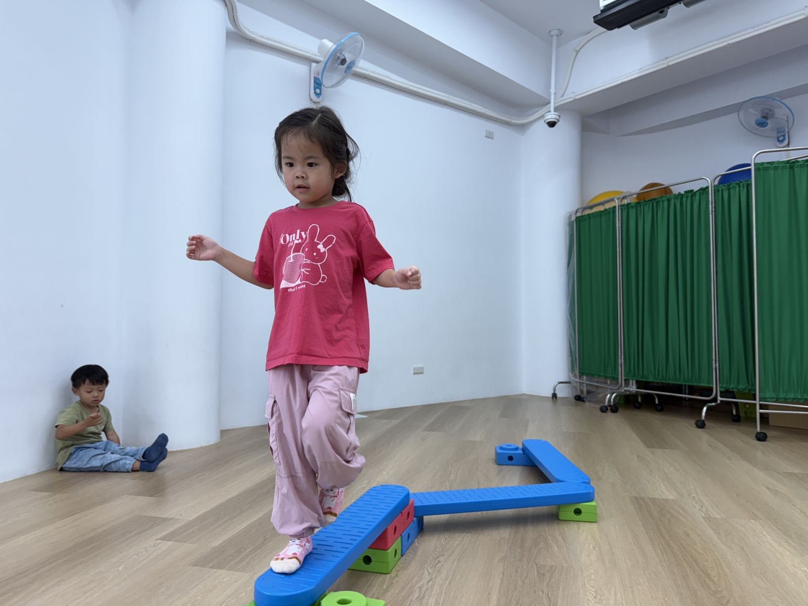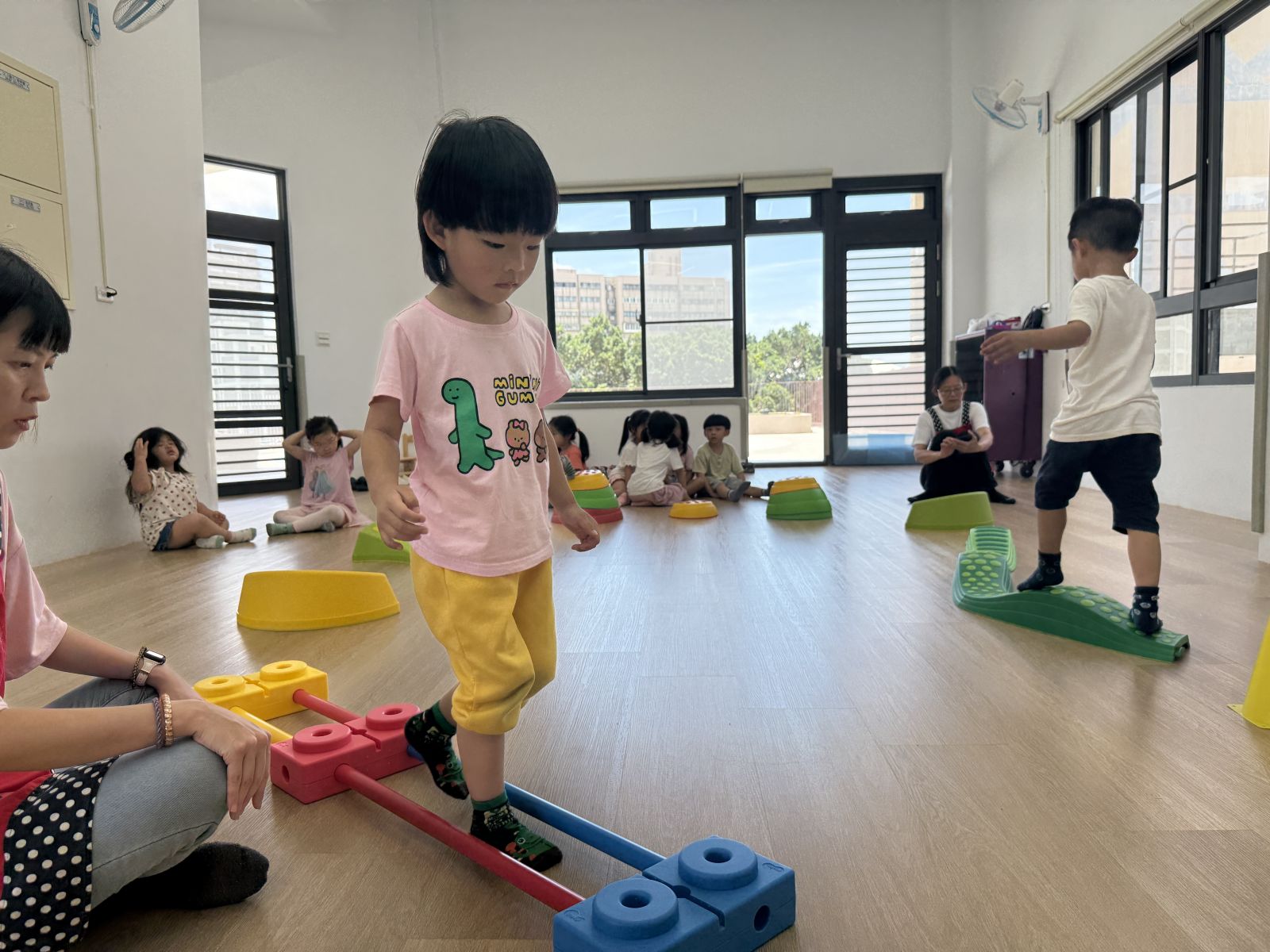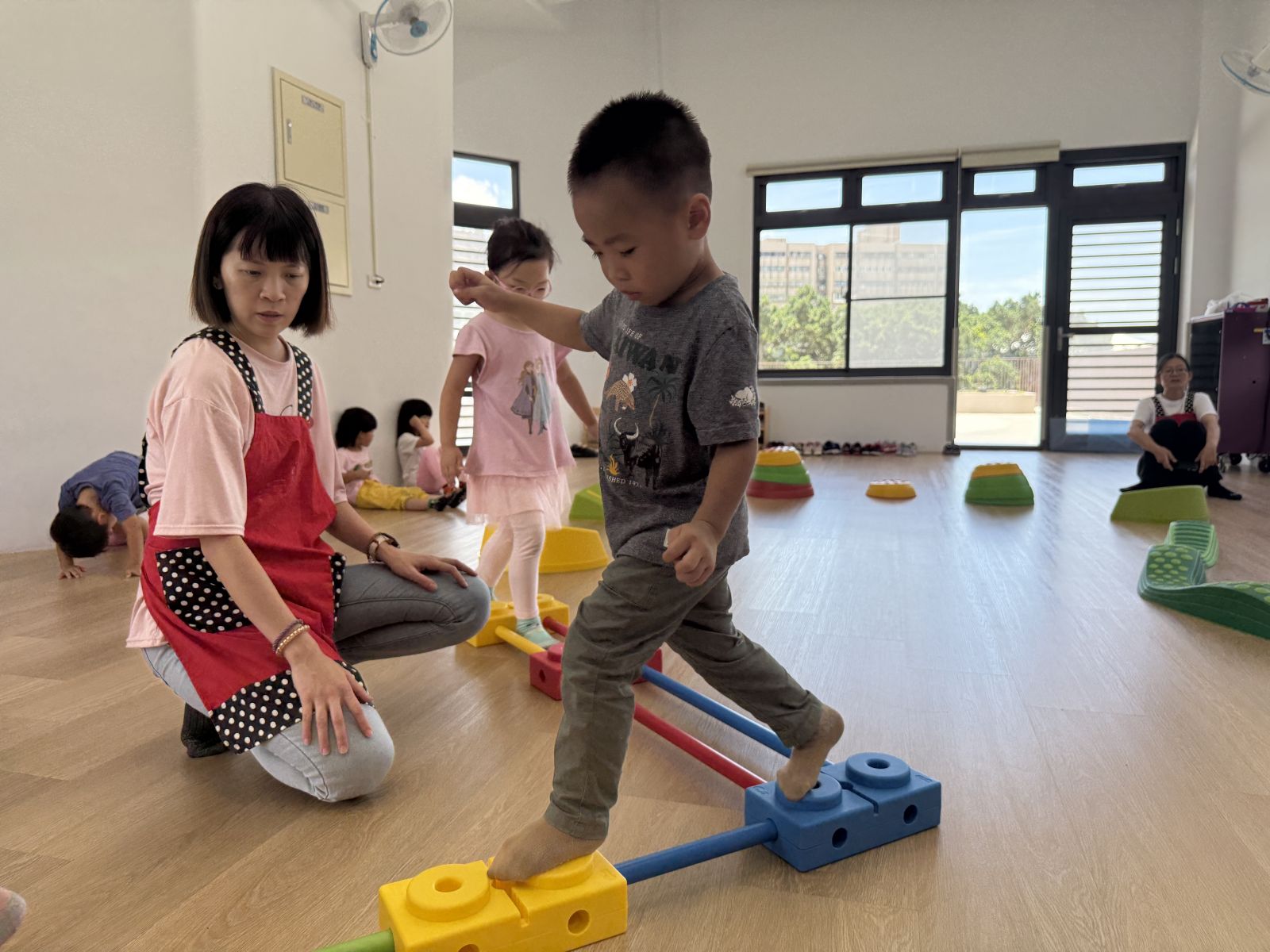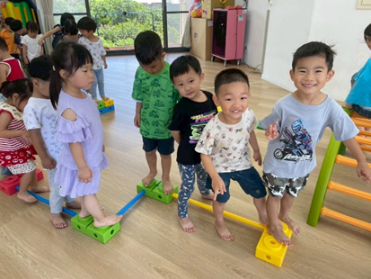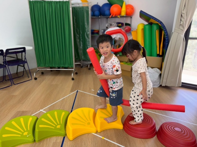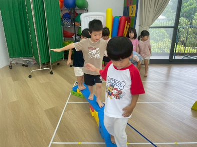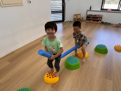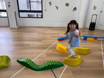 將彩虹河石設置有高有低,提升孩子平衡能力及雙側協調,剛開始孩子較容易不穩,也會感到有點害怕,但多練習幾次後,發現孩子的平衡感有越來越好唷。