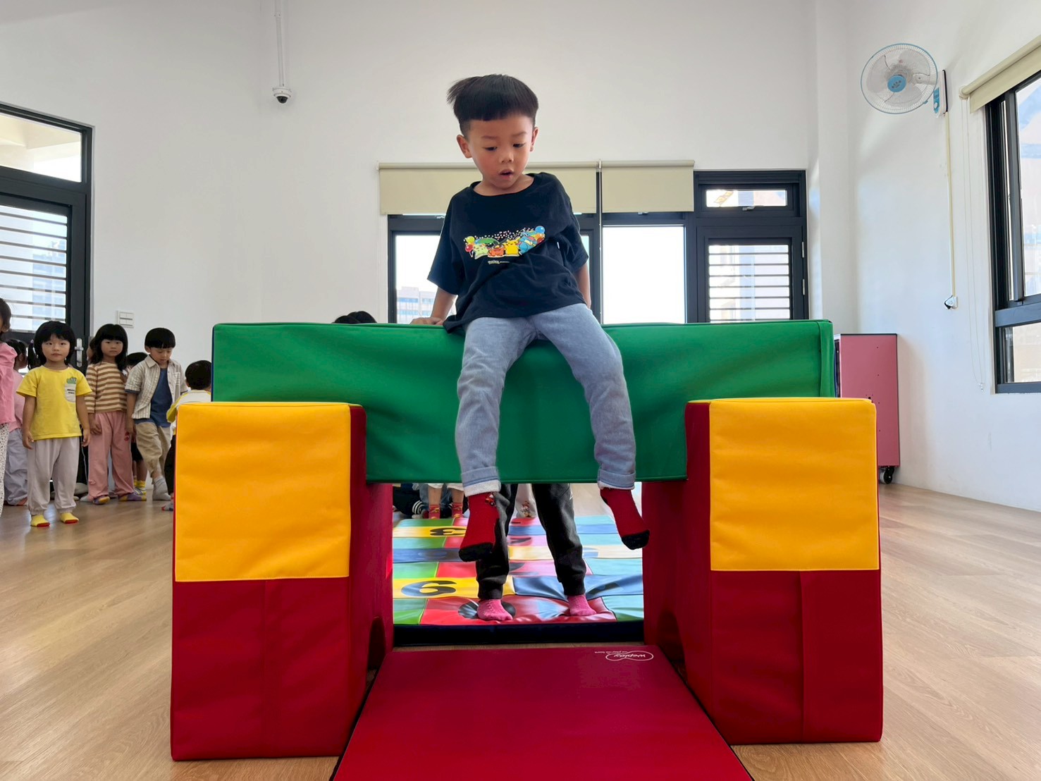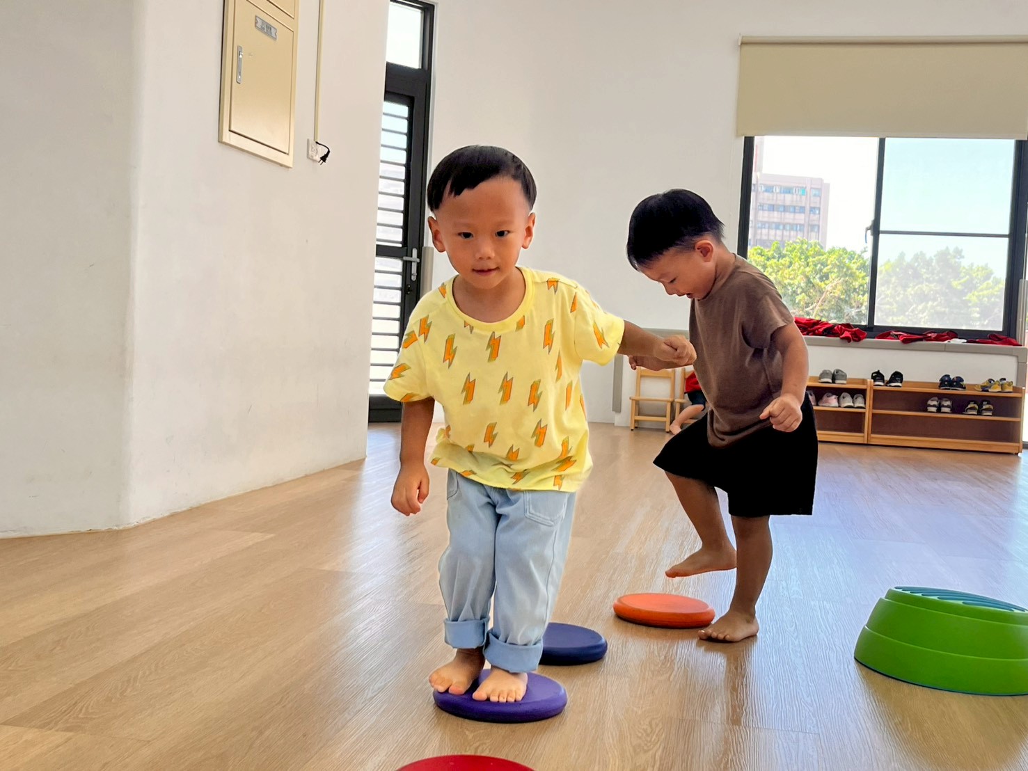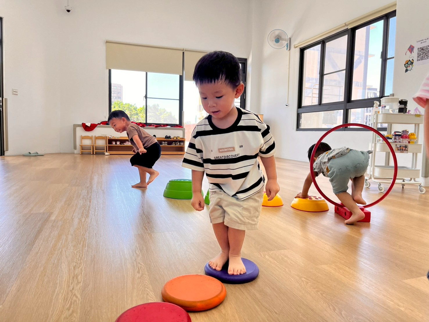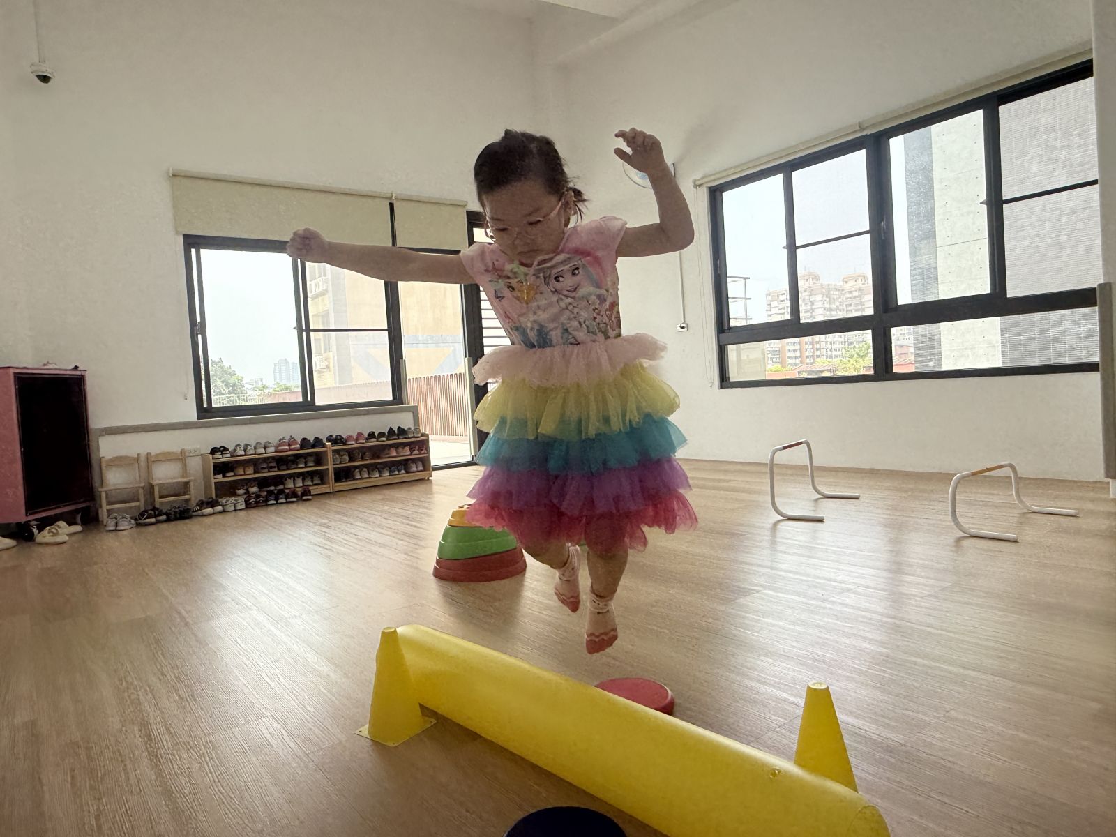 將彩虹河石設置有高有低,提升孩子平衡能力及雙側協調,剛開始孩子較容易不穩,也會感到有點害怕,但多練習幾次後,發現孩子的平衡感有越來越好唷。