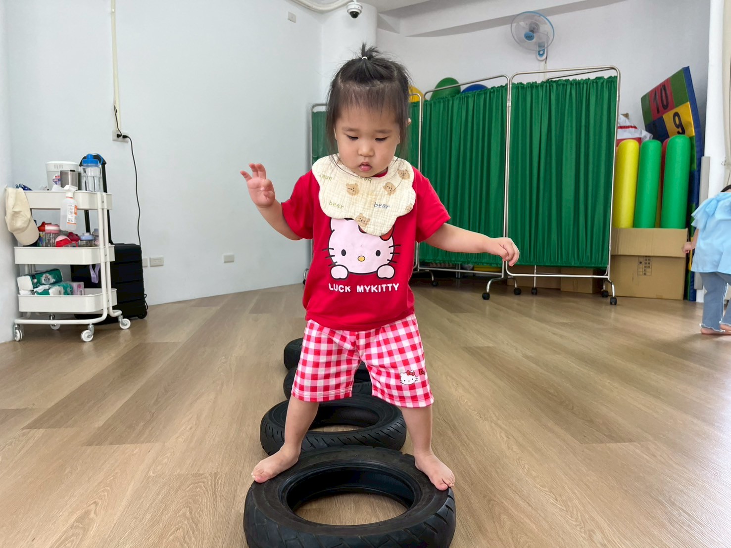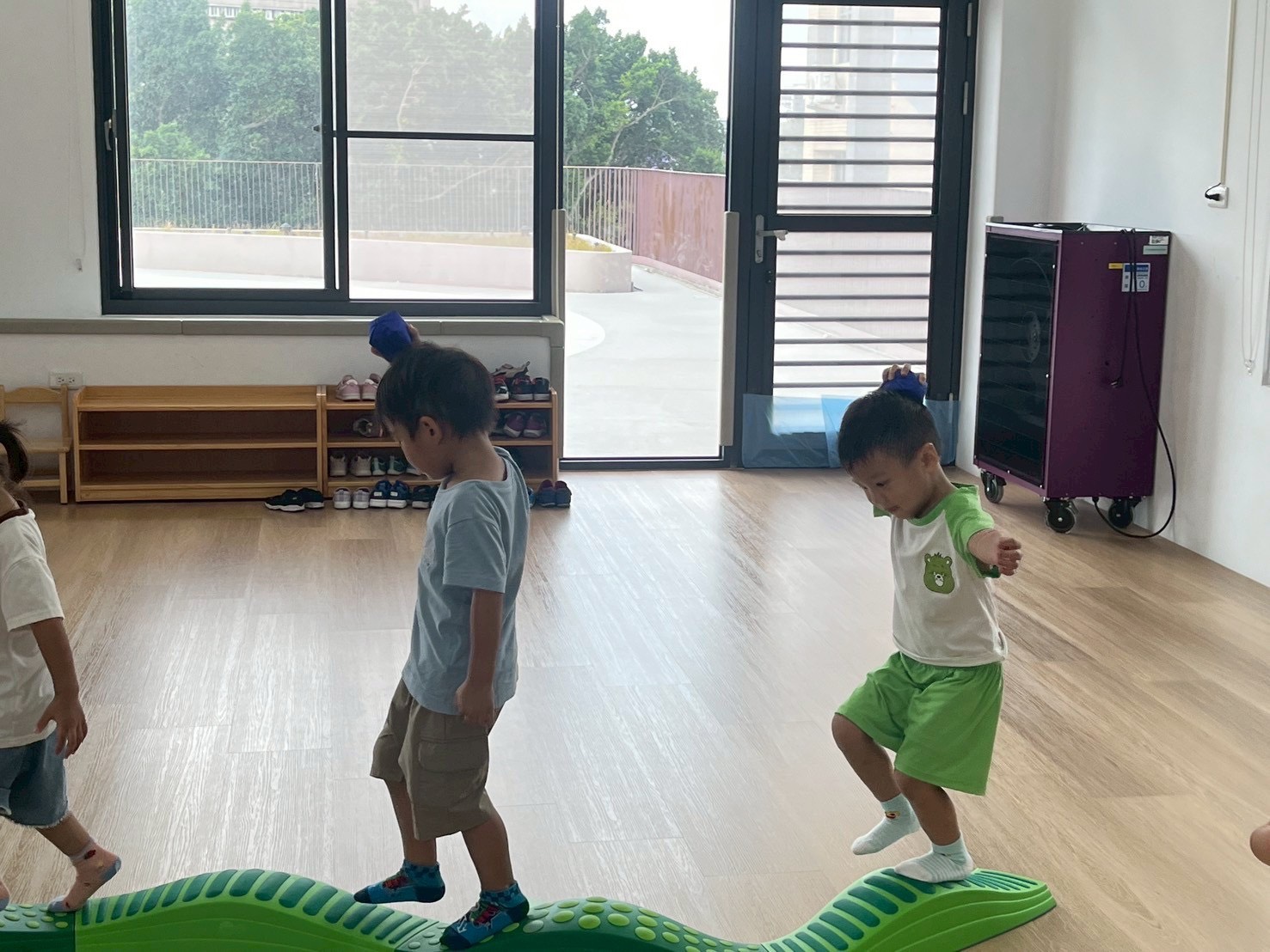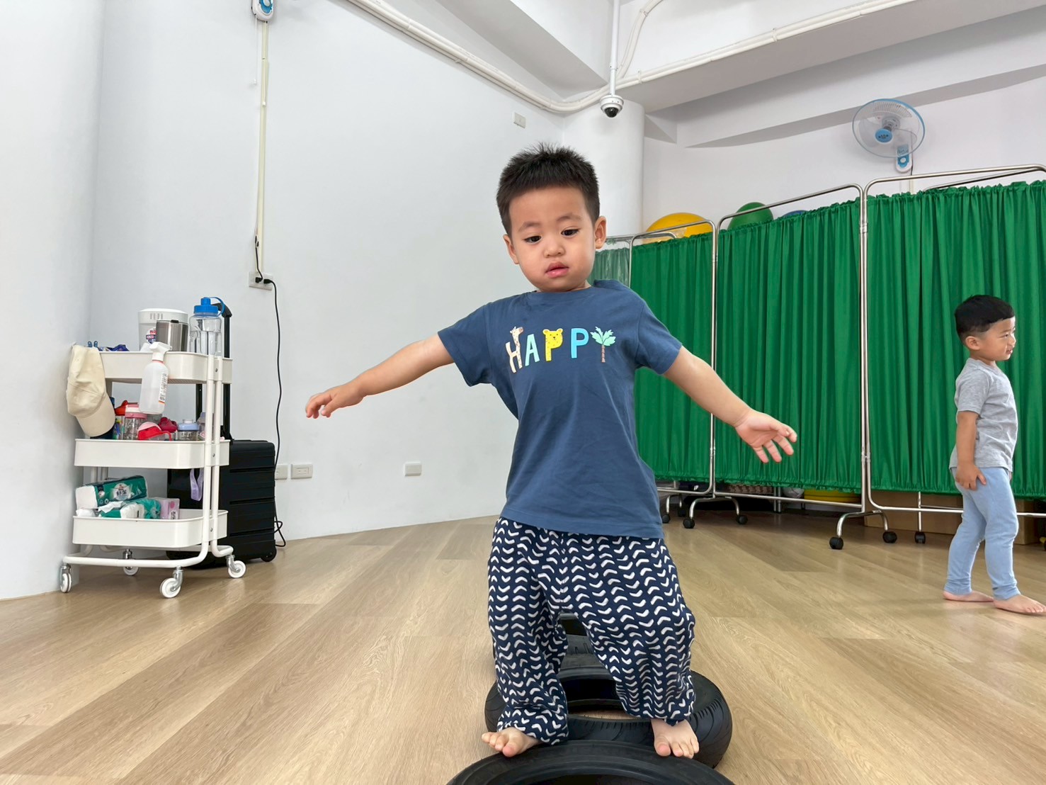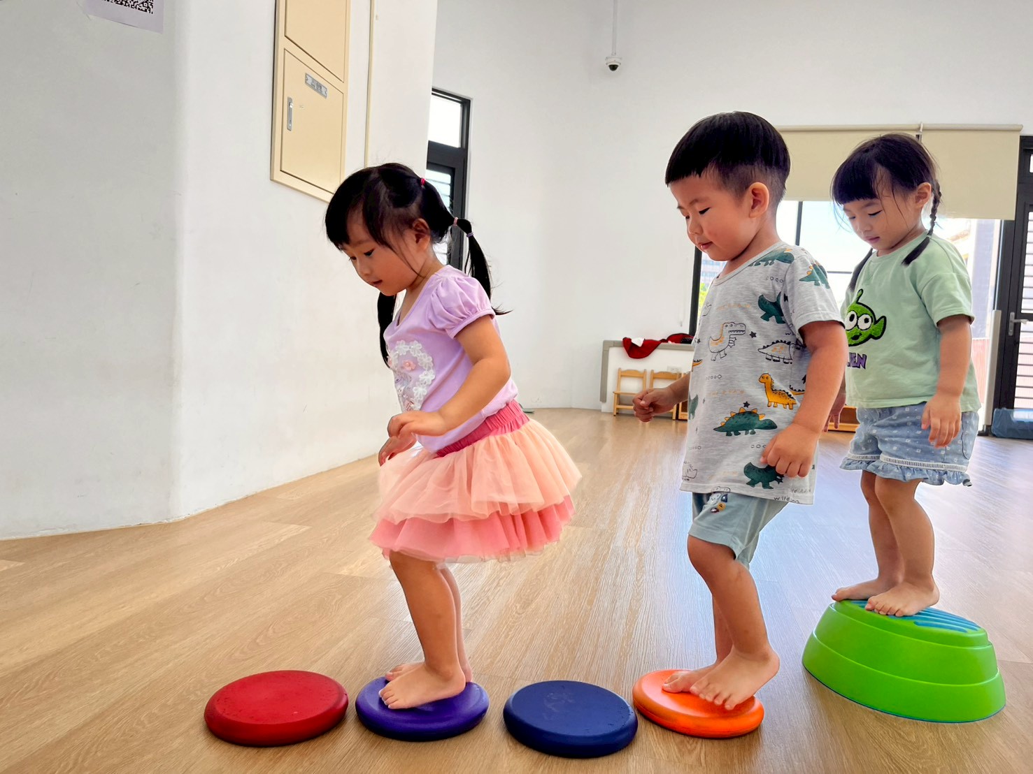 將彩虹河石設置有高有低,提升孩子平衡能力及雙側協調,剛開始孩子較容易不穩,也會感到有點害怕,但多練習幾次後,發現孩子的平衡感有越來越好唷。