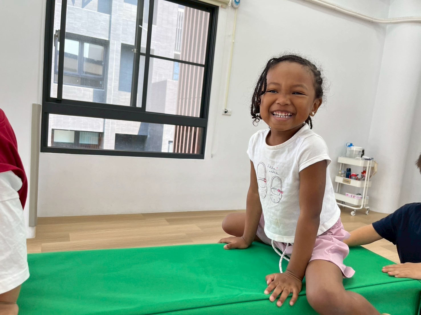 透過拉、爬、推等不同的動作,孩子們在滑溜布上運用身體各部位前進,除了增進大肌肉的運用外,也提升孩子的抓握力及協調性。