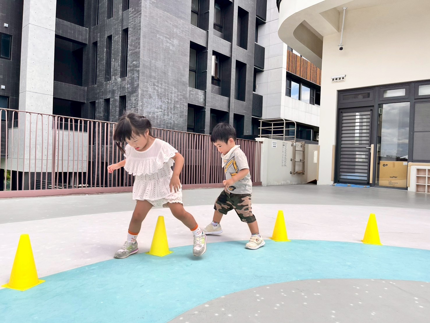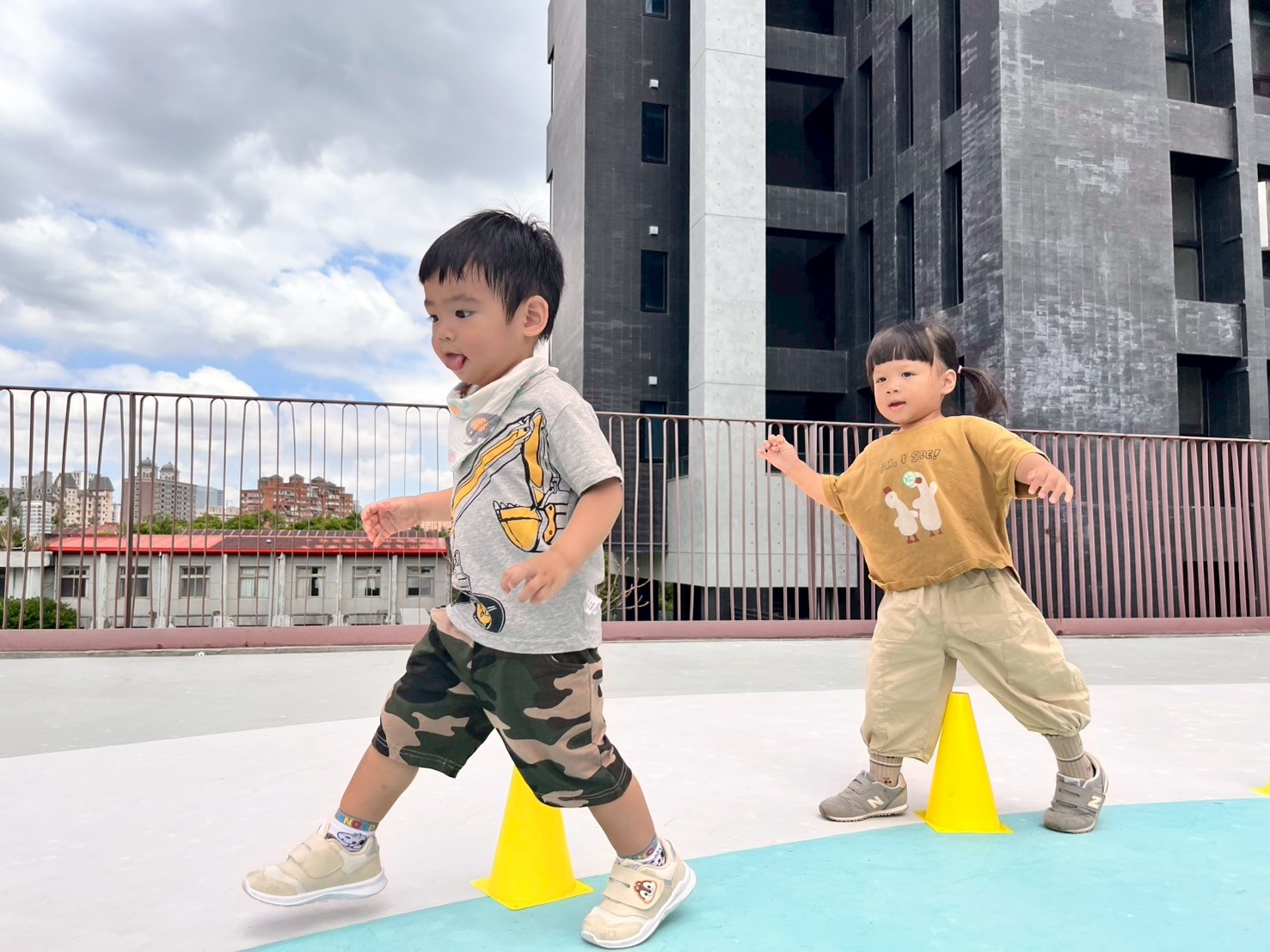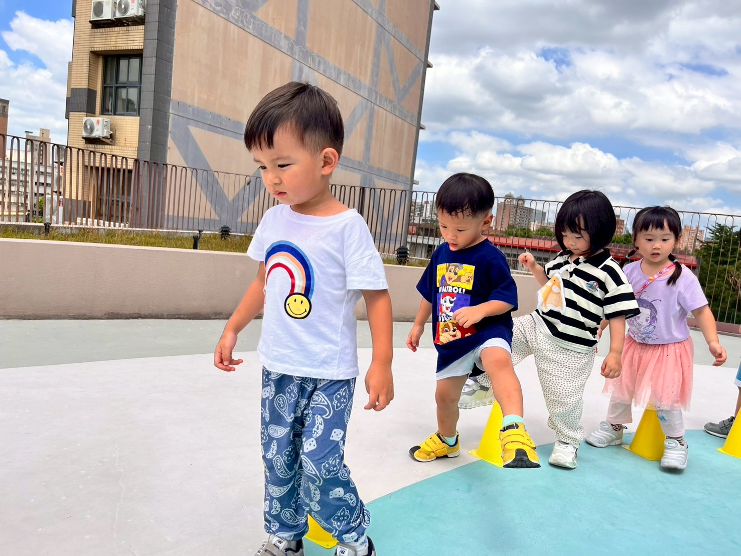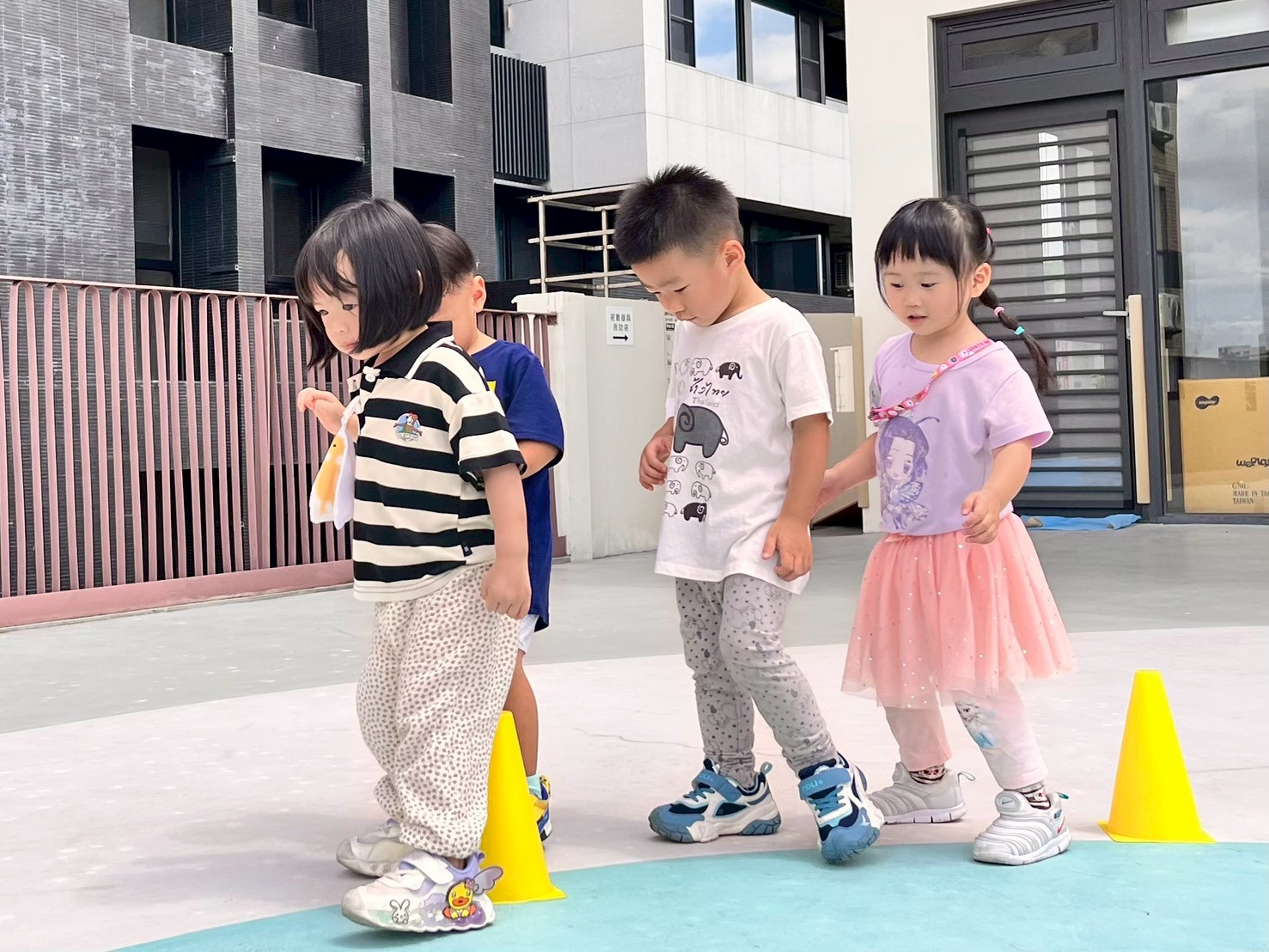 孩子們手持三角錐,小心翼翼地跨越障礙,專注保持平衡,雙手穩穩握住道具,步伐輕盈且有節奏。每一次挑戰都充滿耐心與信心,展現出良好的身體協調力。