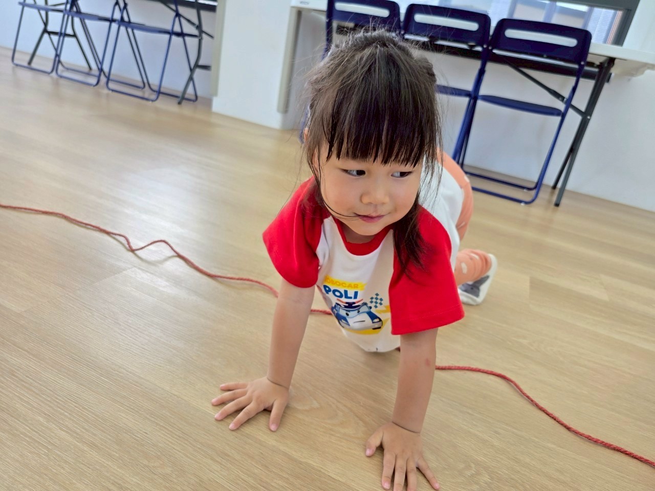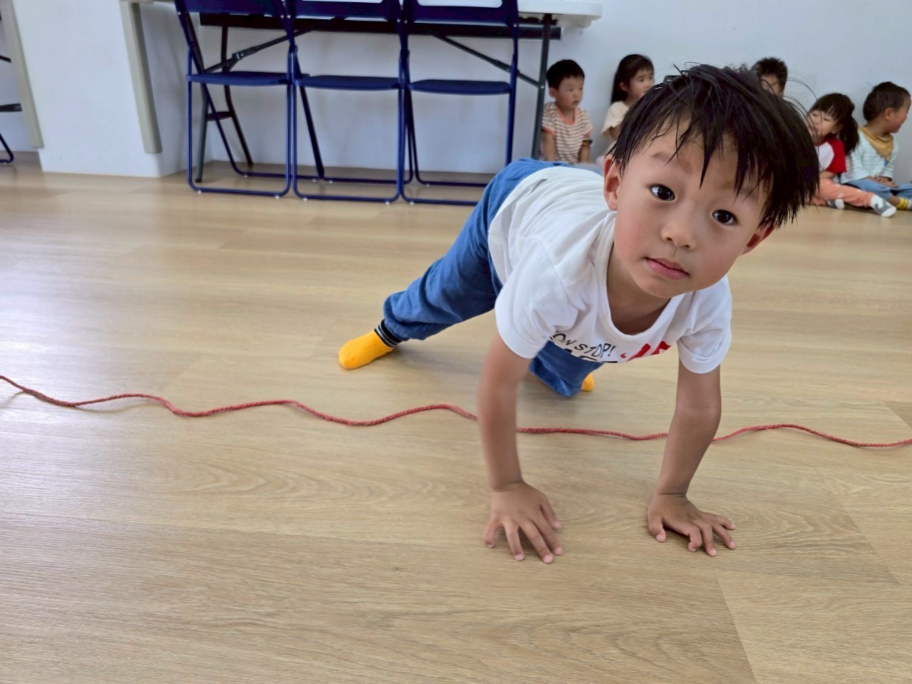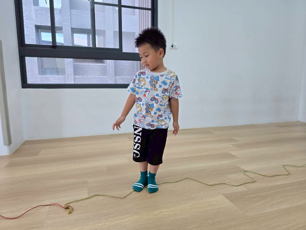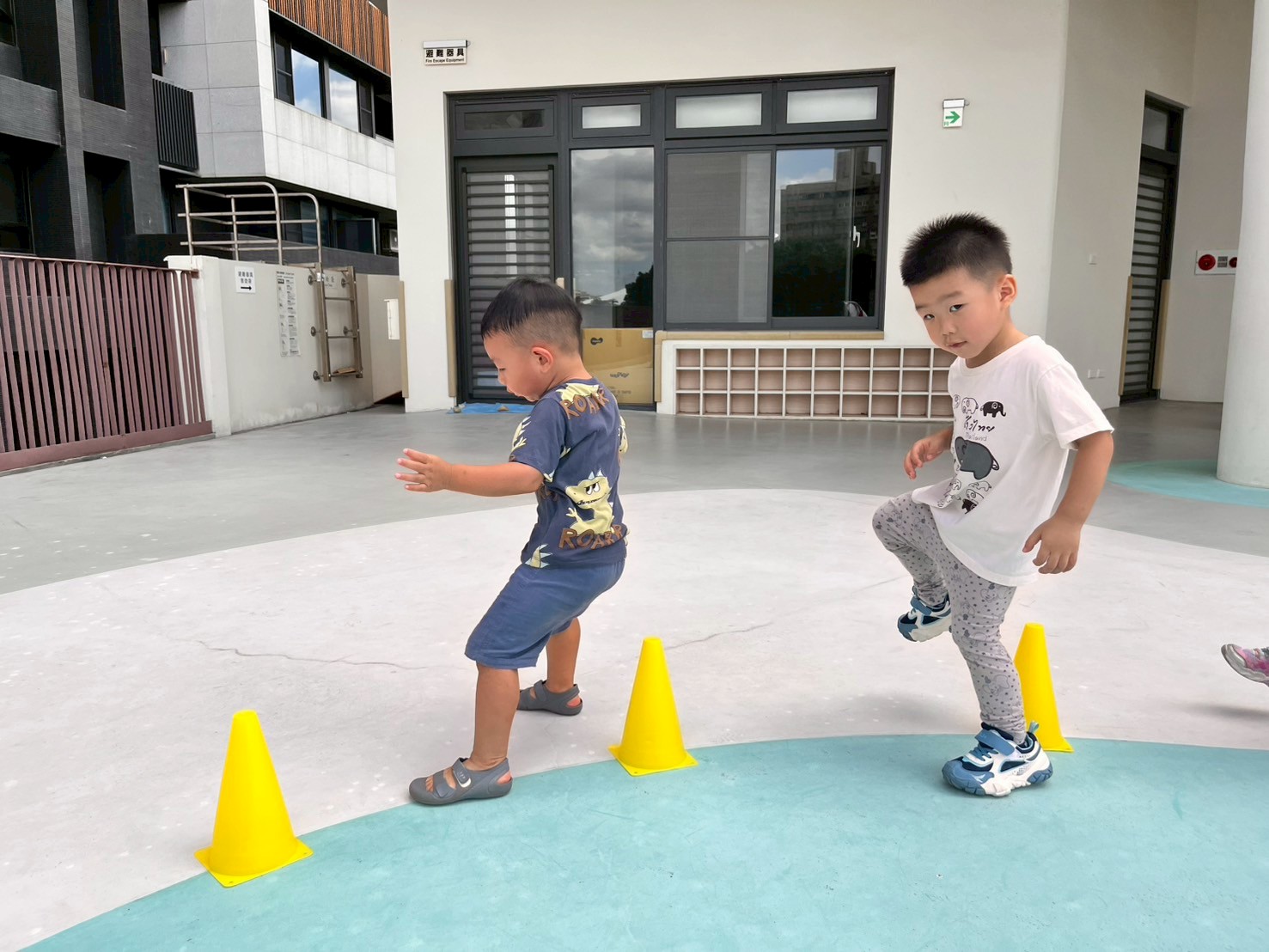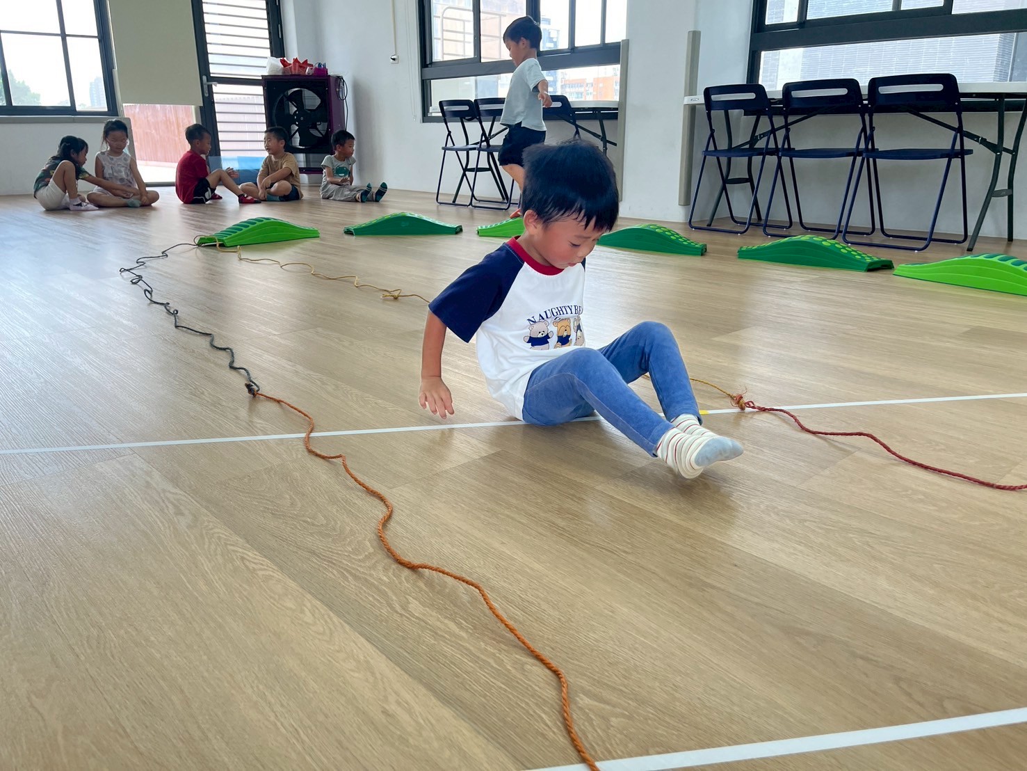 孩子們化身消防小英雄,沿著繩索練習跳躍與跨步,動作專注又認真。每位孩子都努力完成挑戰喔!