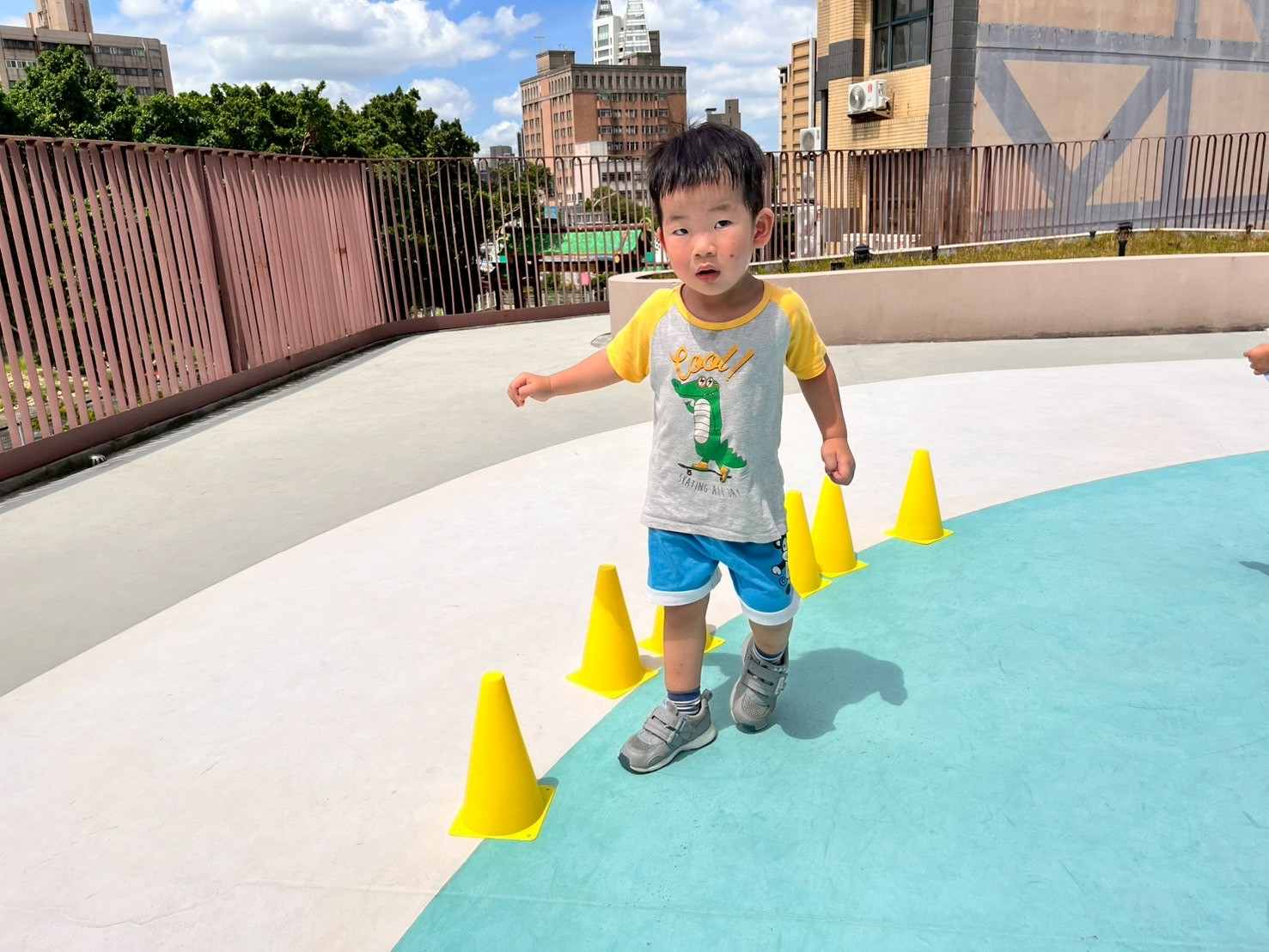 孩子跨越三角錐時練習抬腿與控制腳步,過程中展現平衡協調、專注力與持續挑戰的能力。