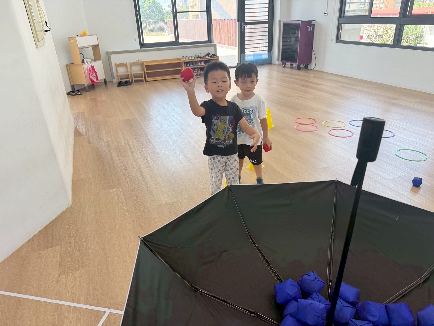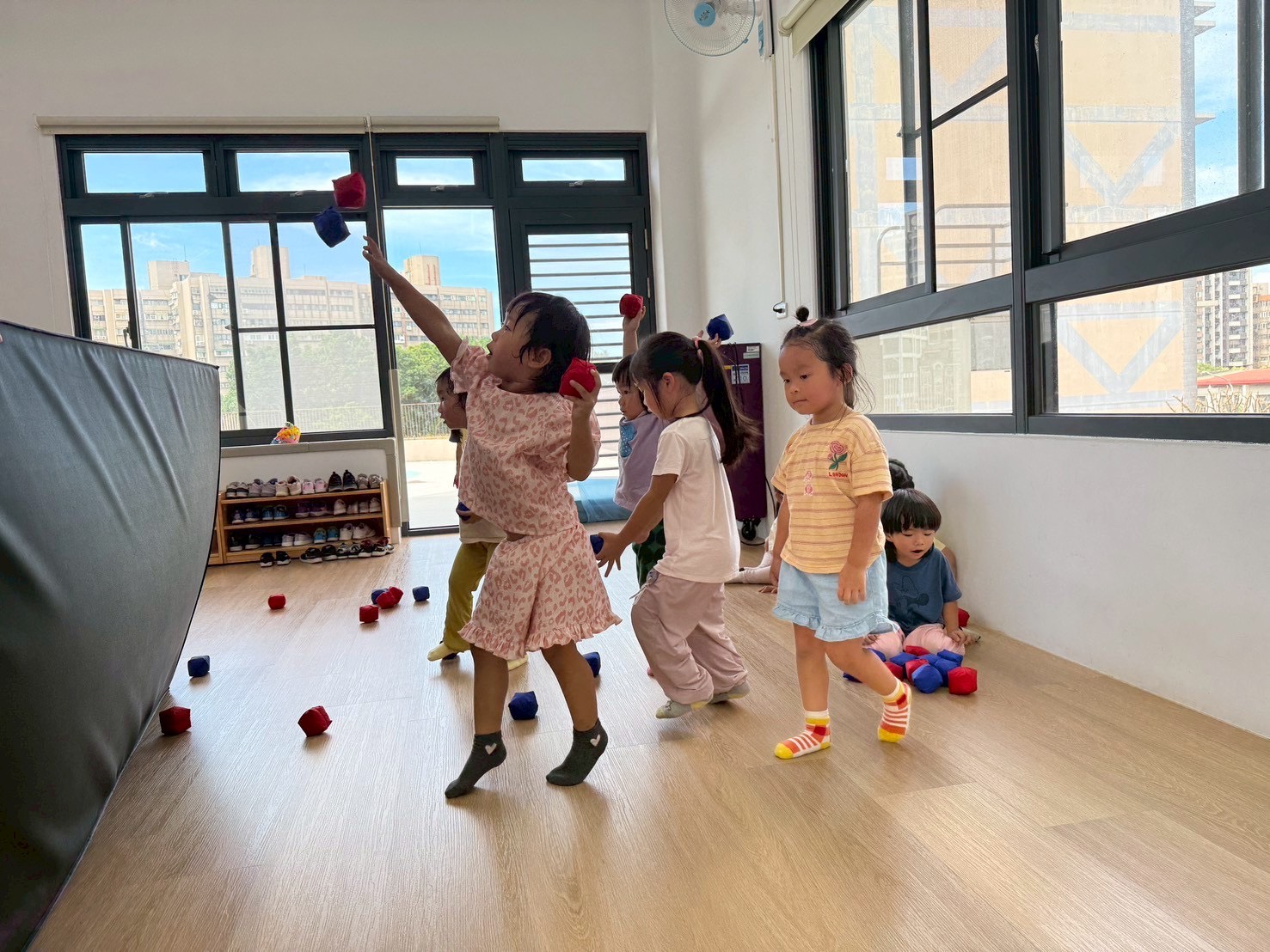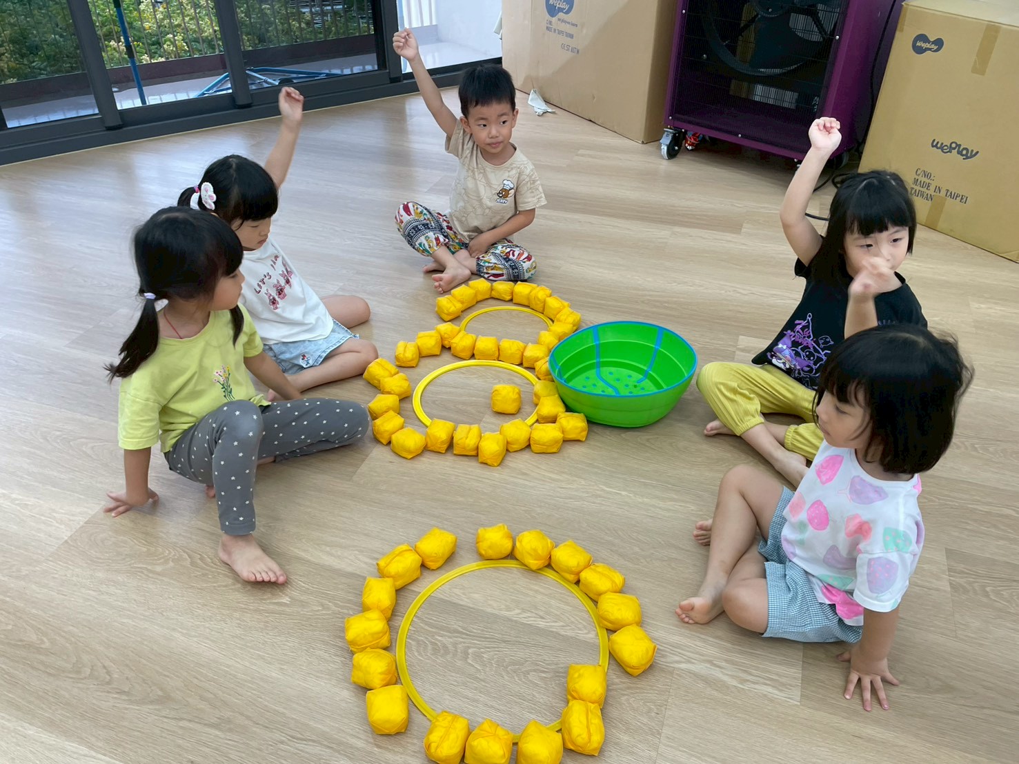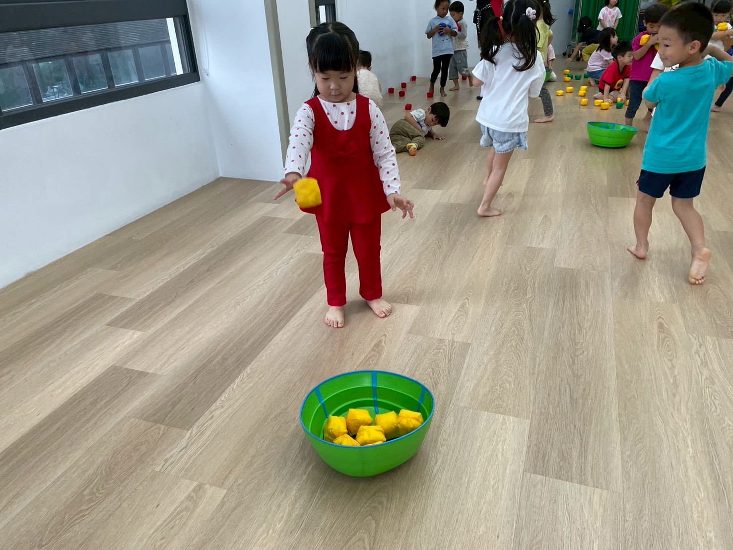 透過分區丟小布球,增強手眼協調與團隊合作,孩子們在歡樂中體驗互動與挑戰的樂趣。