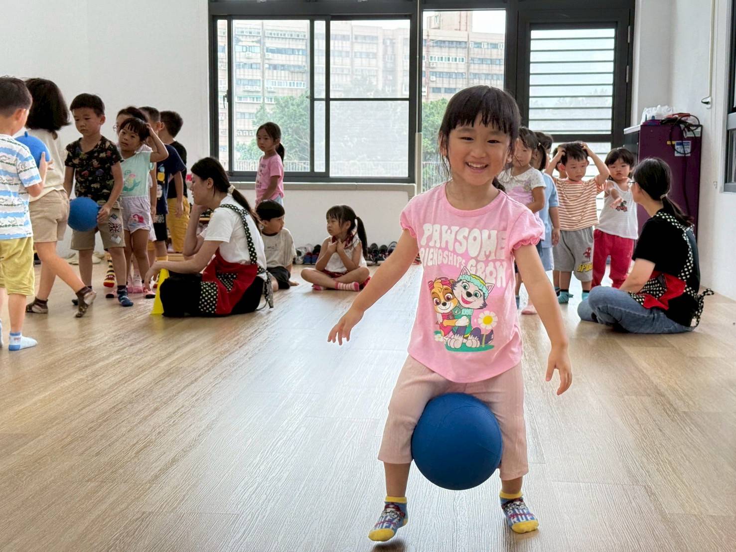 請孩子們想像大龍球是炸彈,體驗閃躲大龍球的過程,孩子們會牽手一起逃走,有的孩子看到球準備過來就會往後跑走,從中增強反應力與專注能力。