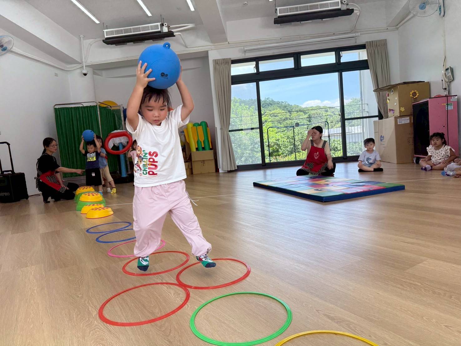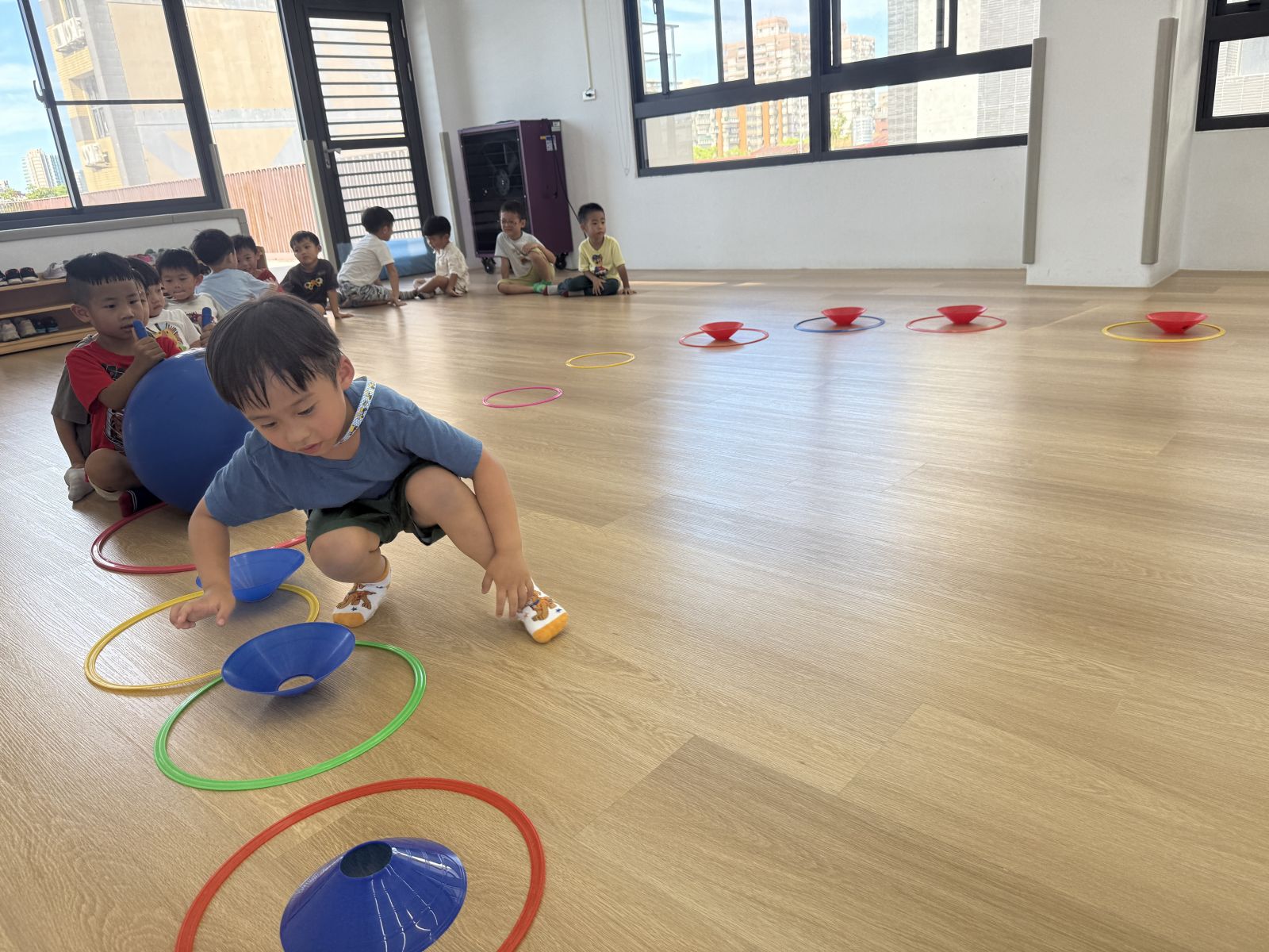 運用不同的遊戲,讓孩子展現身體不同的部位,從跳躍、坐、撿、放,最後再結合不同的器材,可以透過活動中,訓練孩子的專注力、反應力及爆發力,在動作的轉換過程中,要專心才能做對動作喔!