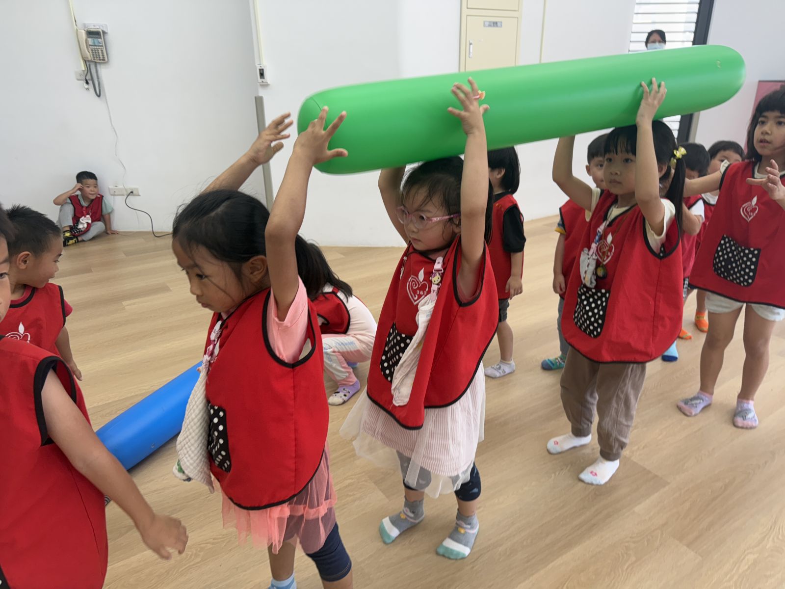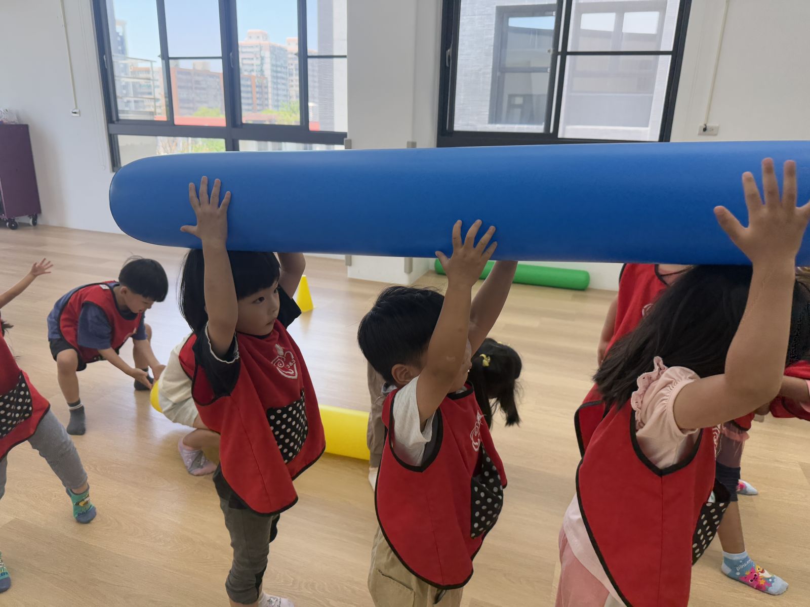 大大的棒子,要怎麼控制變得有點困難,孩子們利用抓握、平舉、合作、跳躍等方式,去和棒子做朋友,透過合作遊戲更加熟悉空氣棒的特性,除了增加團隊默契外,也提升孩子的反應力、協調性及合作能力喔!