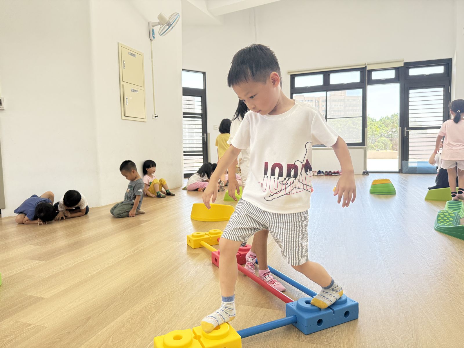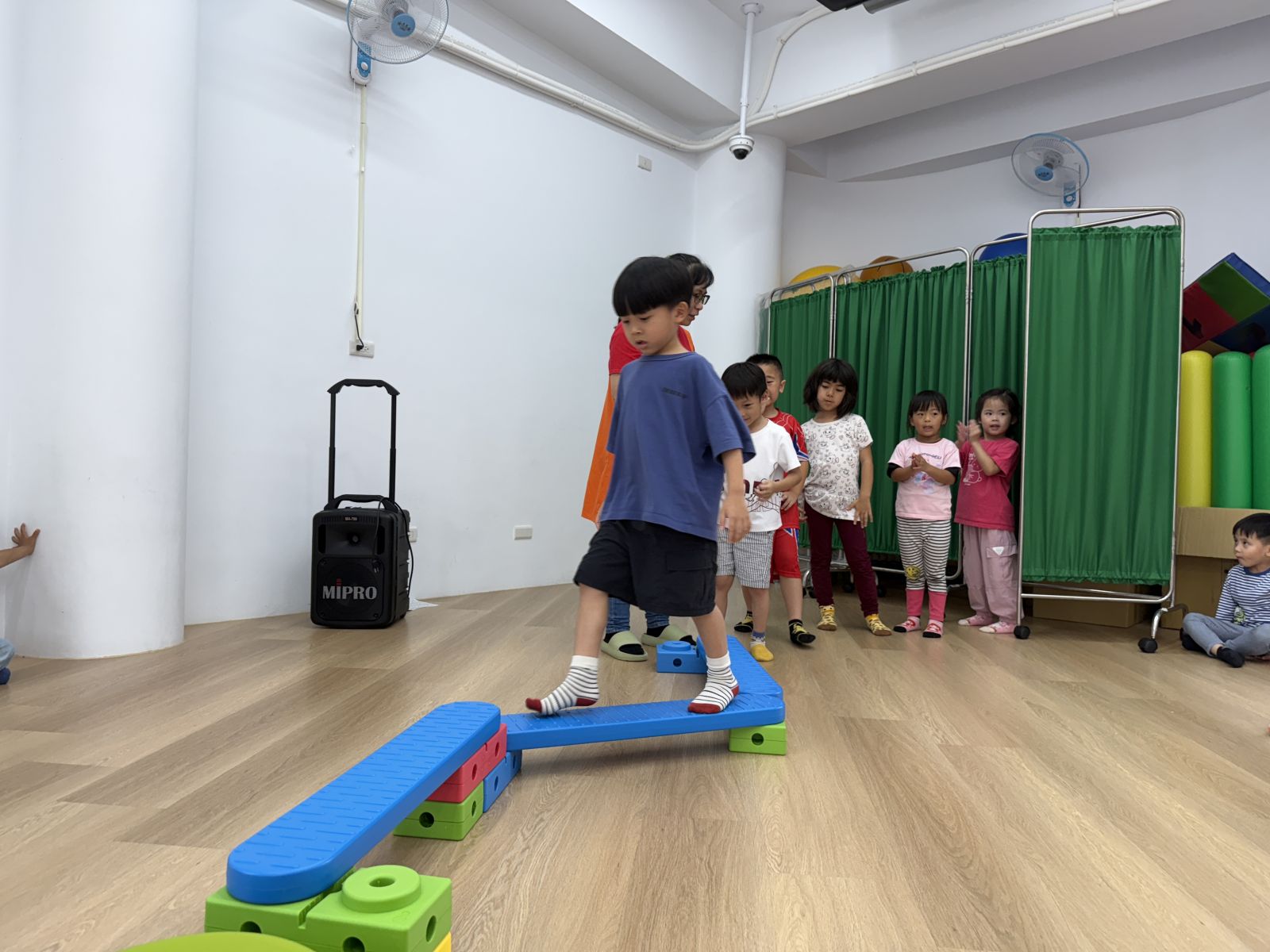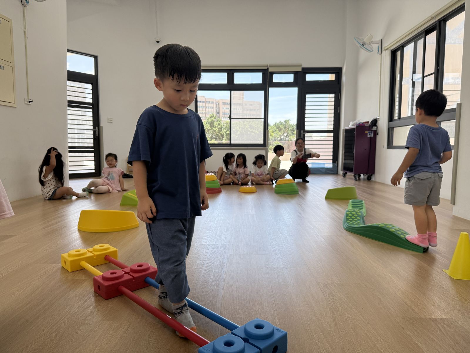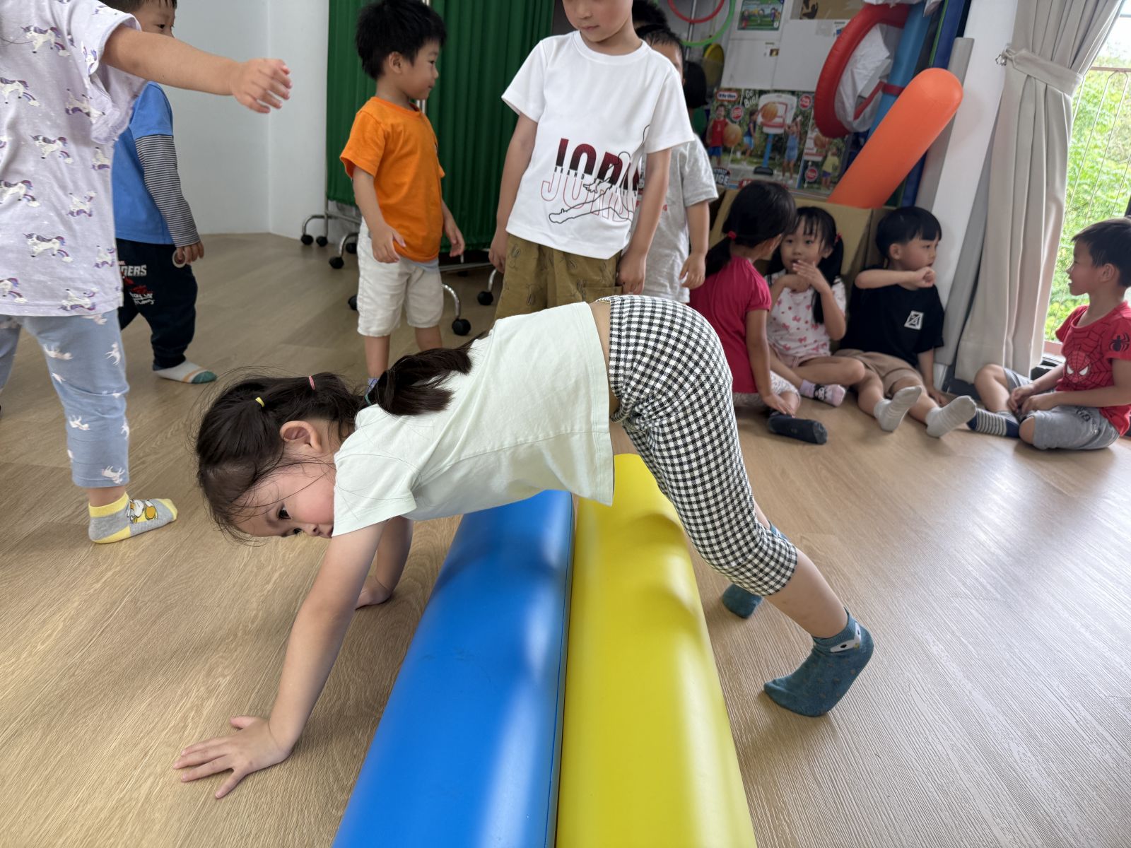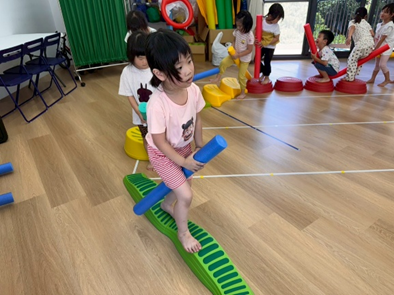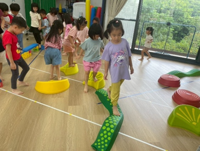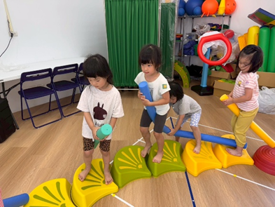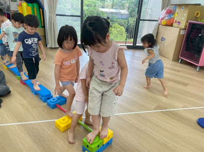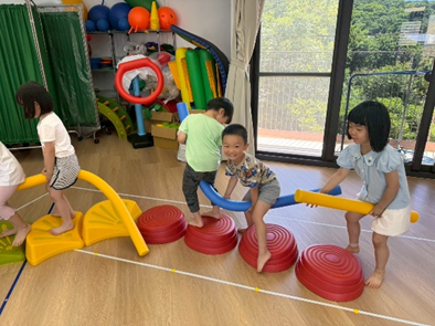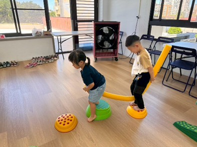運用不同器材,讓孩子們複習平衡、跨越及跳躍等動作能力,多數孩子能掌握器材的基本操作,並勇於嘗試挑戰,在平衡活動中,部分孩子仍容易出現重心不穩、搖晃的情形,需持續練習與引導。