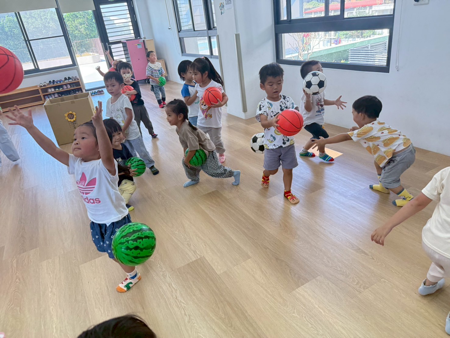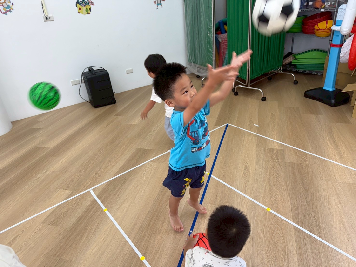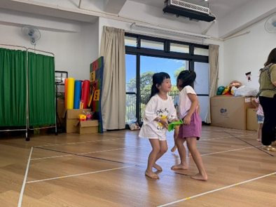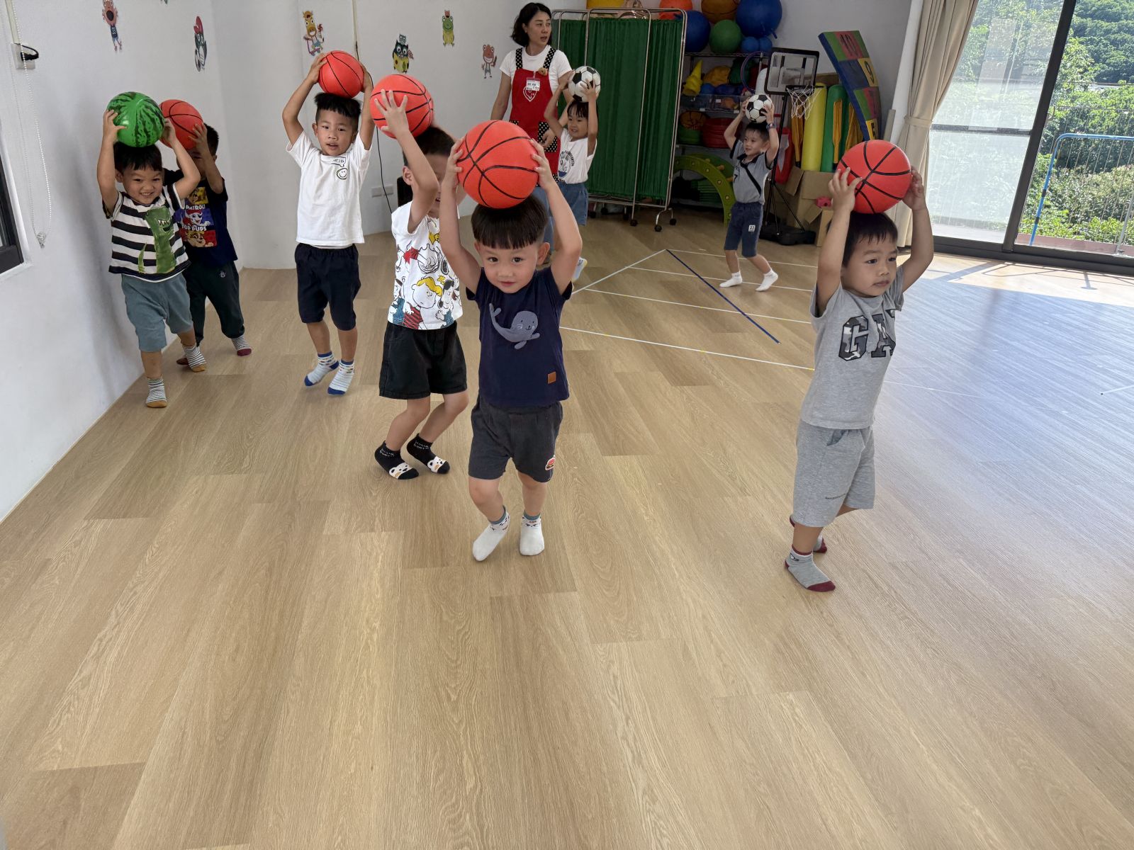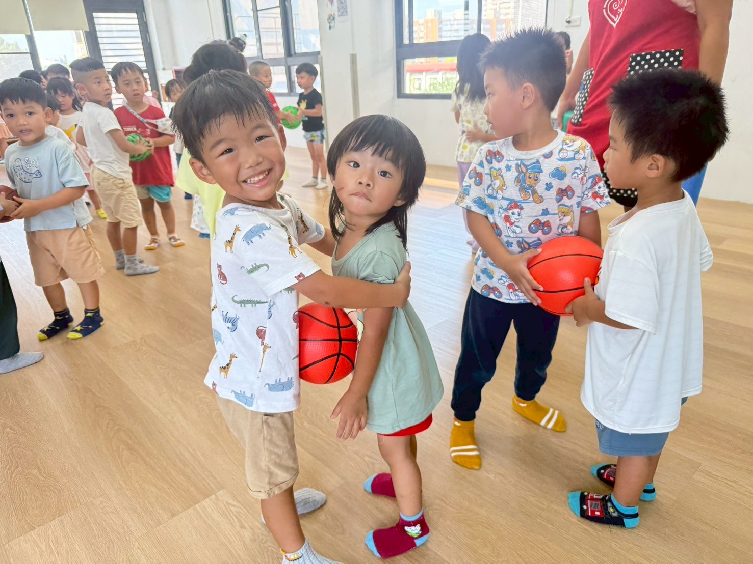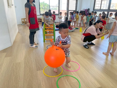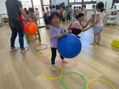 引導孩子先熟悉籃球,再透過拋接訓練手眼協調,待孩子熟悉後練習運球並進行投籃,在活動中也加入團隊合作,兩兩一組,藉由音樂讓孩子將球放到指定位置上。