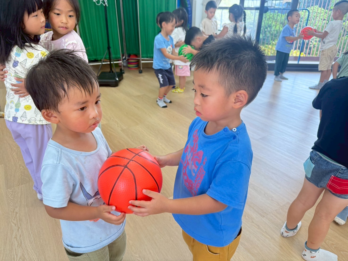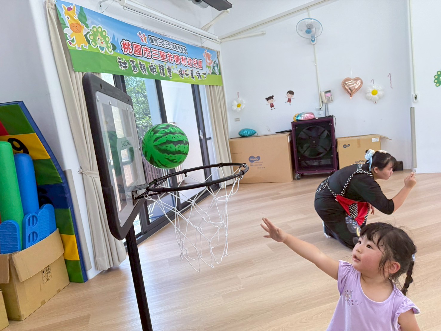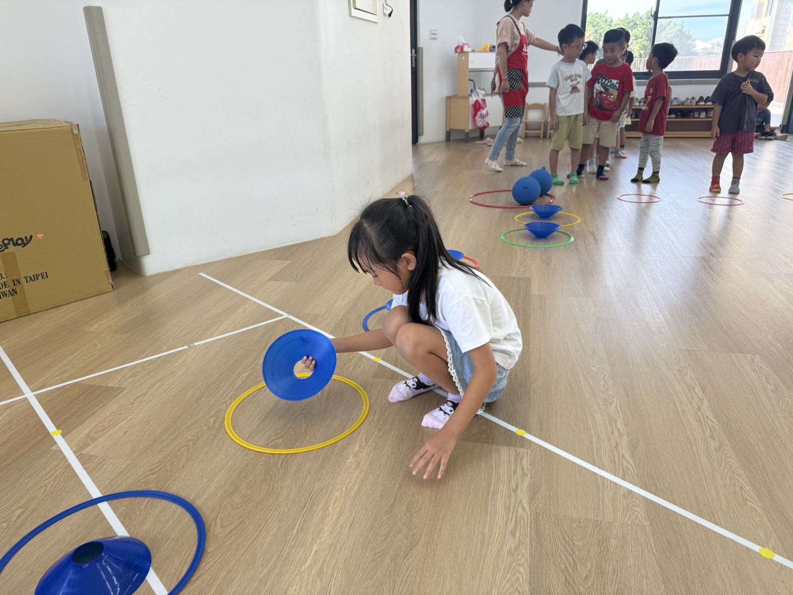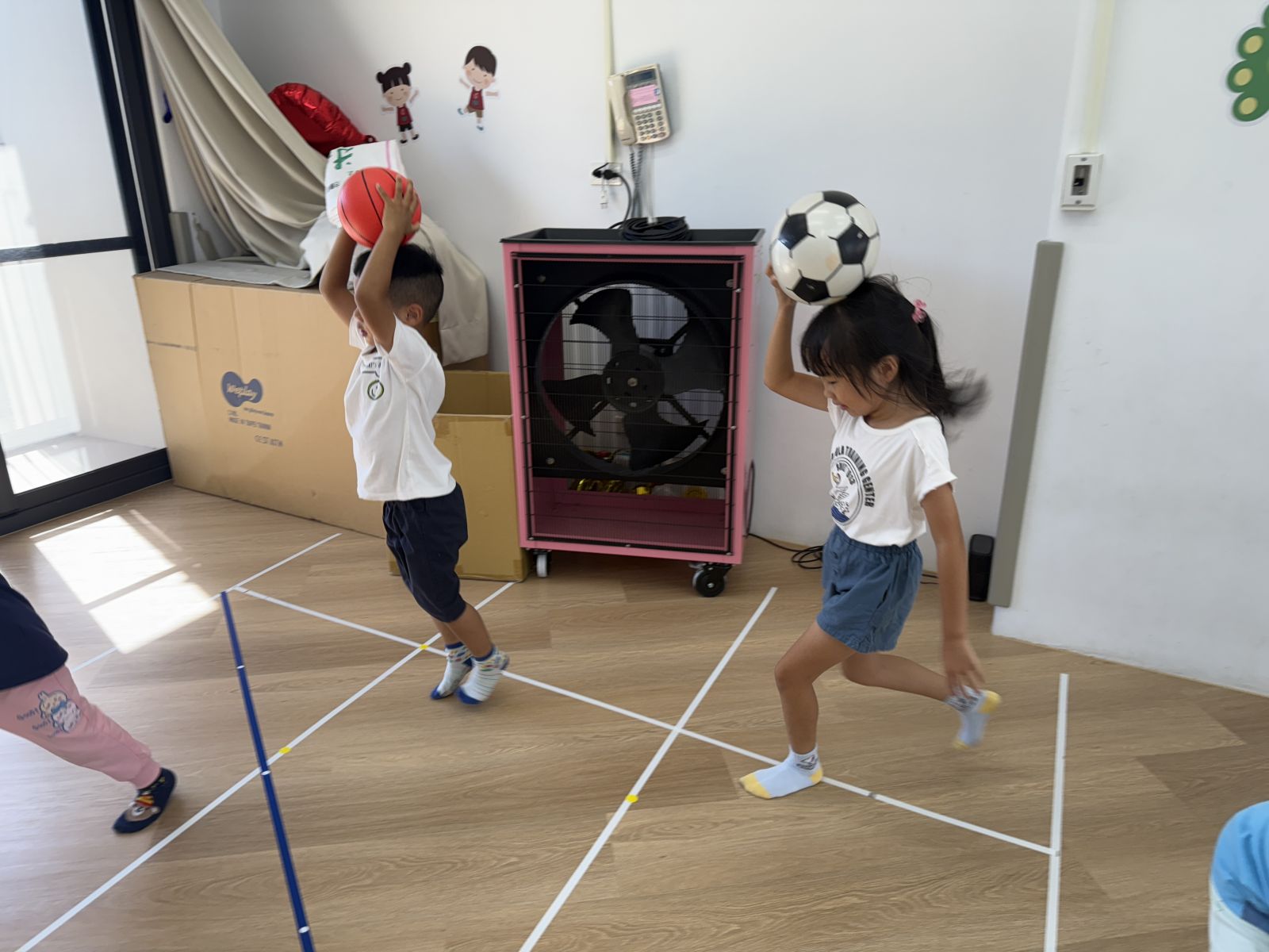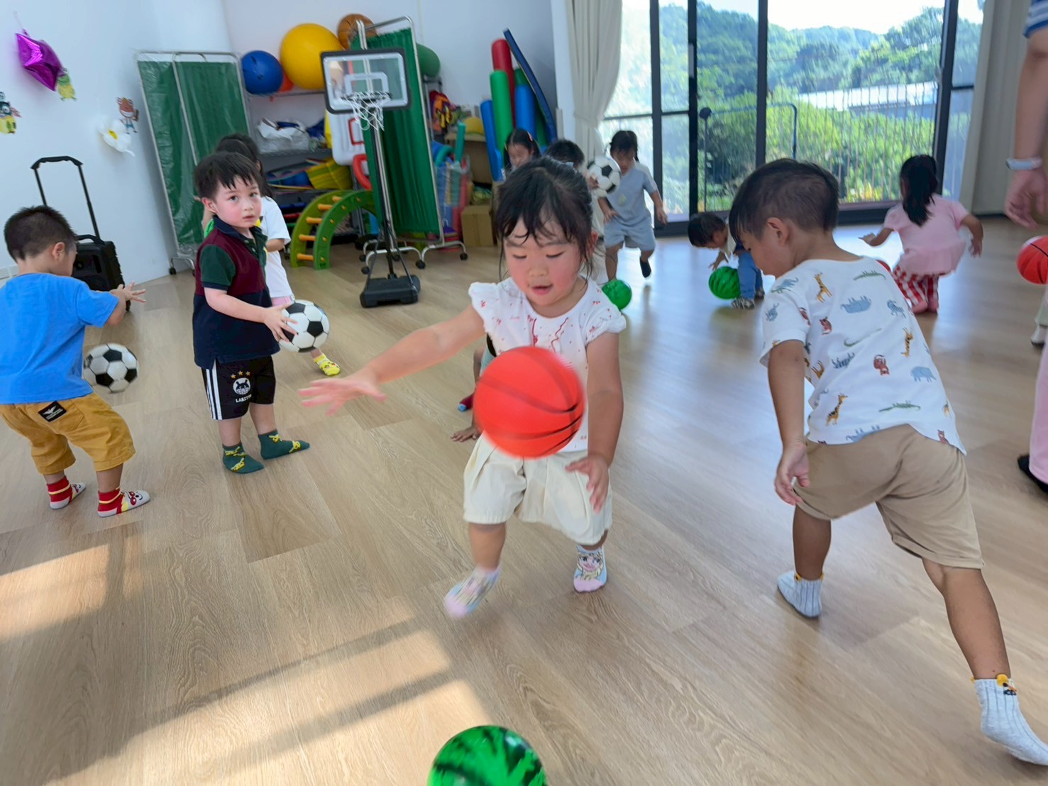 引導孩子先熟悉籃球,再透過拋接訓練手眼協調,待孩子熟悉後練習運球並進行投籃,在活動中也加入團隊合作,兩兩一組,藉由音樂讓孩子將球放到指定位置上。
