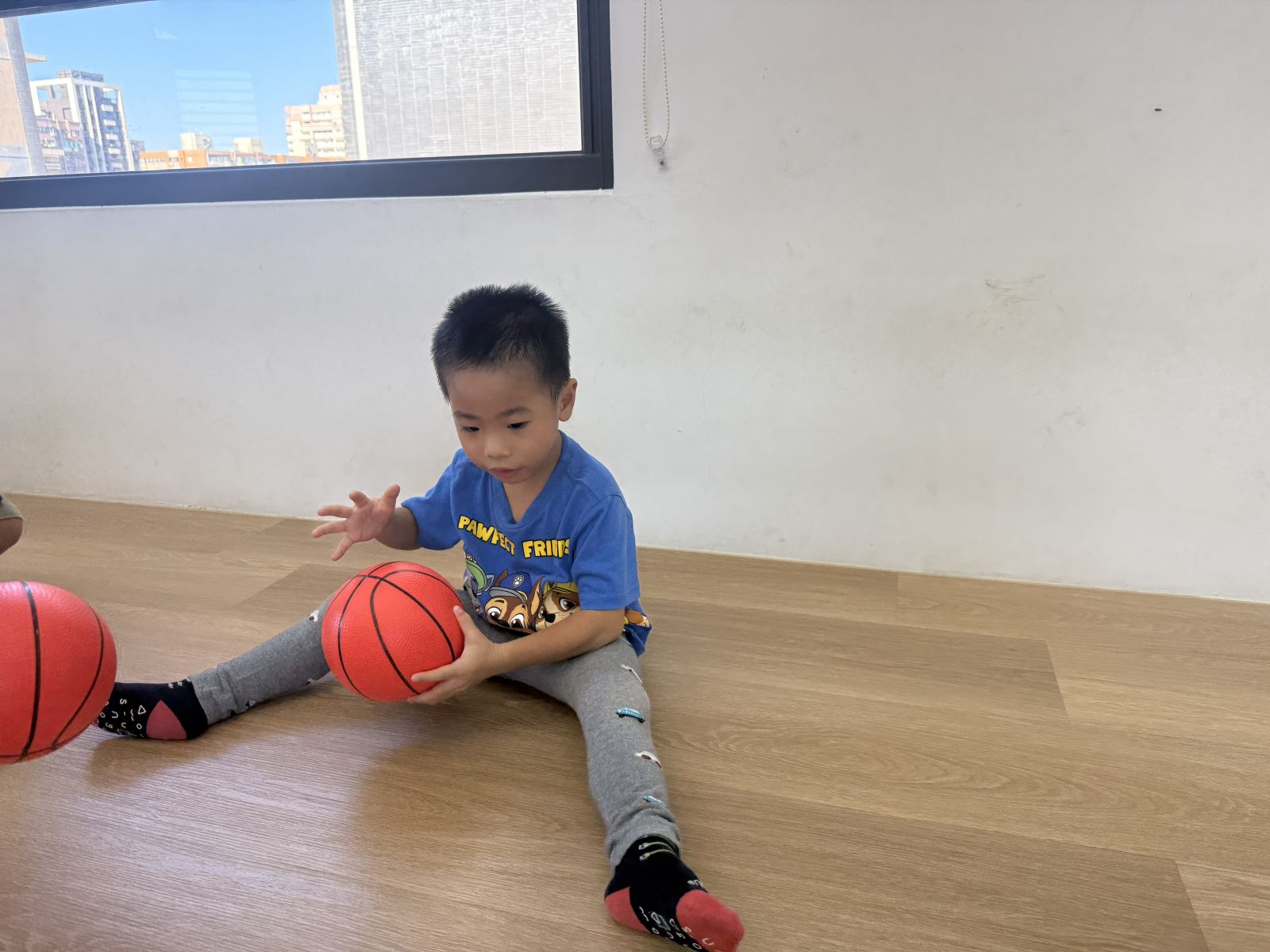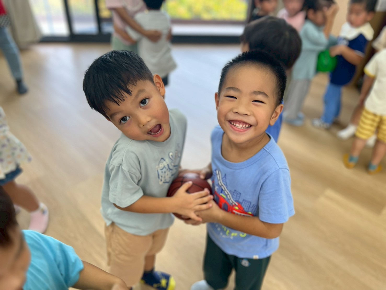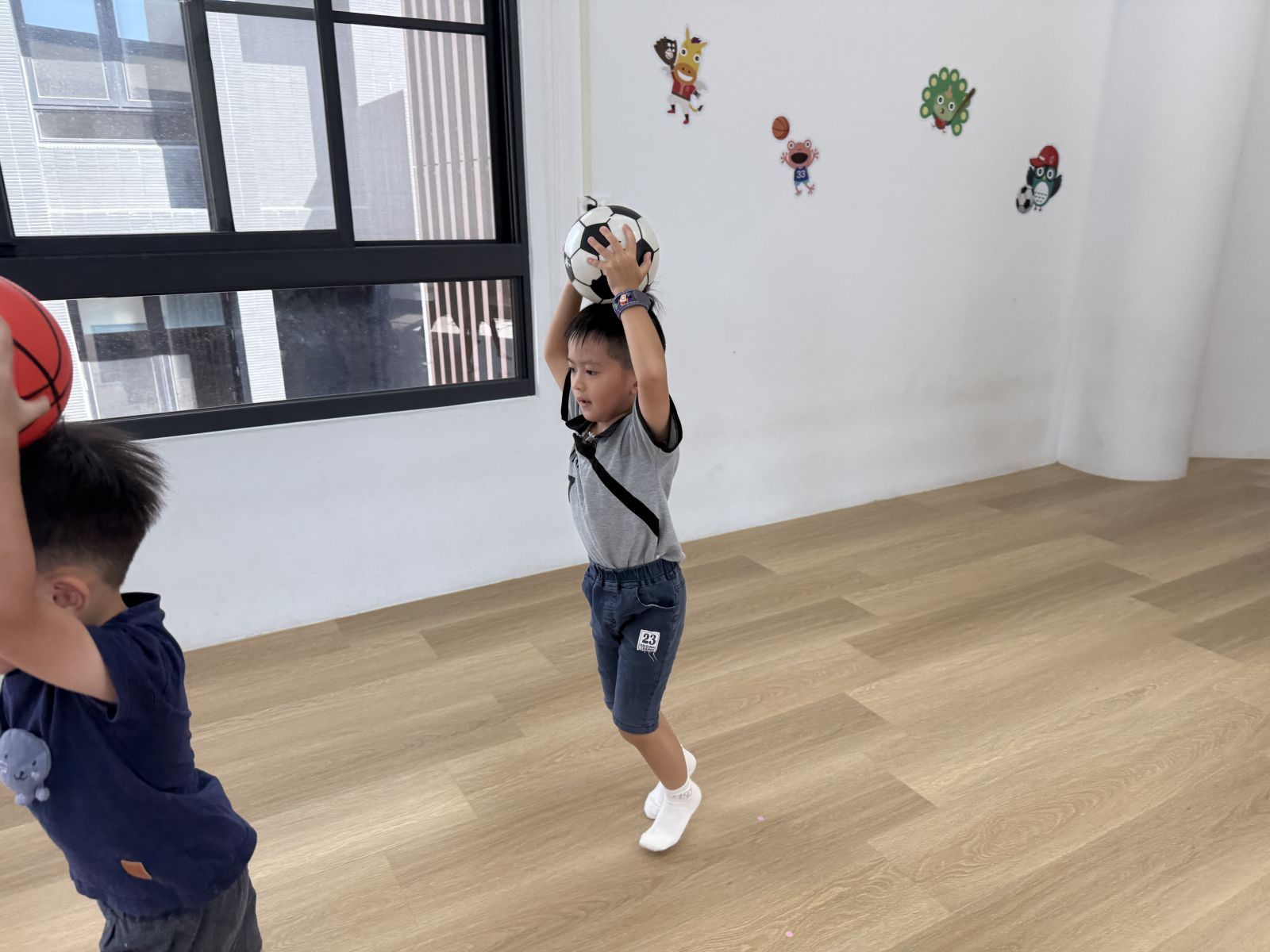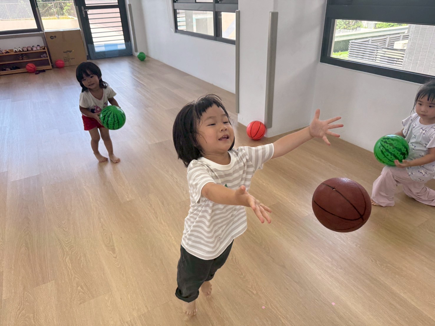 引導孩子先熟悉籃球,再透過拋接訓練手眼協調,待孩子熟悉後練習運球並進行投籃,在活動中也加入團隊合作,兩兩一組,藉由音樂讓孩子將球放到指定位置上。
