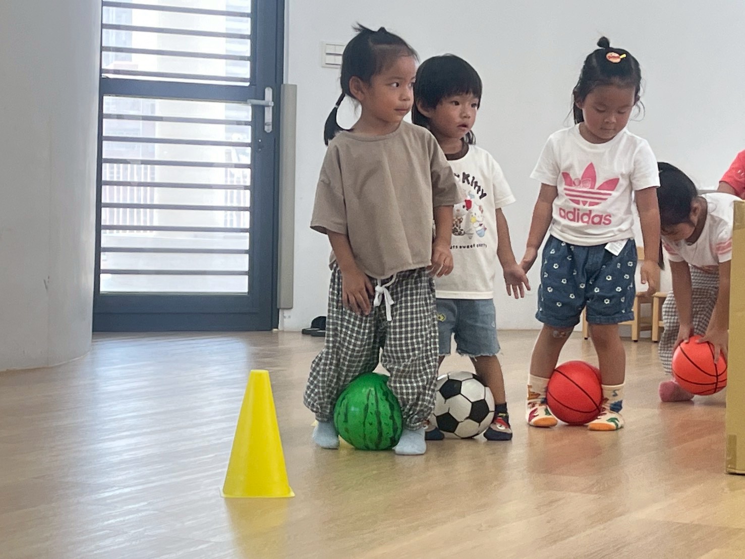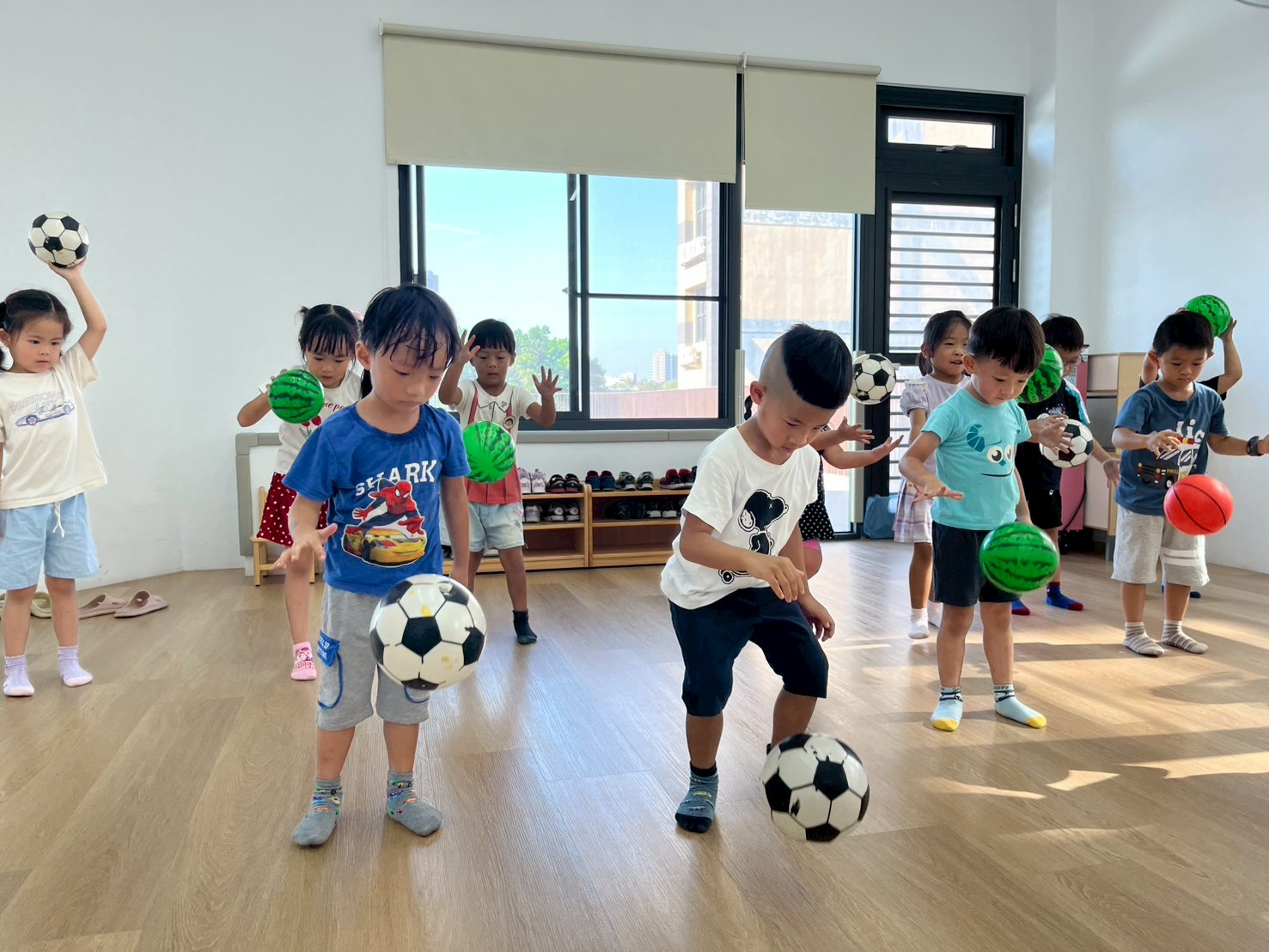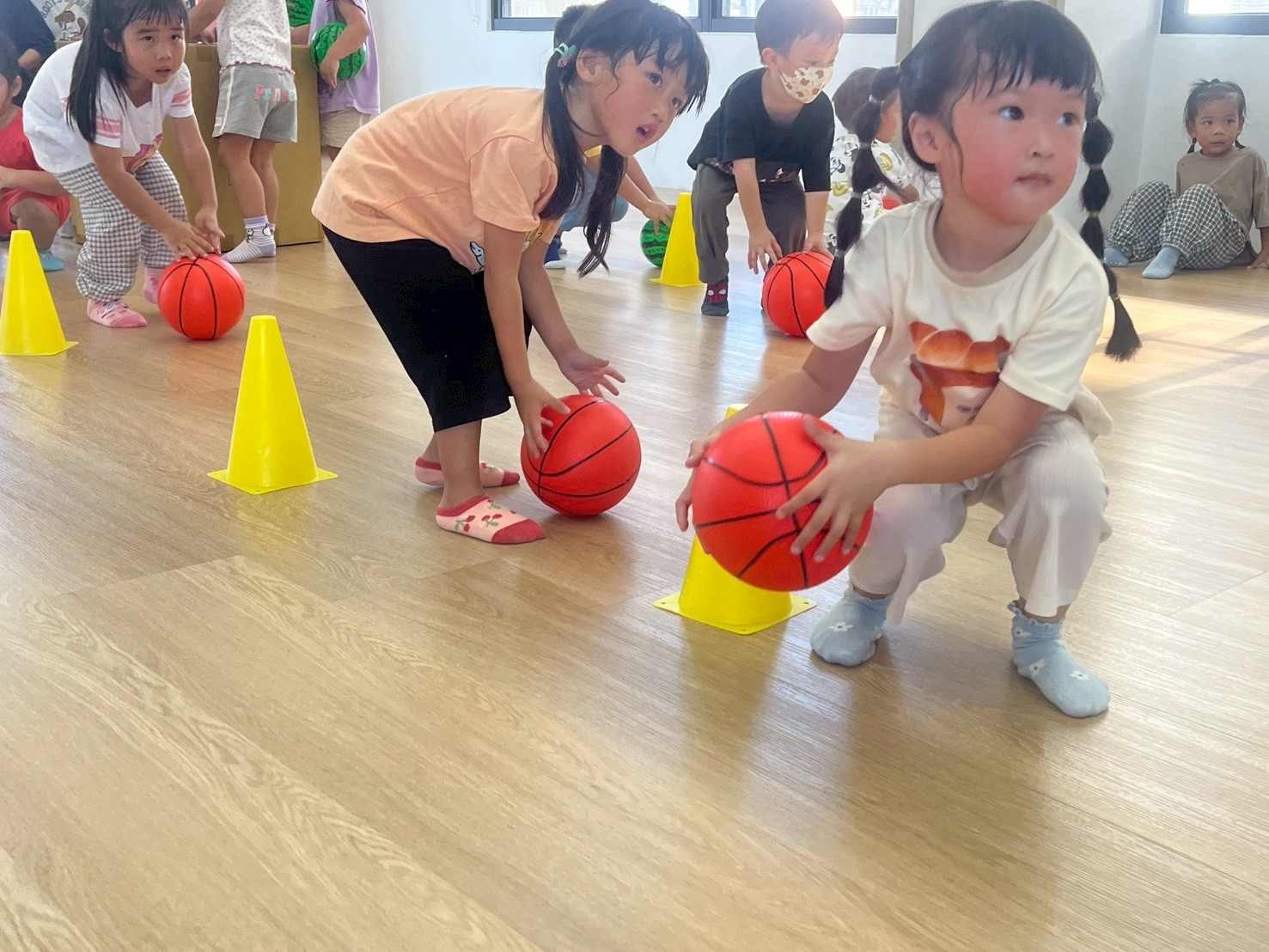 透過不同的動作,讓孩子們運用不同的姿勢去完成指令,例如:原地拍球、用力拋球並接住、帶球走路、丟球、踢球等,在不同的動作之下,要運用的部位及力量都不同,更考驗孩子的手眼協調能力,才能有效的帶著球進行活動。