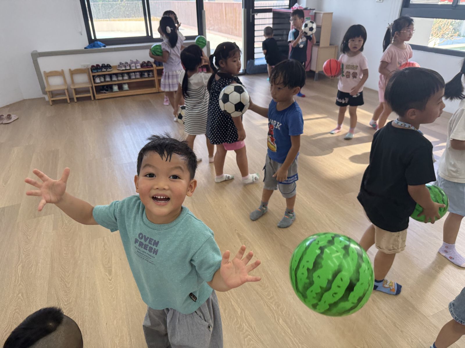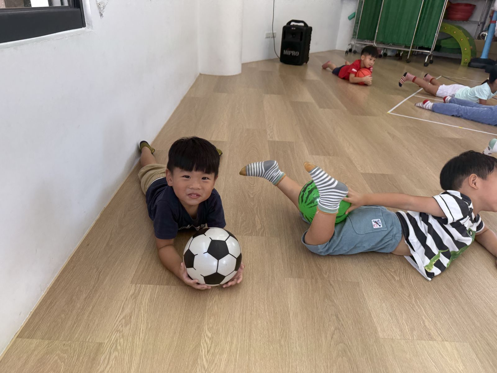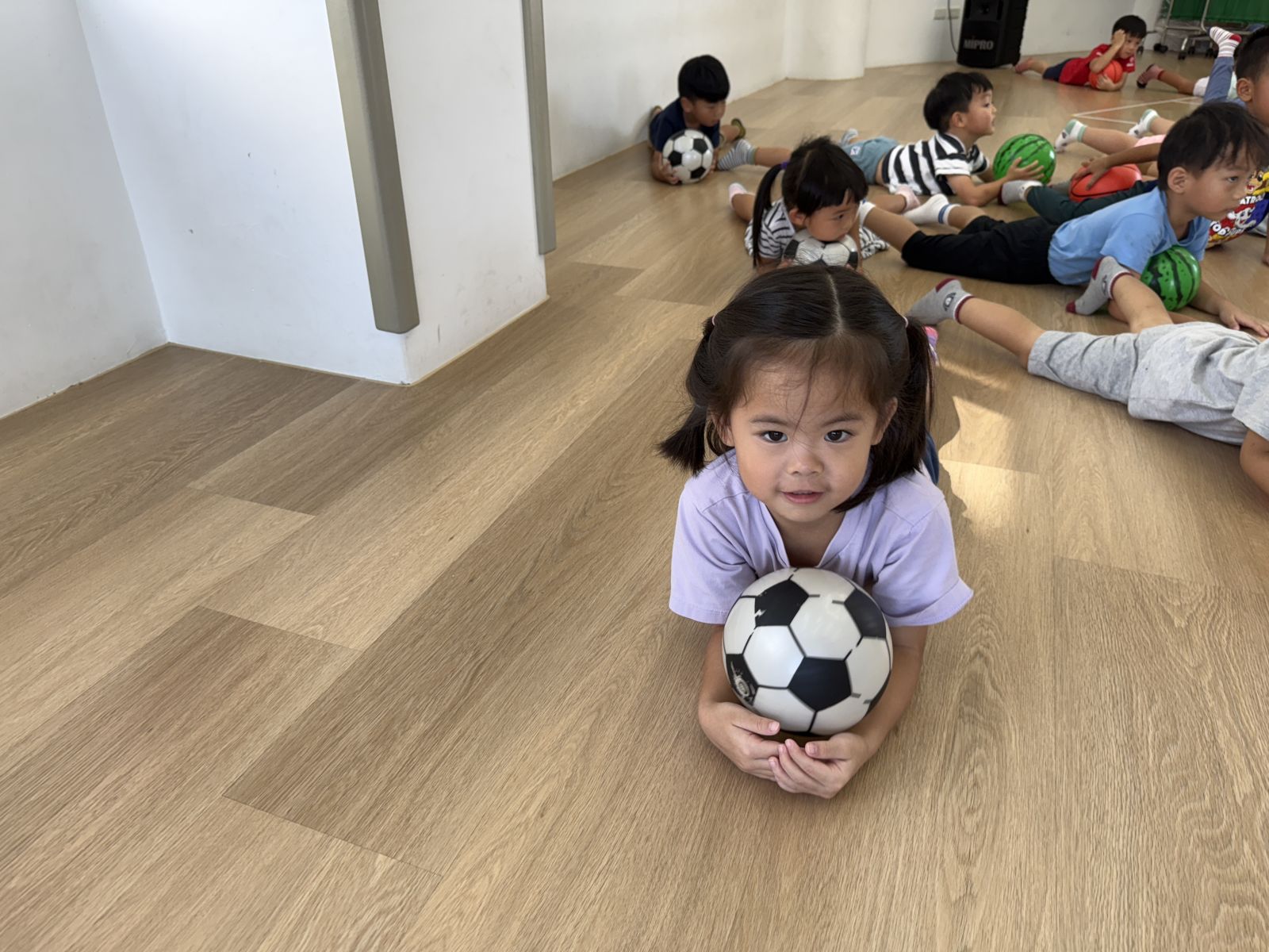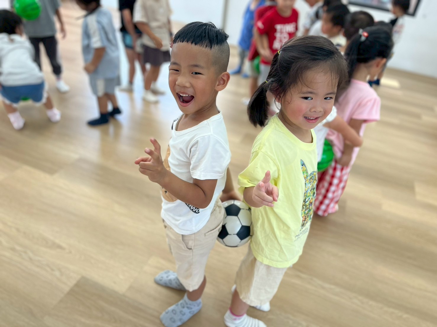 透過不同的動作,讓孩子們運用不同的姿勢去完成指令,例如:原地拍球、用力拋球並接住、帶球走路、丟球、踢球等,在不同的動作之下,要運用的部位及力量都不同,更考驗孩子的手眼協調能力,才能有效的帶著球進行活動。