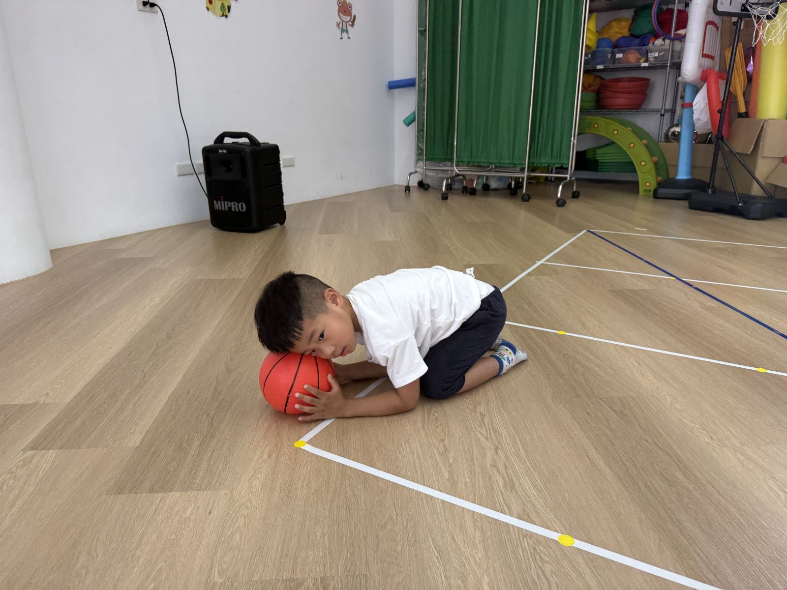 透過行進中雙腳夾球、球放頭上行走平衡木,訓練身體的協調性,到達定點將球投入籃框提升至球感,以及訓練手眼協調能。