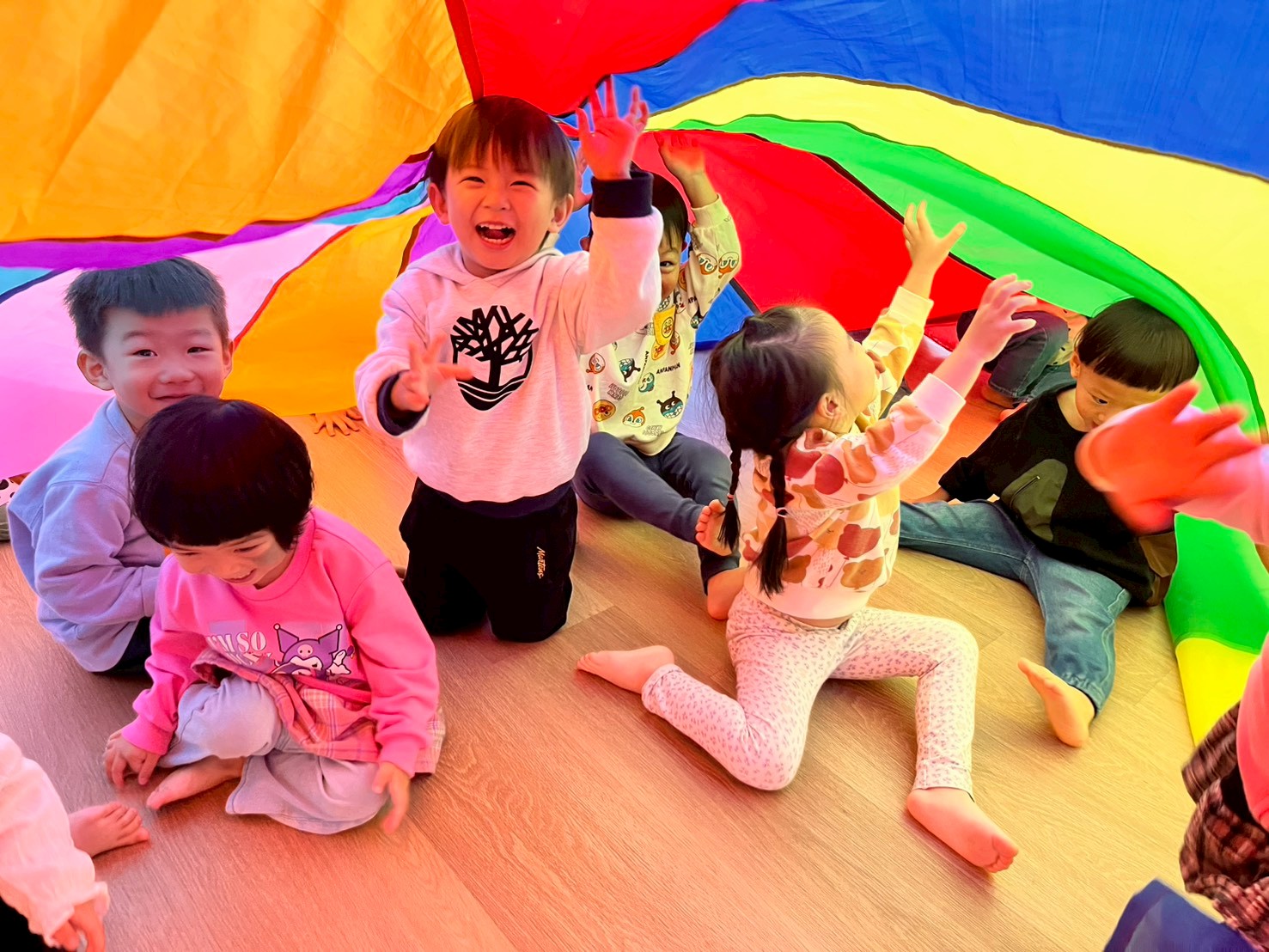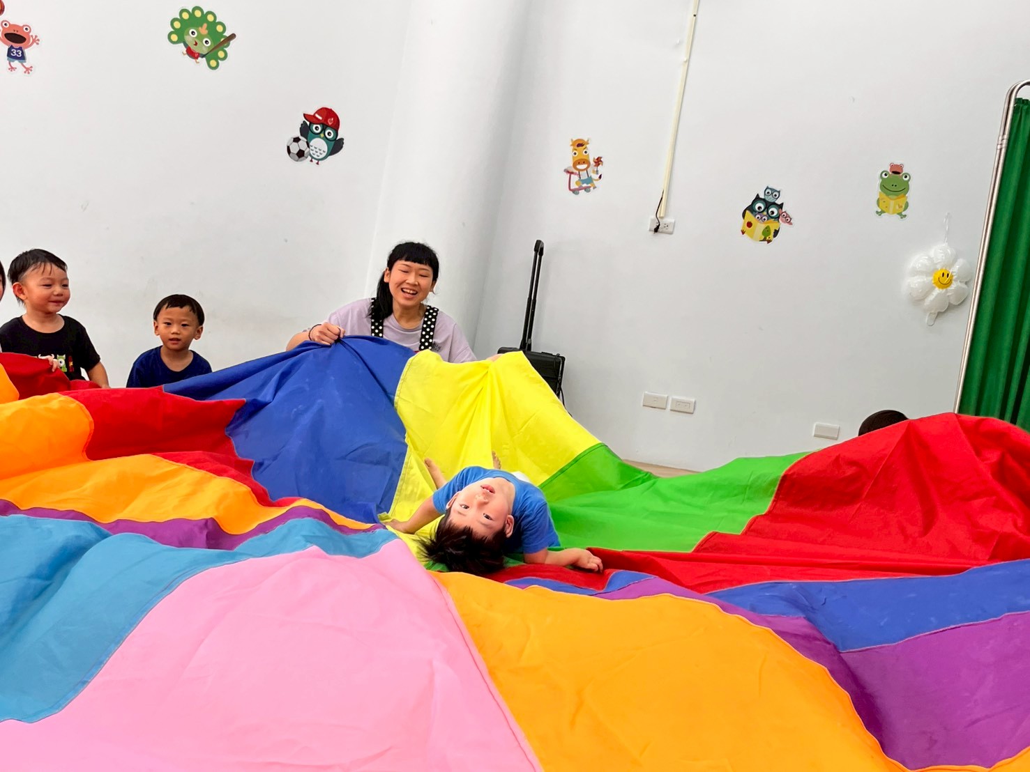 我們運用繽紛的氣球傘,創造出像「小木屋」一樣的空間,讓孩子們一起拉起傘布,再輕輕放下,形成一個可以躲藏的可愛小屋。孩子們可以鑽進氣球傘裡面,感受被包圍的安全感,體驗與同伴一起合作、躲藏與等待的樂趣。這樣的活動不僅能引發孩子的想像力,也促進肢體協調與團隊合作的能力。