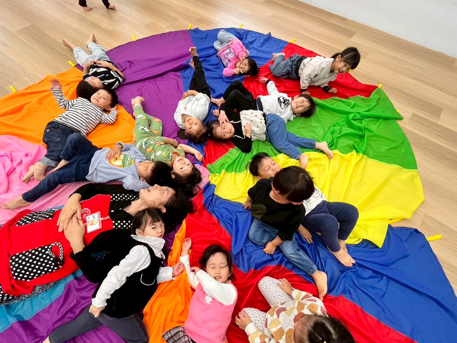 透過不同的指令,讓孩子們去使用氣球傘做不同的的動作,在過程中可訓練孩子的手部靈活動及合作能力,並且運用不同的動作,增加孩子的反應力。