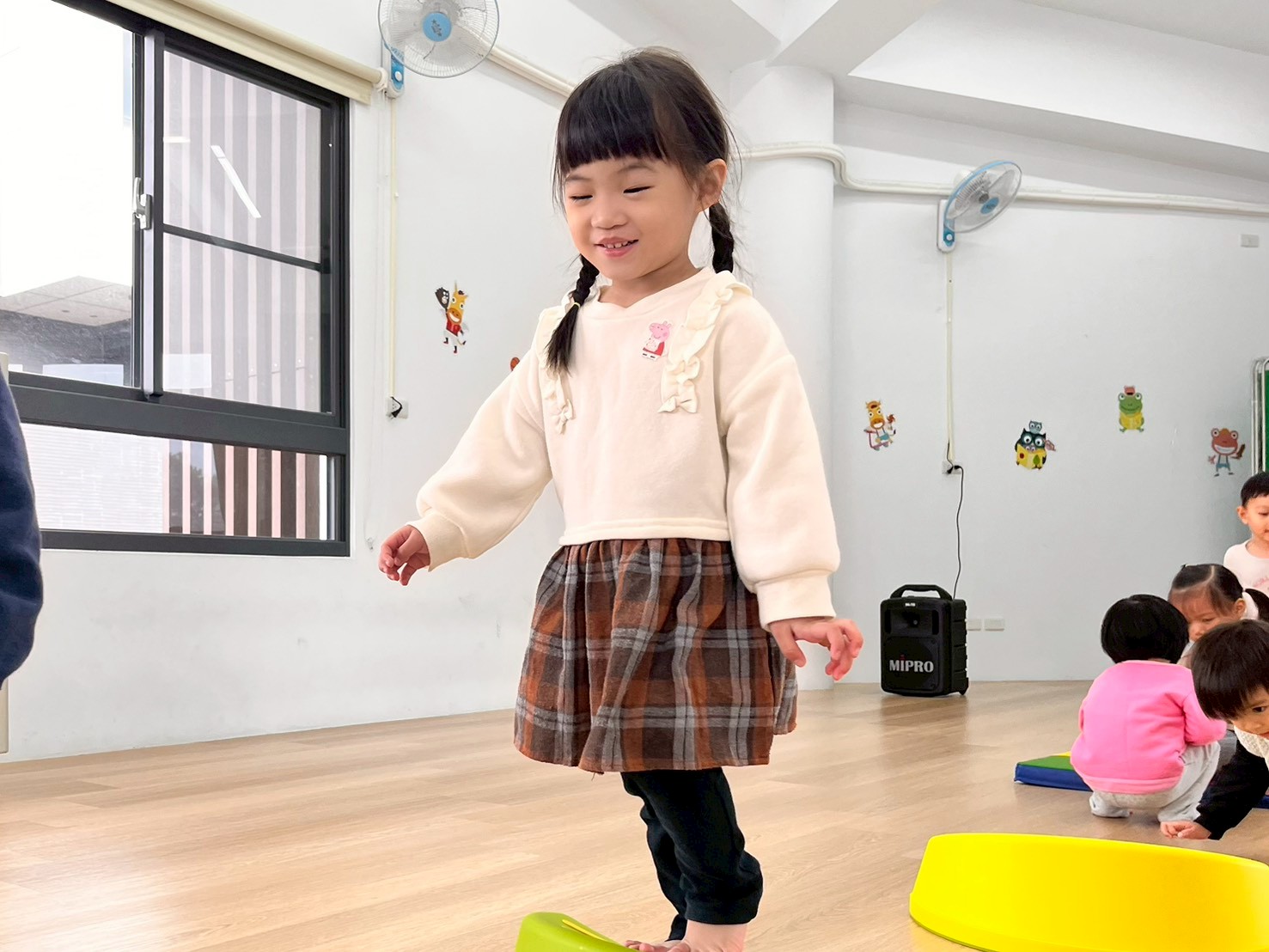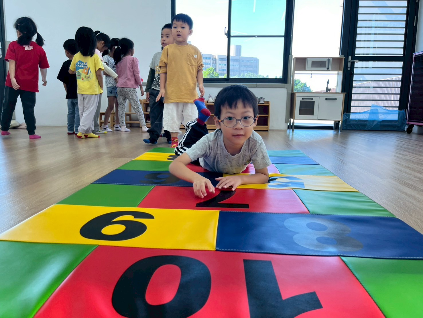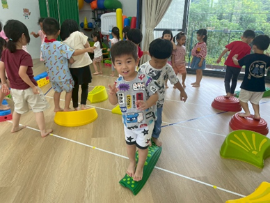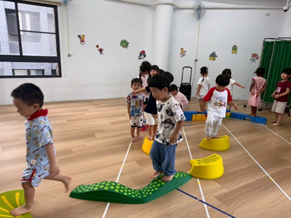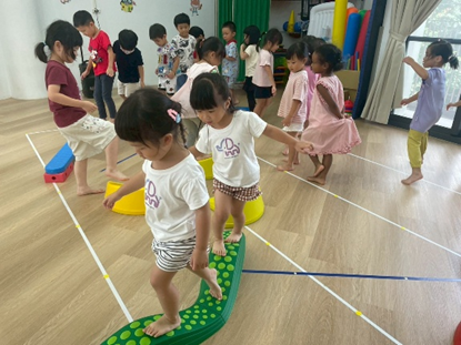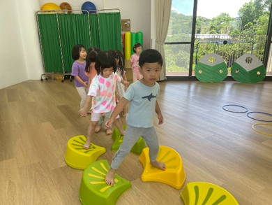 孩子透過跳躍、平衡和跨越彩色石頭,鍛煉身體協調性與平衡感,增強運動能力。