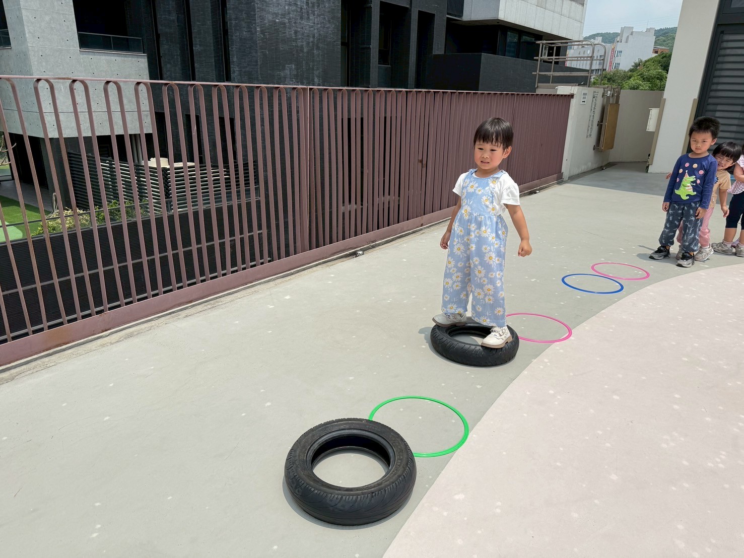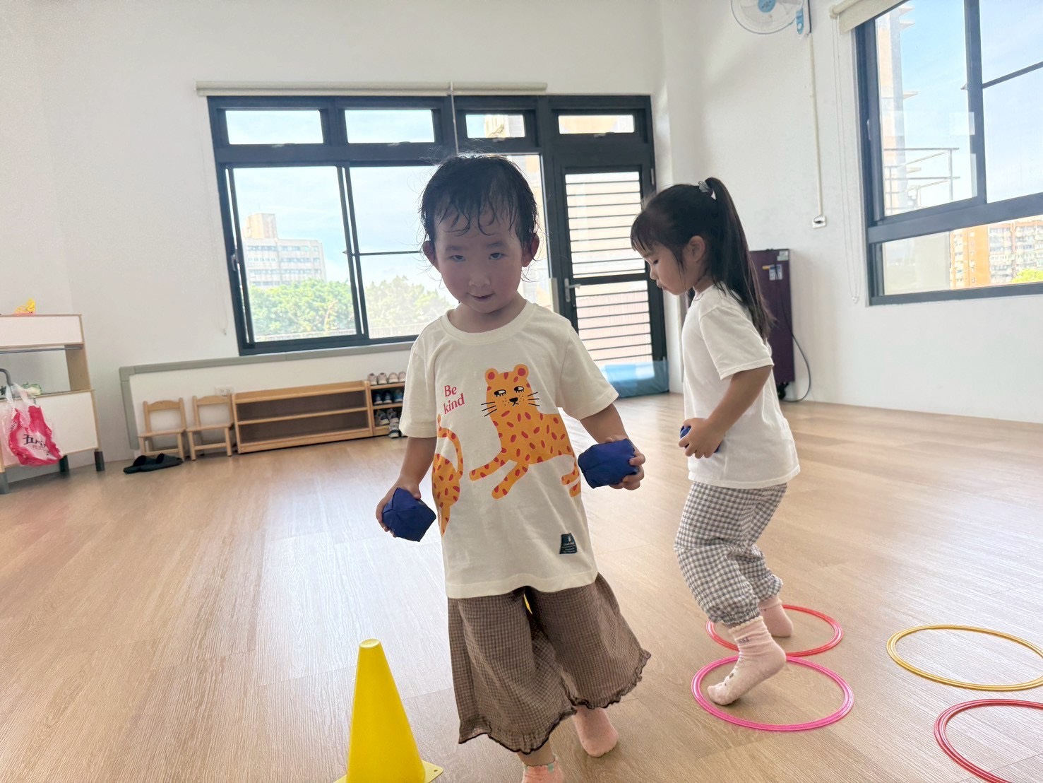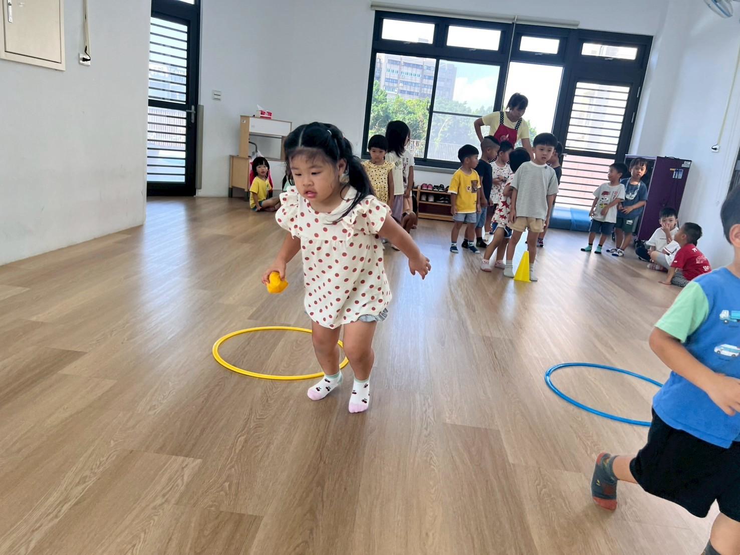 孩子們手持沙布球專注投擲到圓圈中,猶如玩套圈圈般充滿樂趣。投擲後,他踩著圈環小心移動,雙腳有節奏地協調前進,鍛煉平衡與肢體協調能力,臉上洋溢專注與自信的神情。