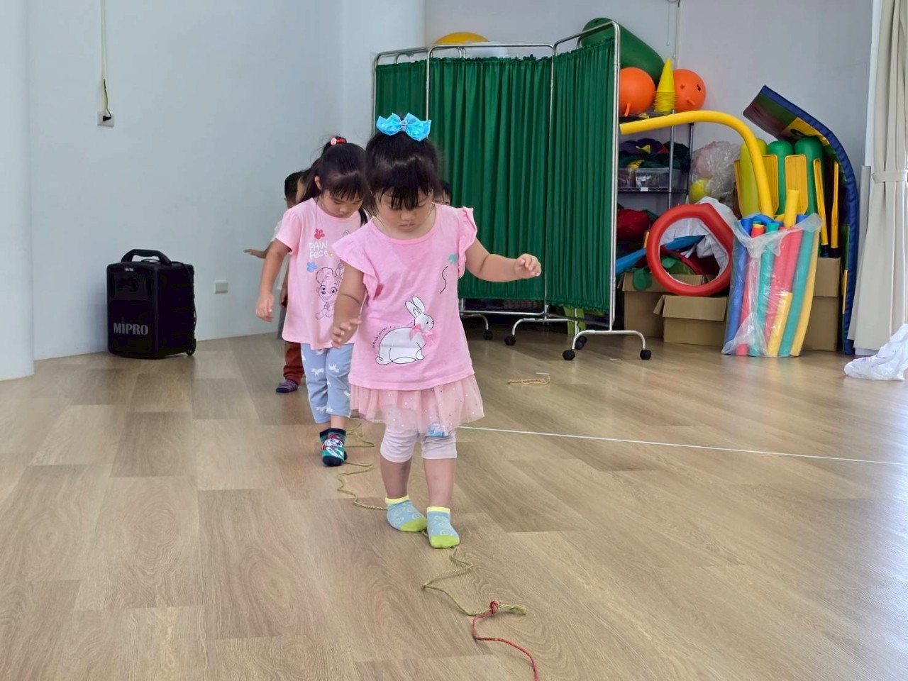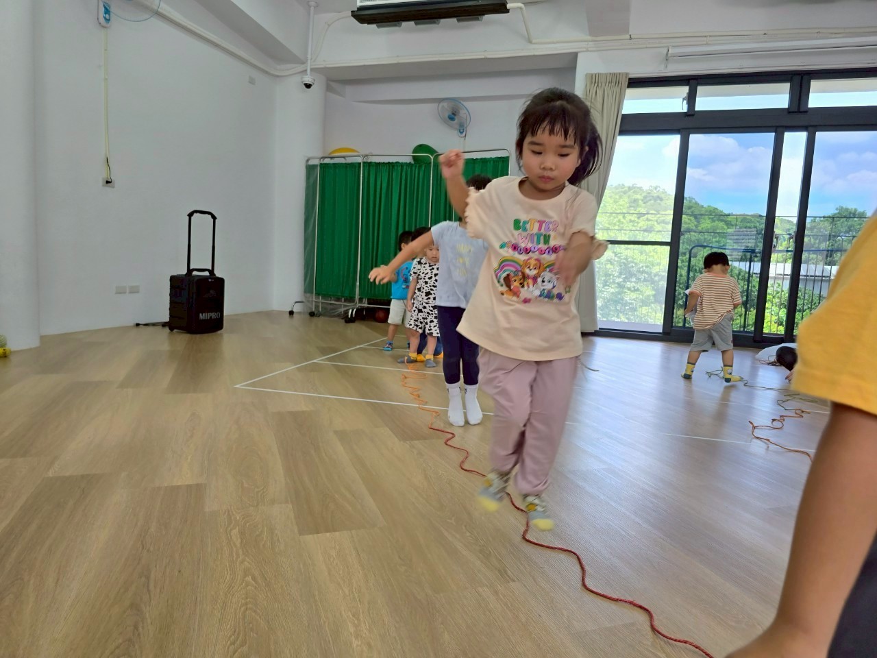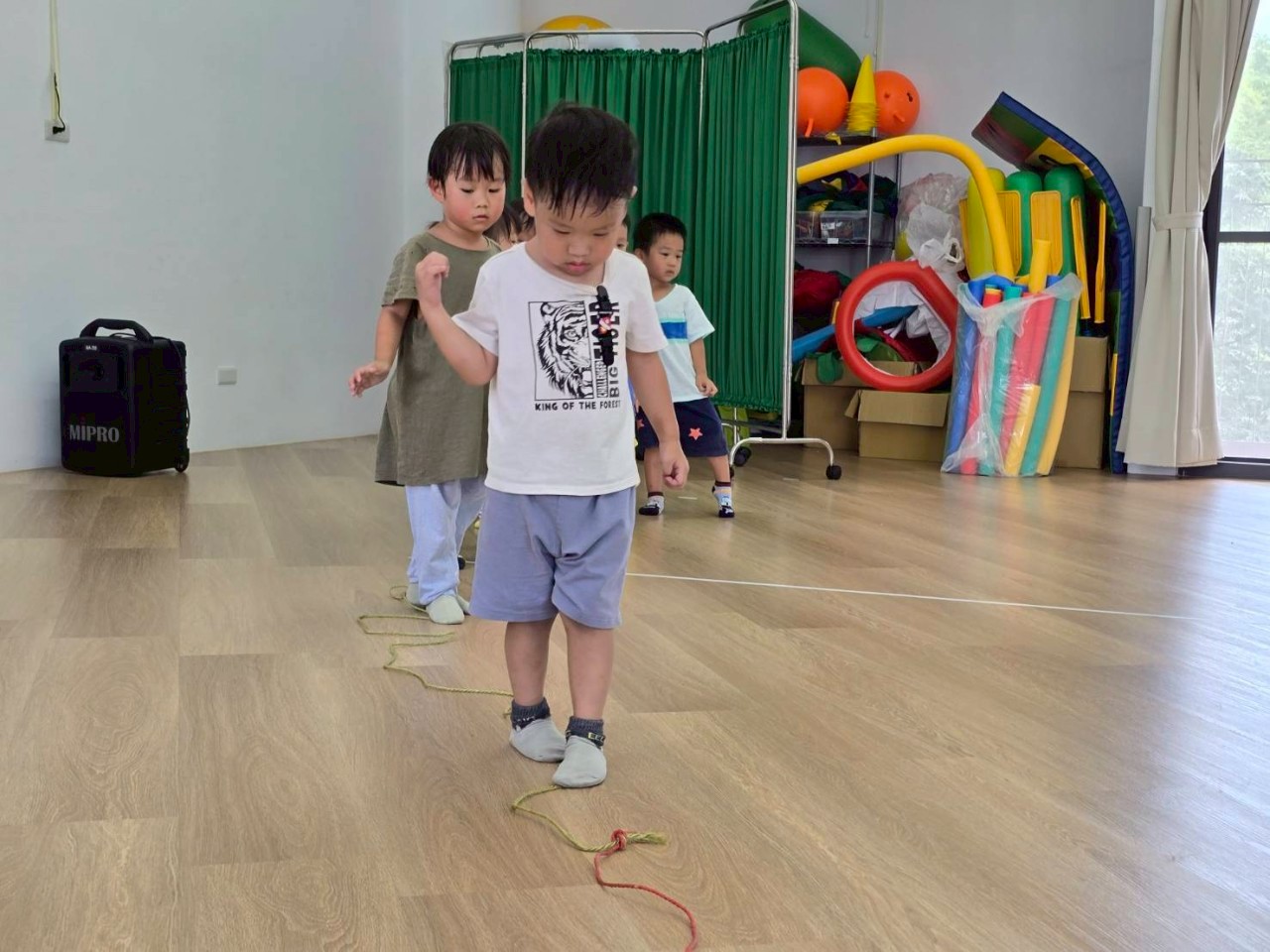 要怎麼去適應繩子的狀態,孩子們透過不同的動作,去與繩子進行遊戲,跳躍、爬、走等,訓練孩子的敏捷力及協調性。
