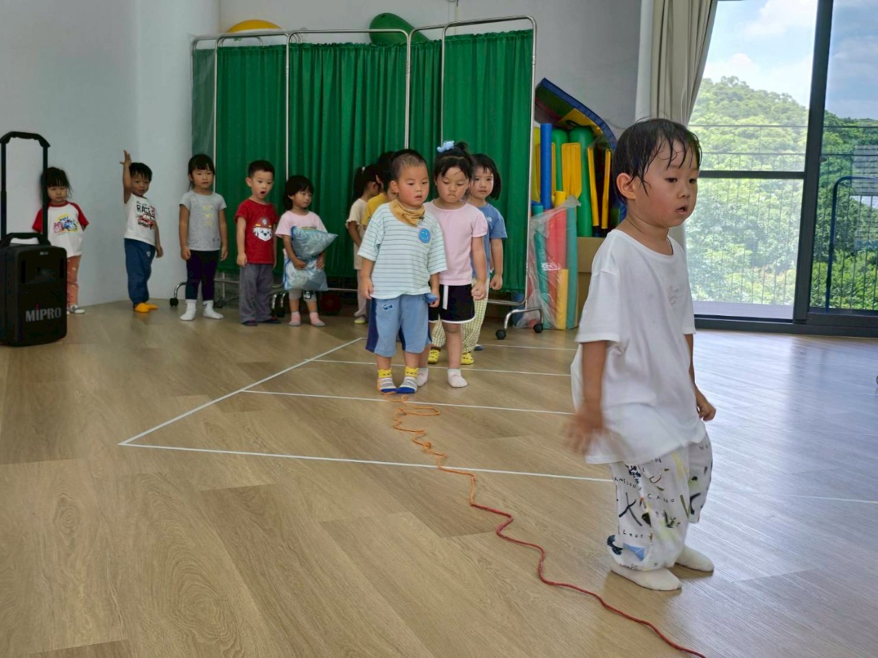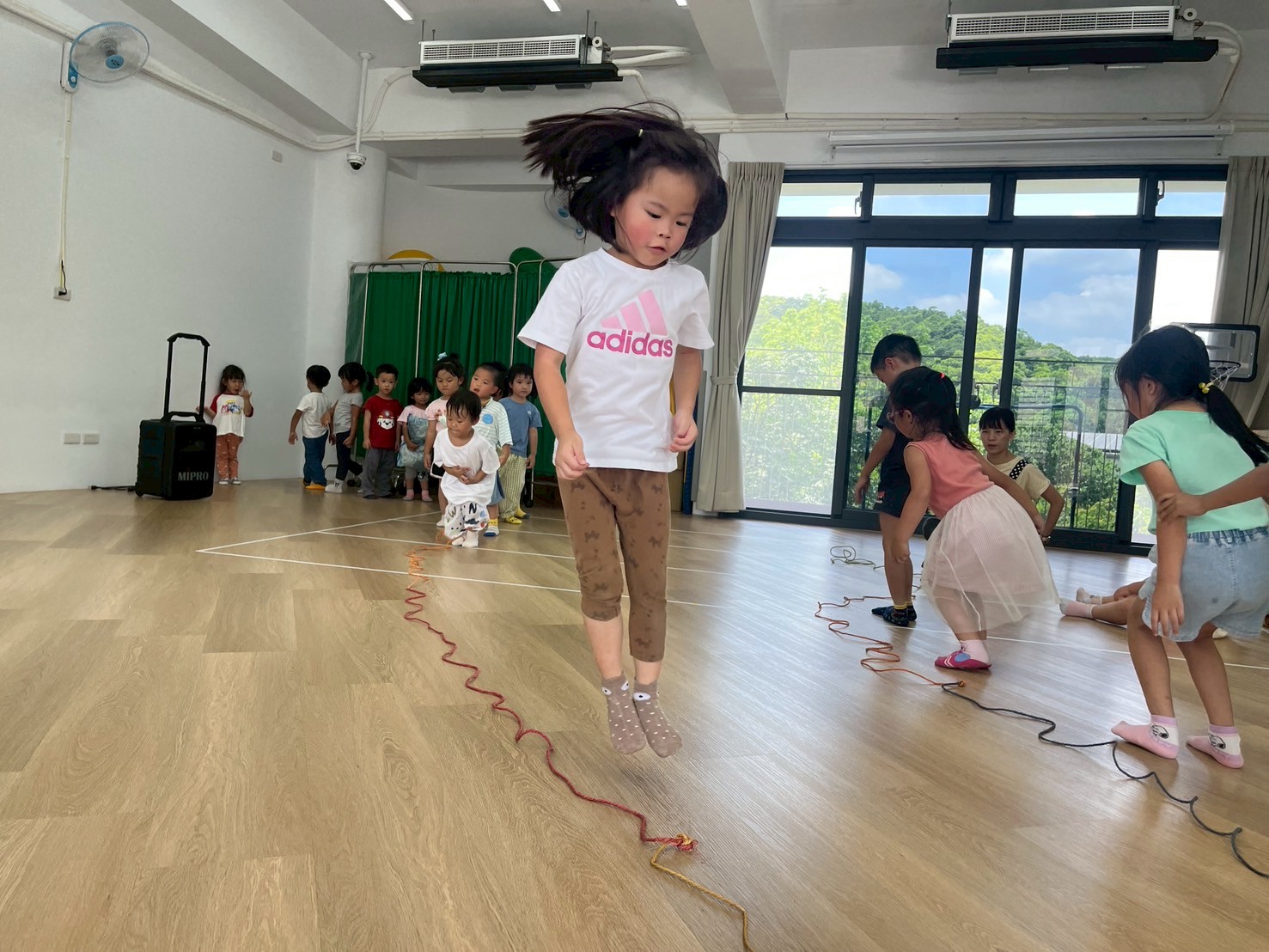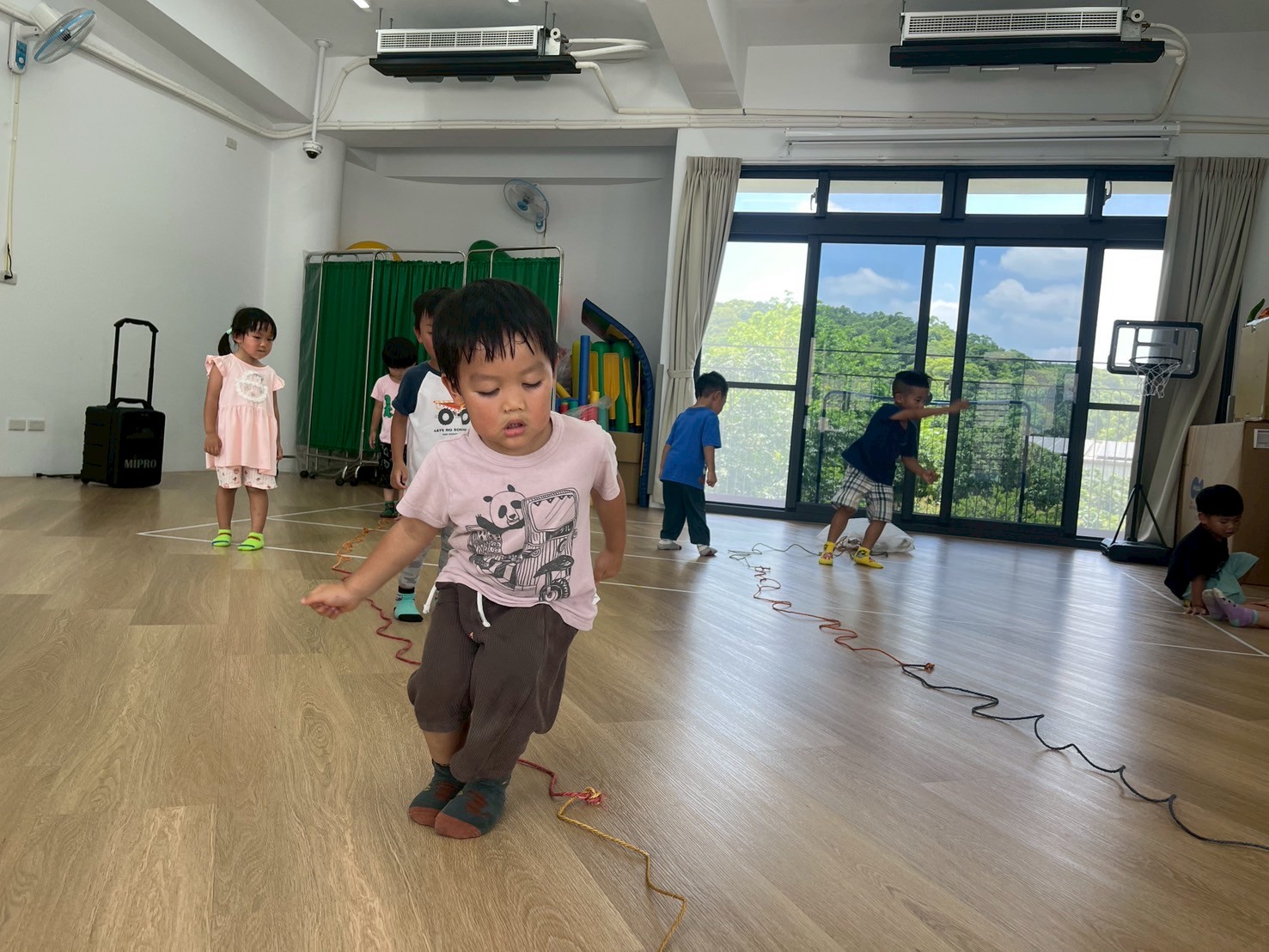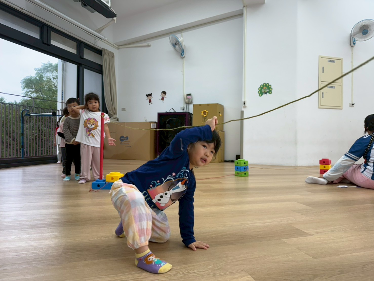 要怎麼去適應繩子的狀態,孩子們透過不同的動作,去與繩子進行遊戲,跳躍、爬、走等,訓練孩子的敏捷力及協調性。