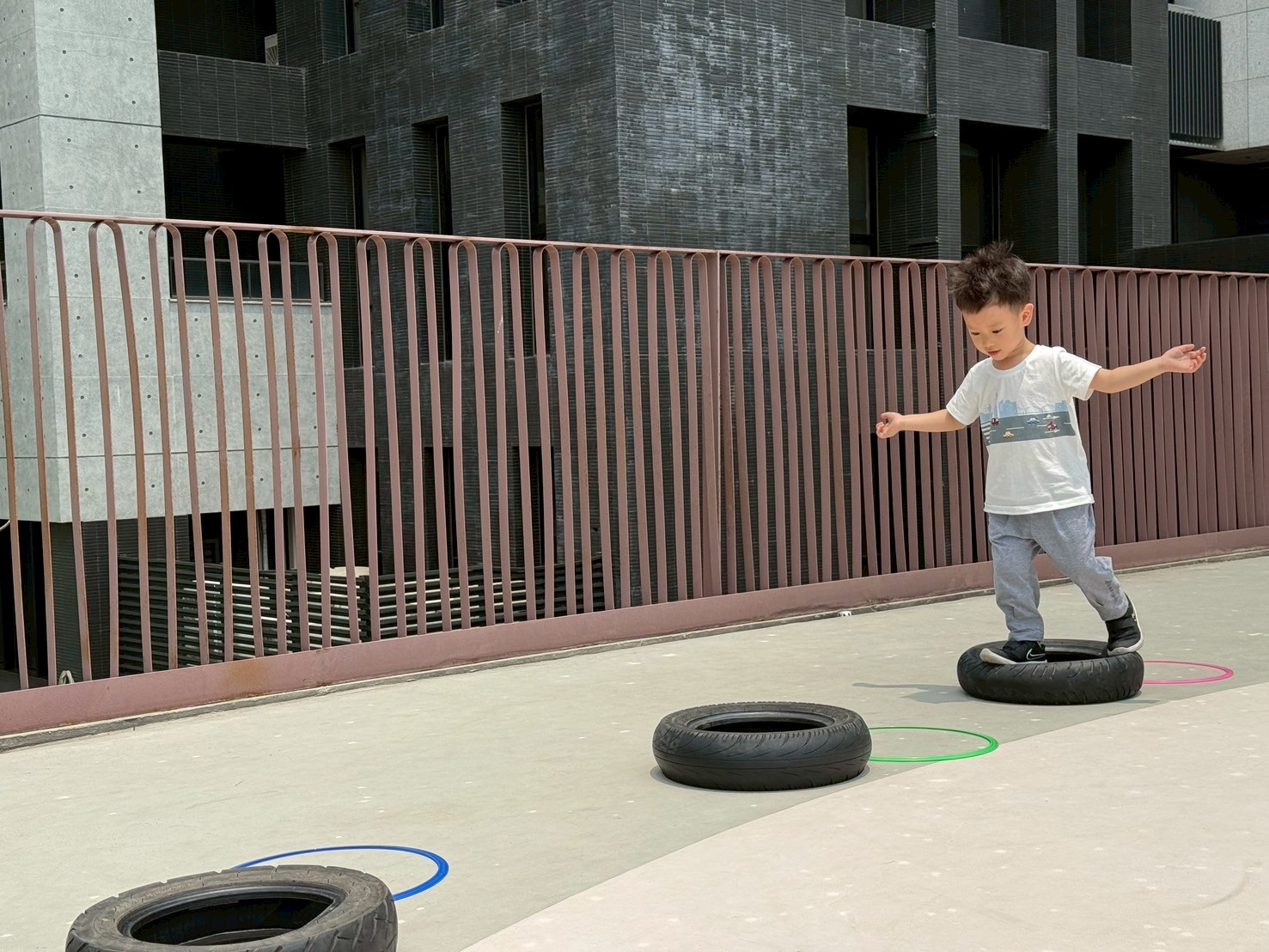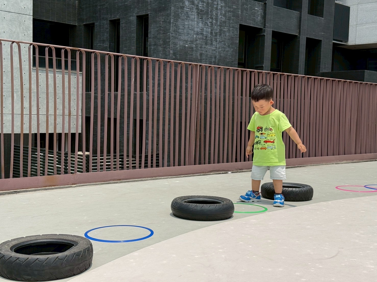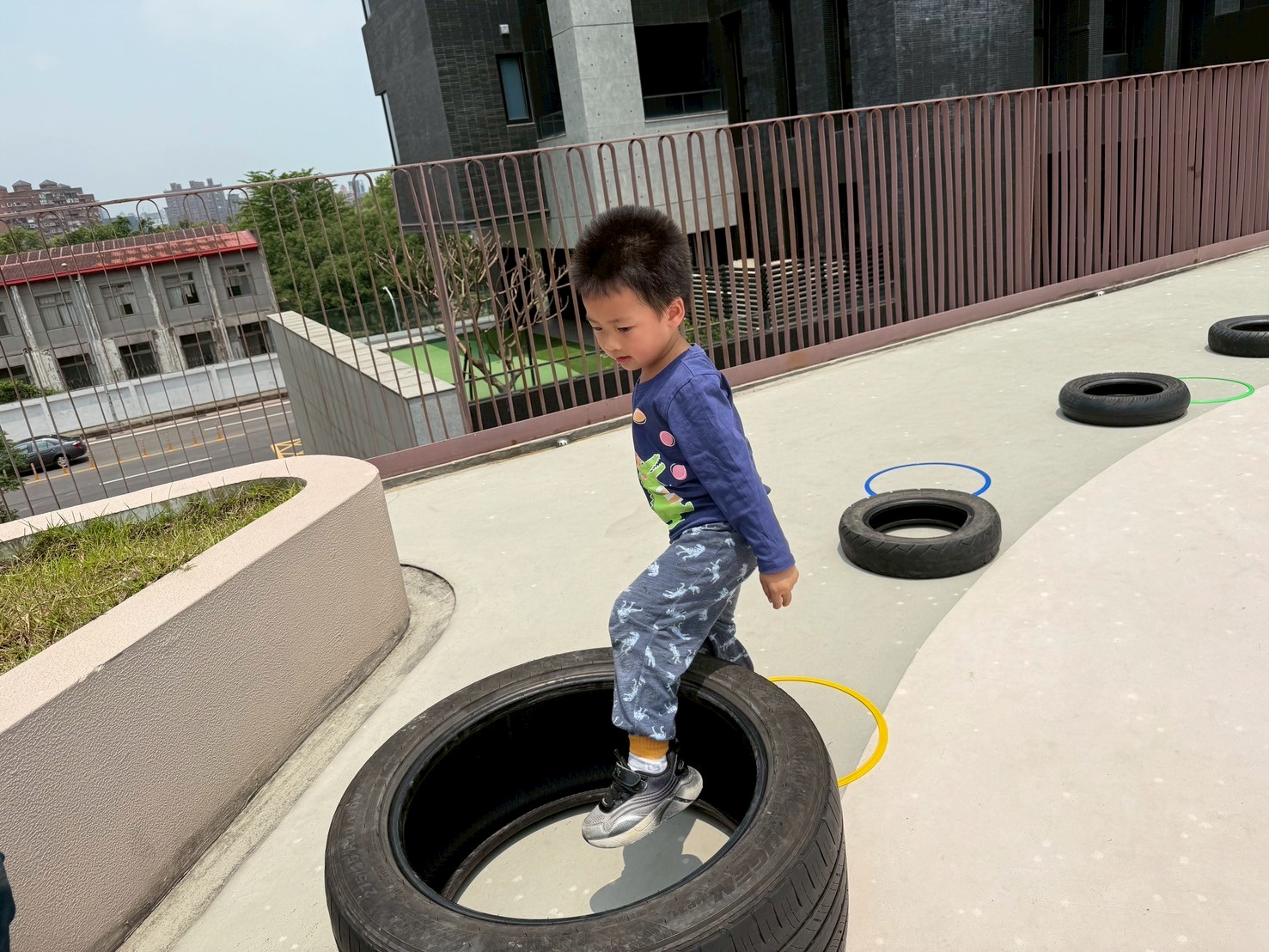 利用不同大小的輪胎,讓孩子進行跳躍及跨走的活動,體驗踩在輪胎上的感覺,提升平衡力與腳步穩定性。