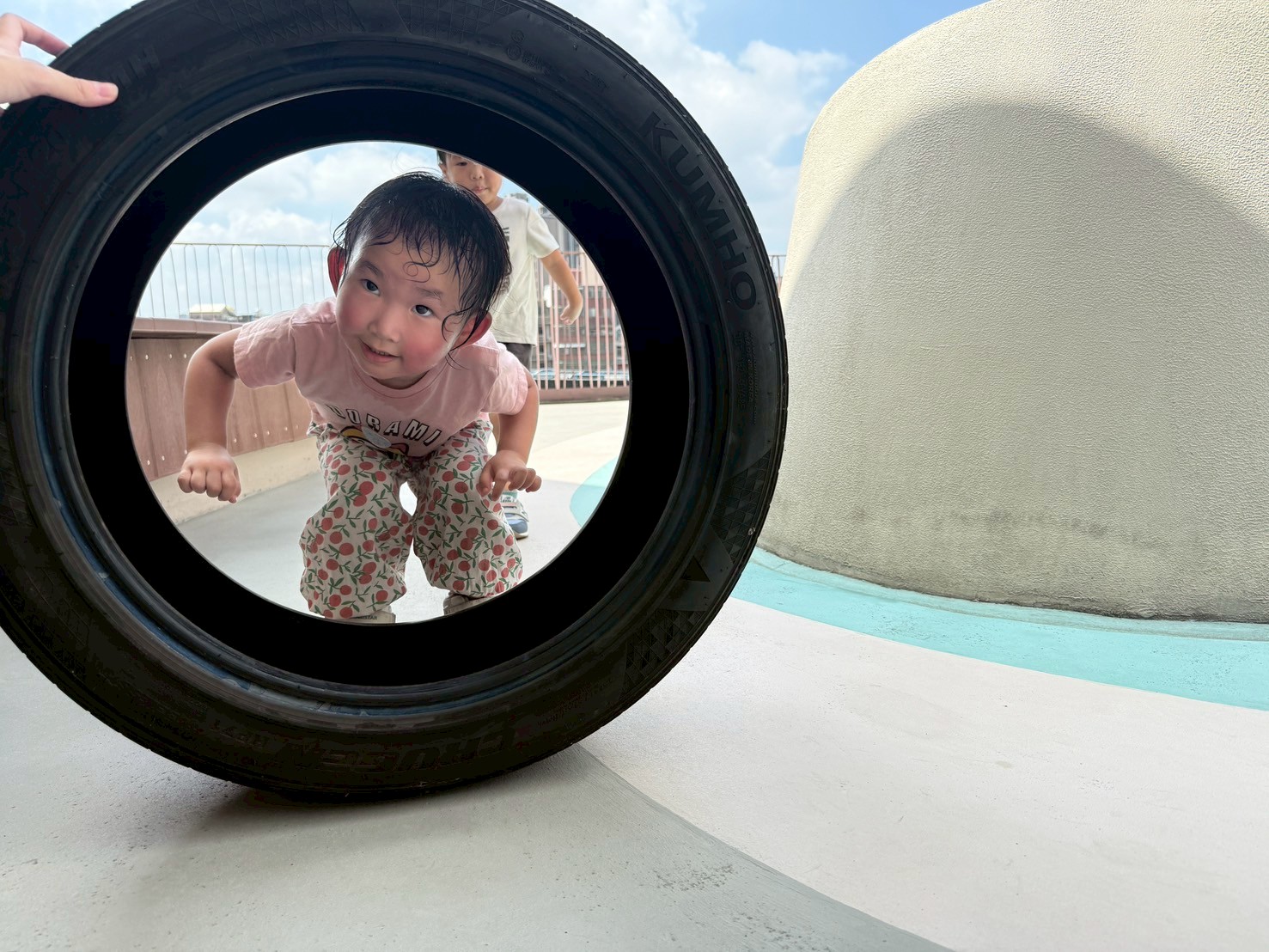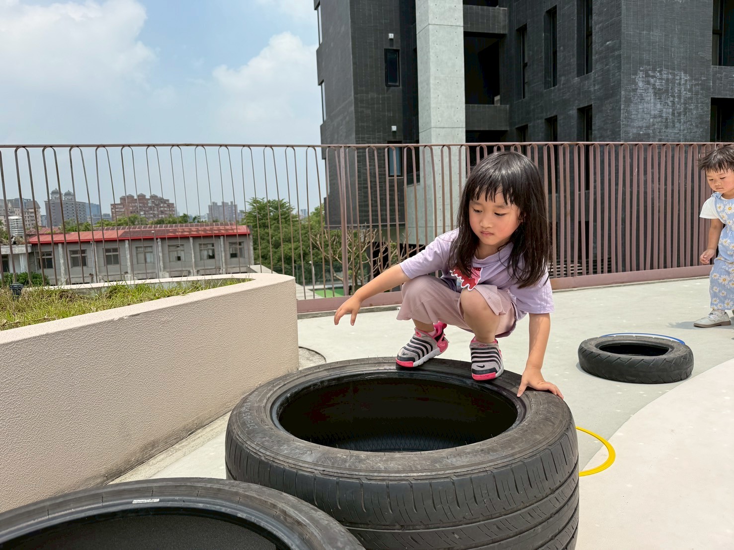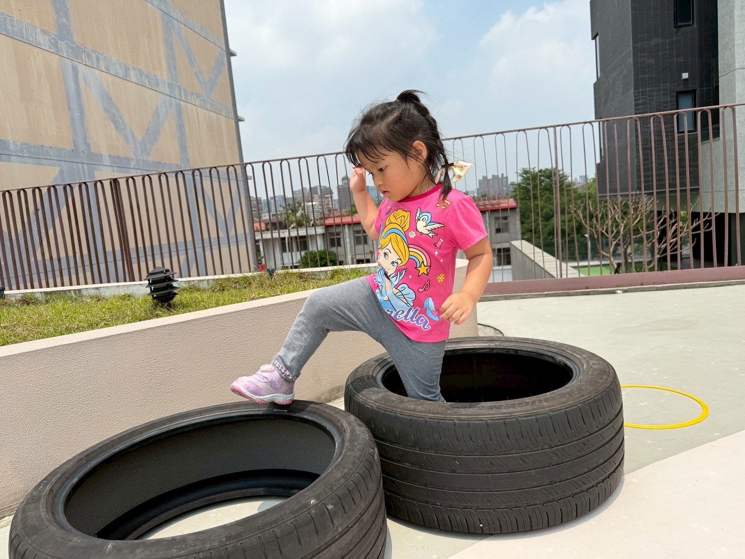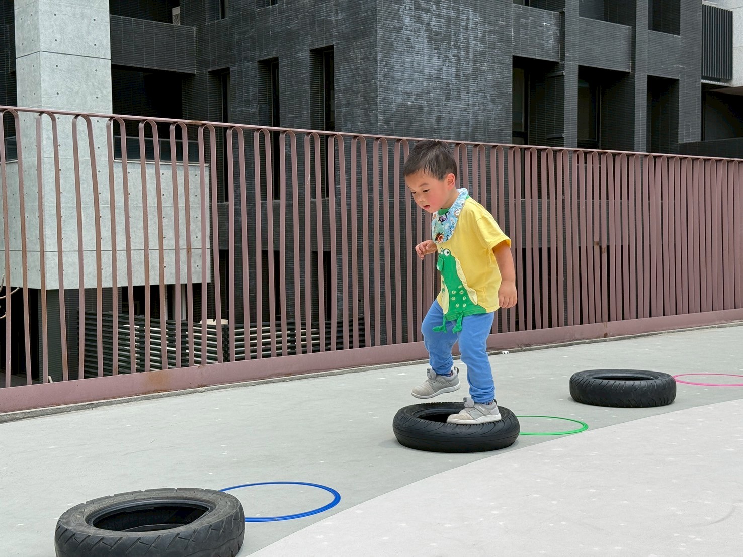 利用不同大小的輪胎,讓孩子進行跳躍及跨走的活動,體驗踩在輪胎上的感覺,提升平衡力與腳步穩定性。