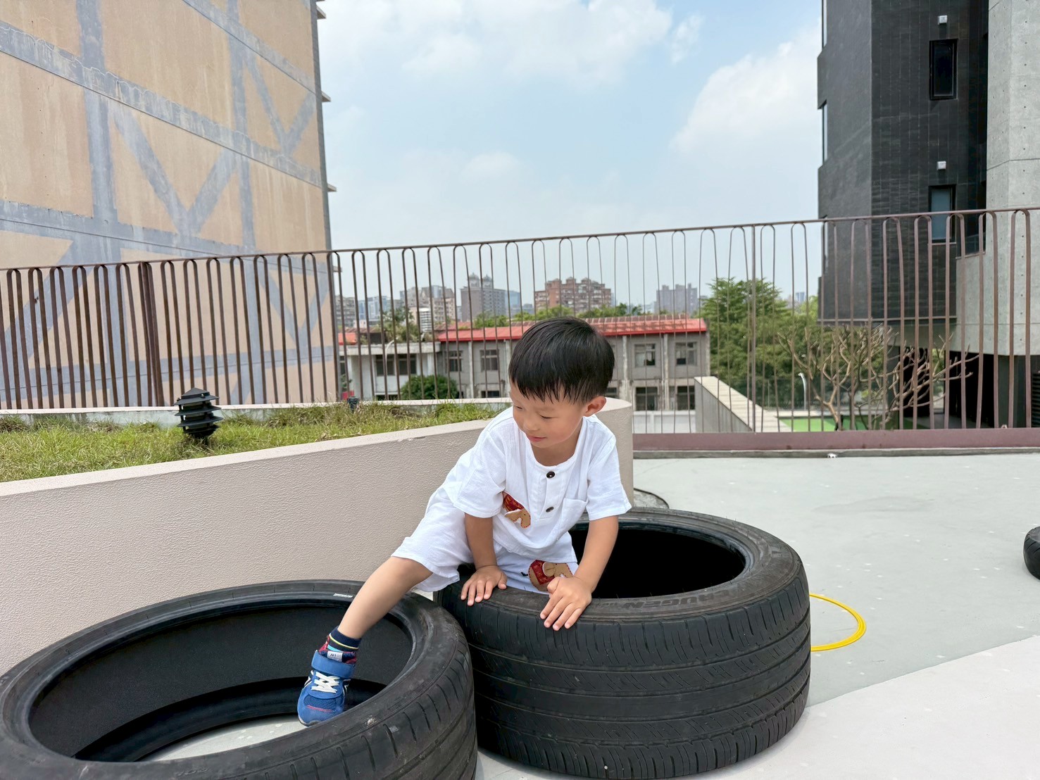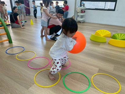 透過輪胎的環狀課程,刺激平衡感的發展,再藉由拋接球的活動,引導孩子專注眼手協調,並訓練其反應能力。