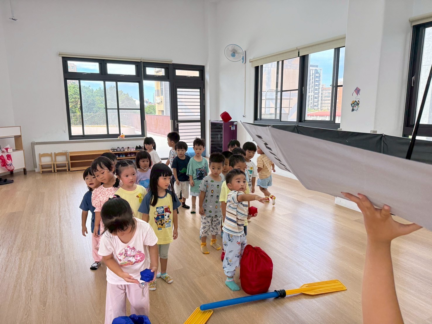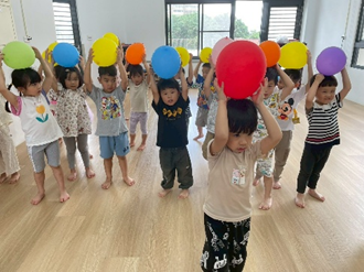 與同儕雙手抓住氣球傘,聽從指令來進行遊戲,讓孩子在遊戲中培養團隊合作精神與聽從指令的能力。