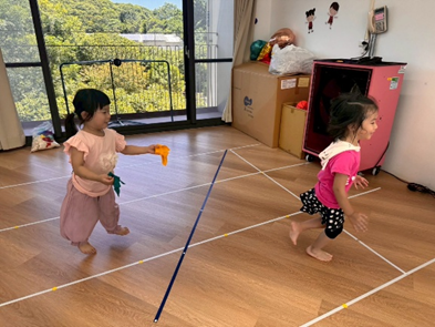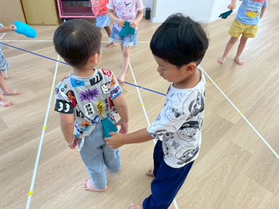 孩子們拿著小毛巾當作「尾巴」,一邊保護自己的尾巴不被拔走,一邊嘗試去拔取同伴的尾巴, 成功拔取尾巴後,還會主動將尾巴歸還給對方,展現出有禮貌與尊重他人的行為。