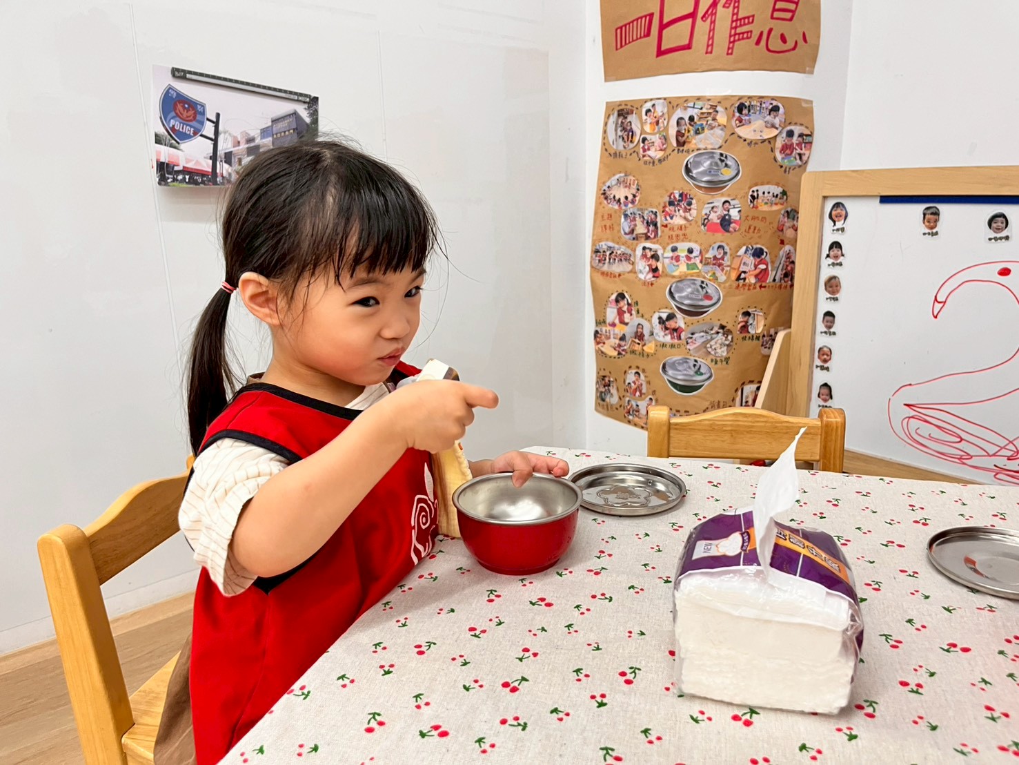 藉由課程設計,讓孩子知道用餐的流程和生活禮儀,共同模仿日常生活的好習慣,接著運用情境扮演的方式,了解用餐禮儀應該注意的事項,共同建立日常秩序感及培養自我負責任的態度。