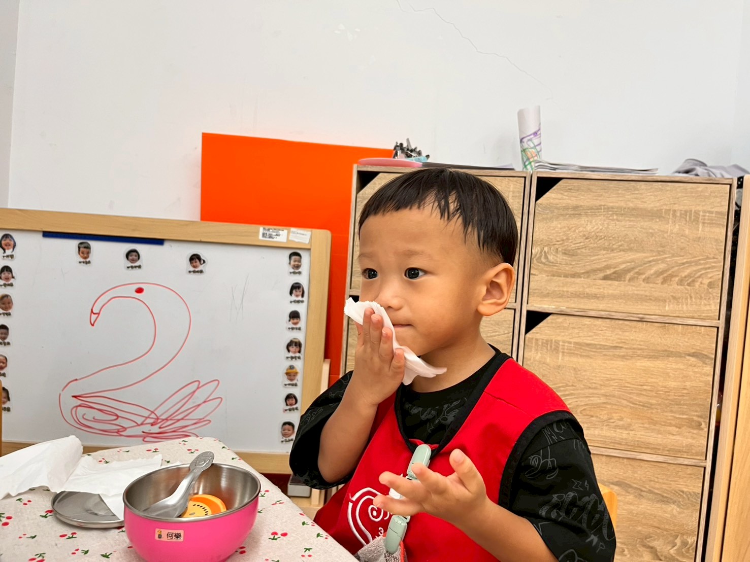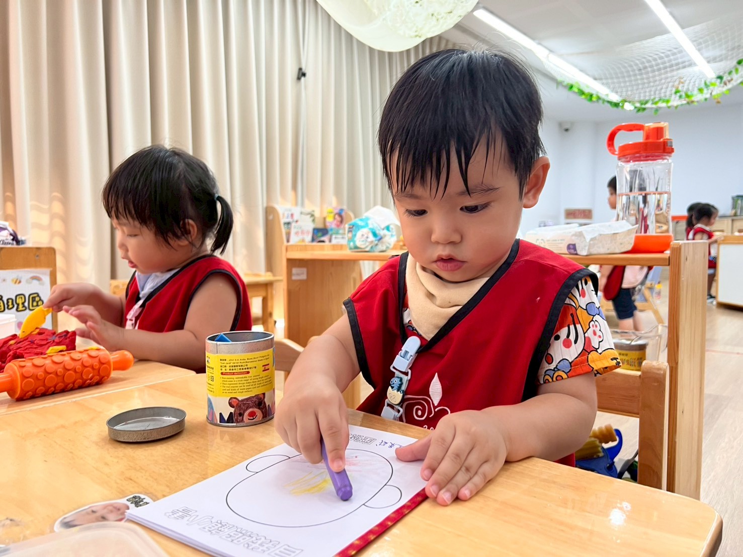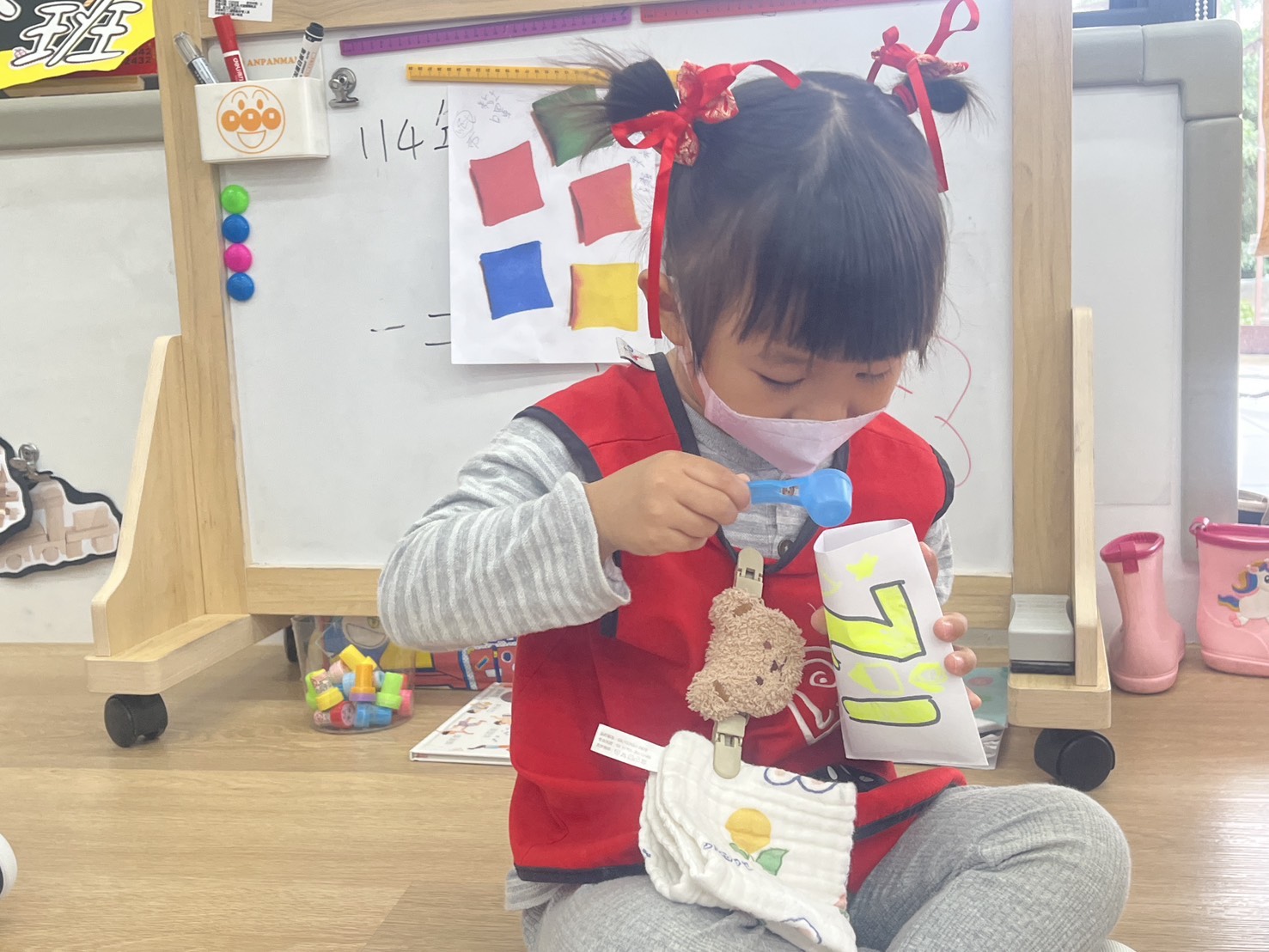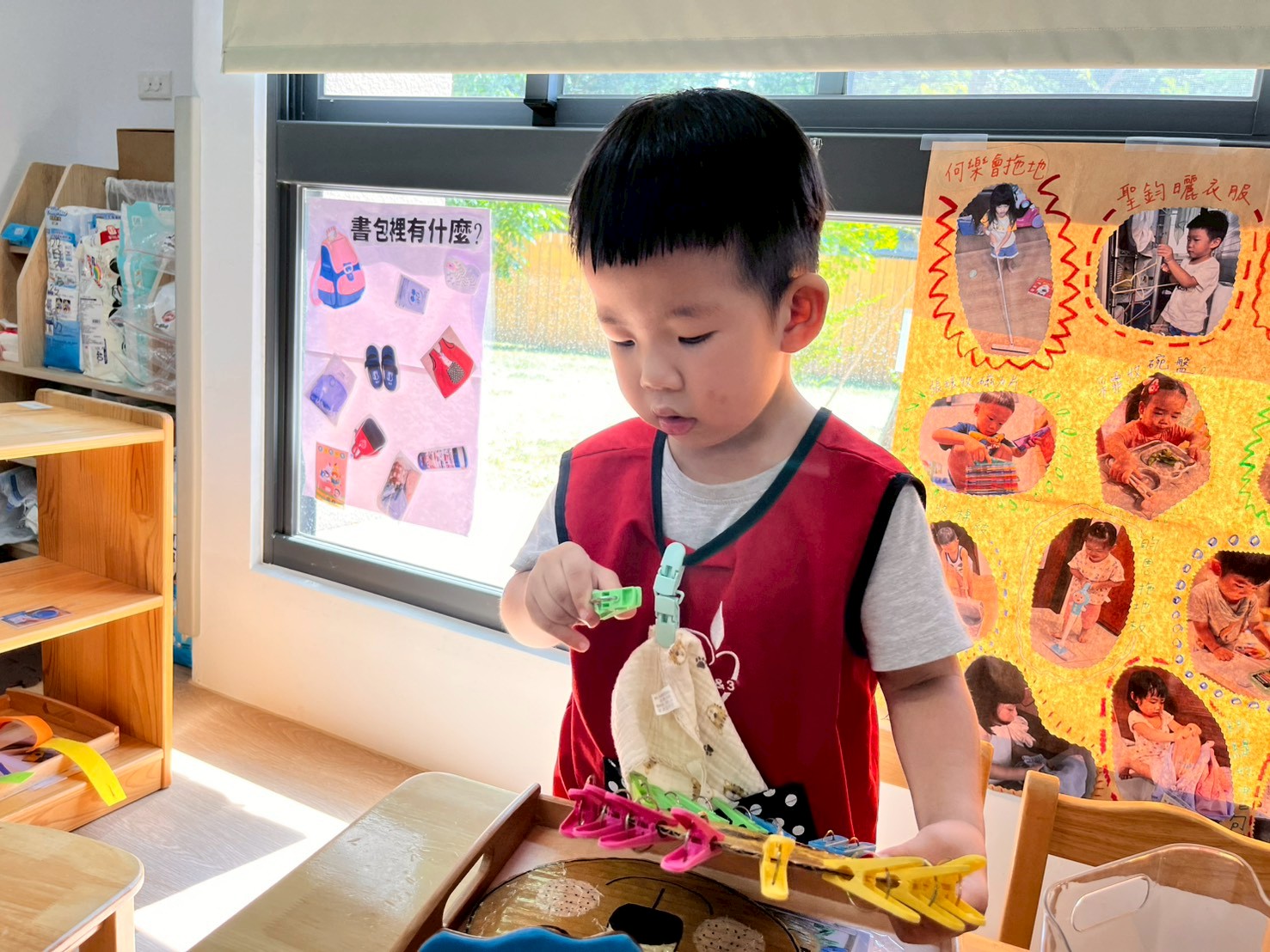 配合課程「練習穿脫衣褲」,在生活自理區特別新增了穿衣板,孩子們可以透過實際操作練習扣扣子、解開扣子,進而培養生活自理能力,增強手部肌肉與耐心。