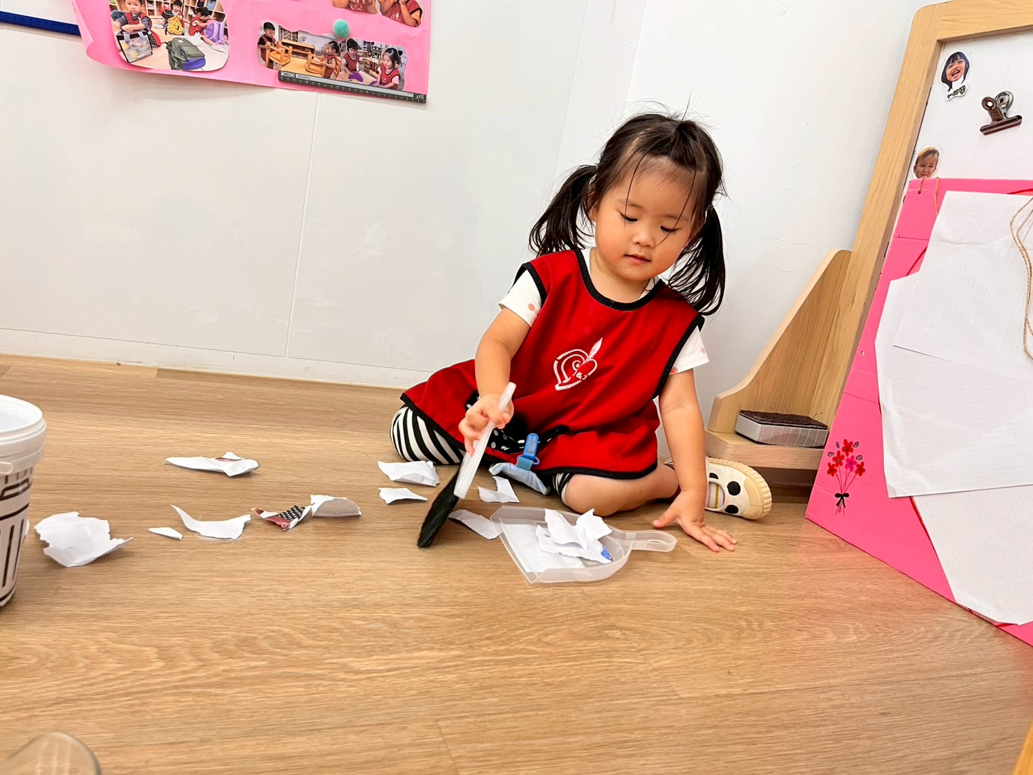 讓幼兒練習正確使用小掃把,將紙屑掃起並倒入垃圾桶,培養動作協調及環境整潔的好能力。
