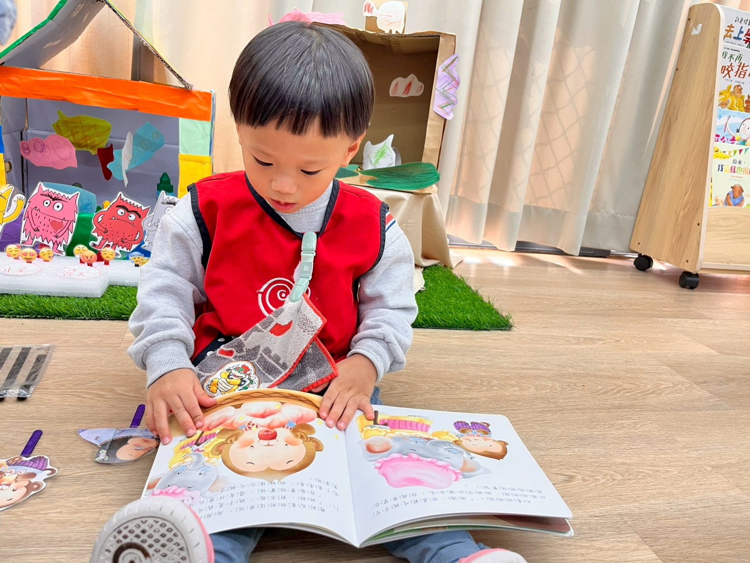 語文區提供豐富的文字探索活動,包含文字偵探、文字迷宮與繪本閱讀,讓孩子在遊戲中認識字詞、練習觀察與辨識能力,培養對文字的興趣,也增進語文理解與表達的能力。