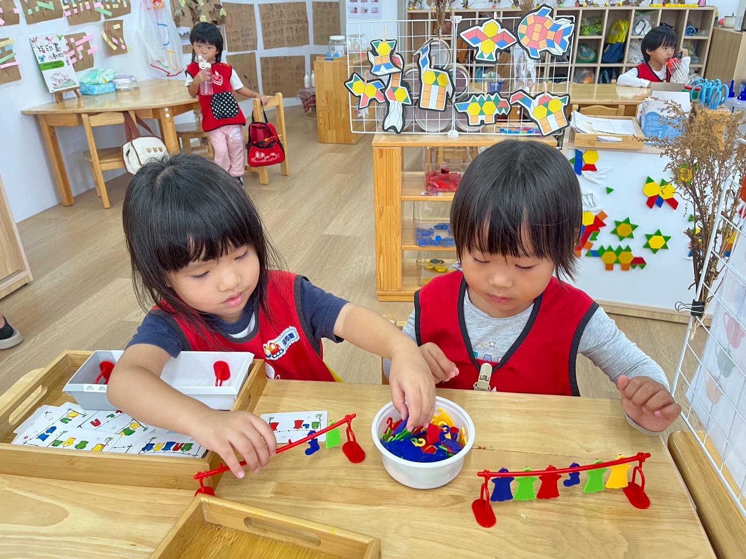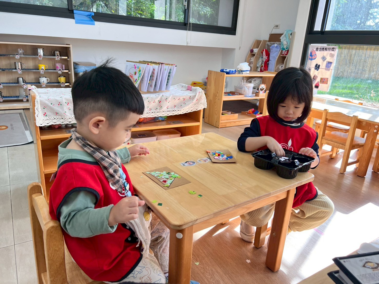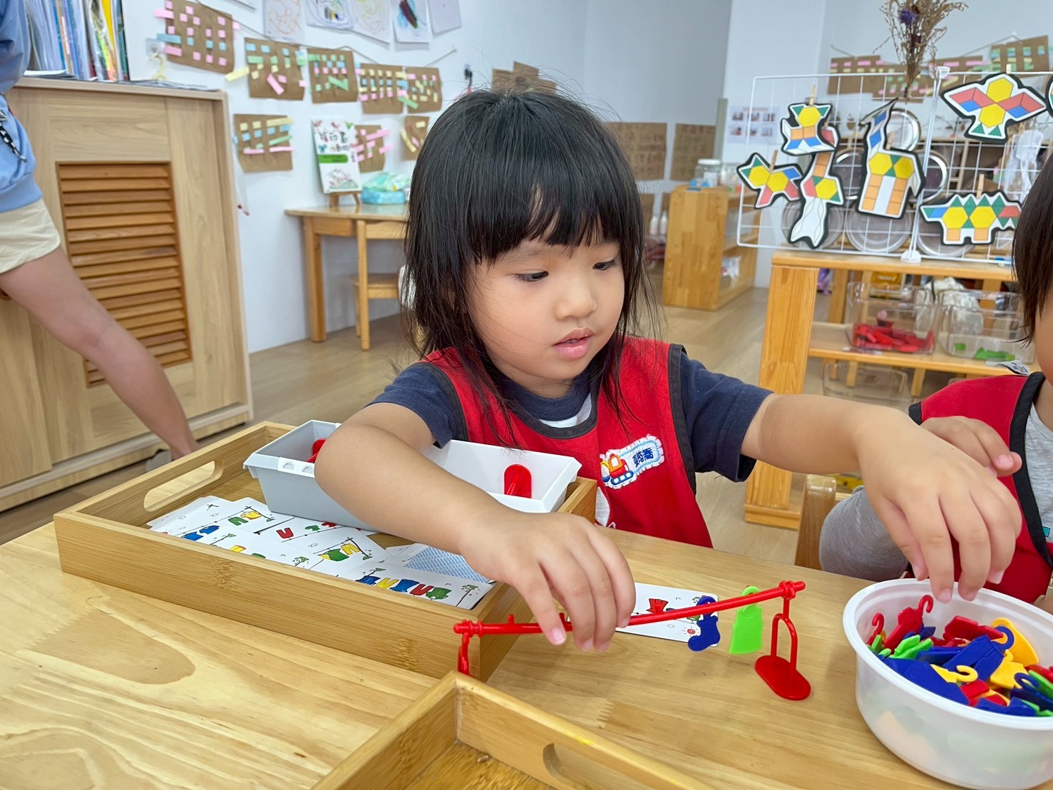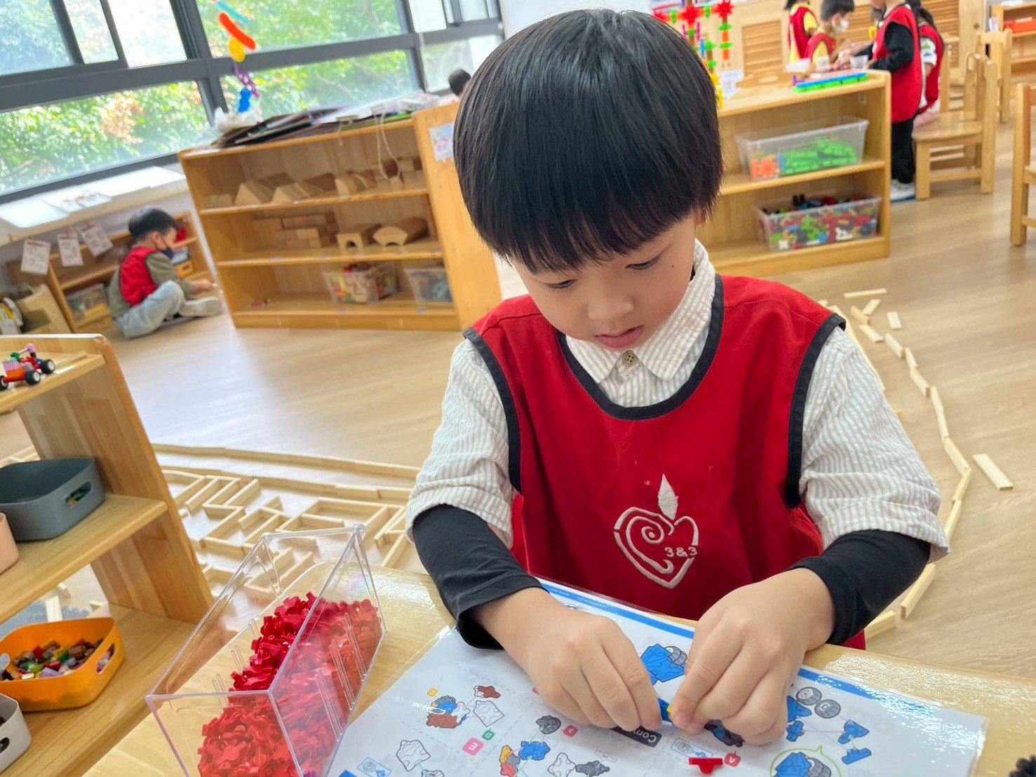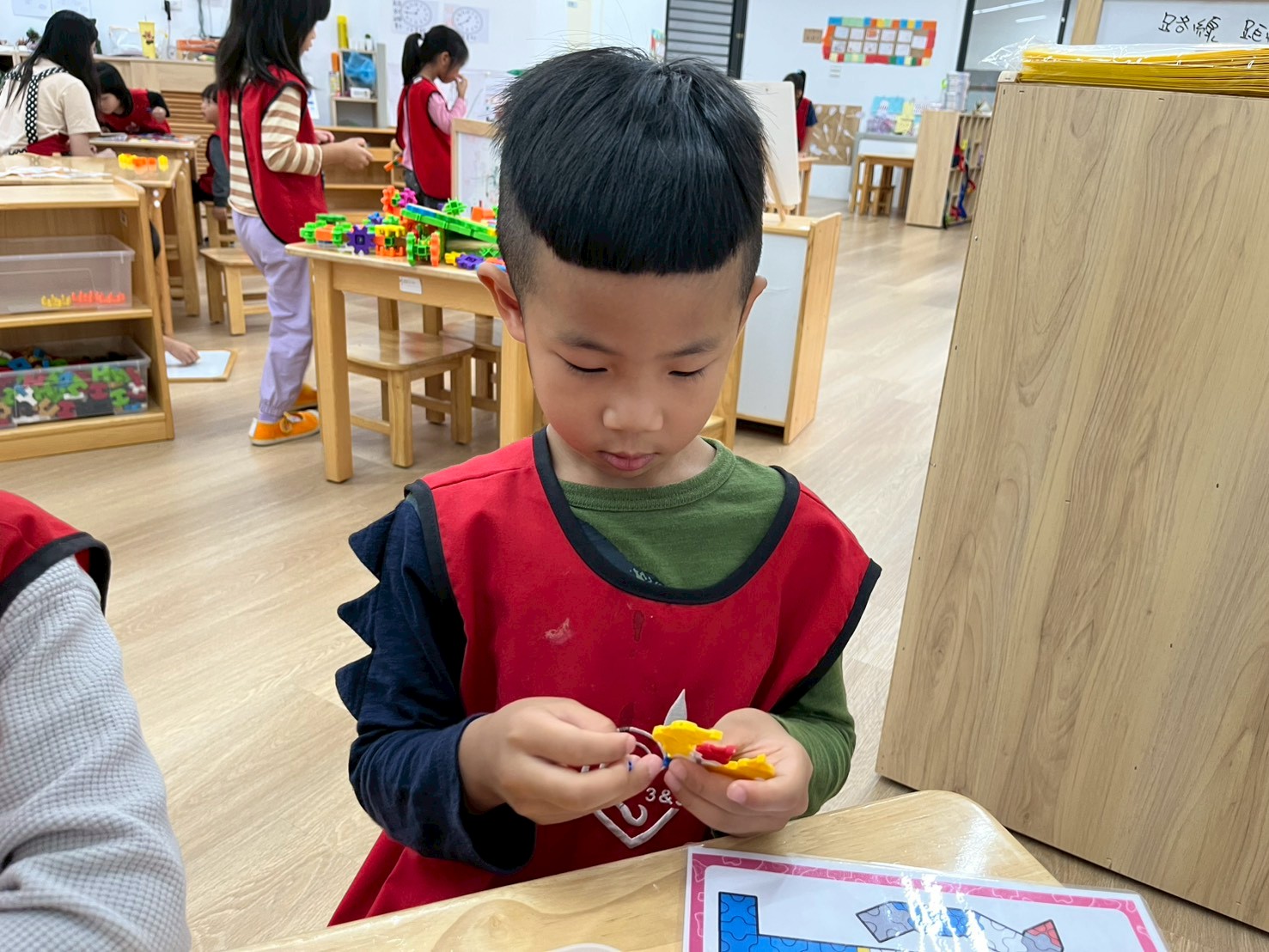 學習區中有顏色排列、形狀對應、重量認識、拼圖……孩子們都慢慢熟悉規則,甚至和他人一起合作共玩。