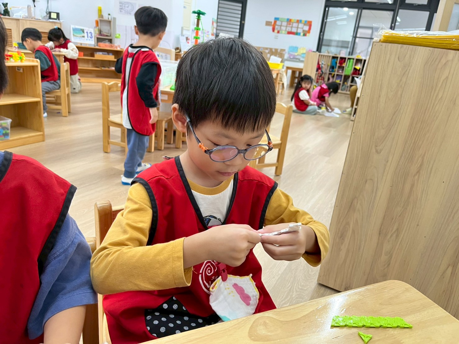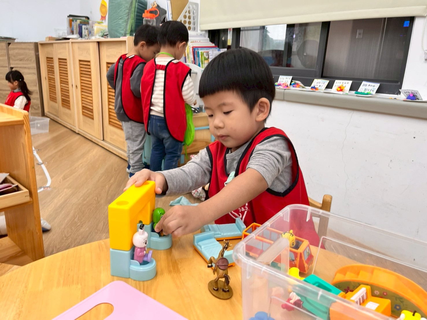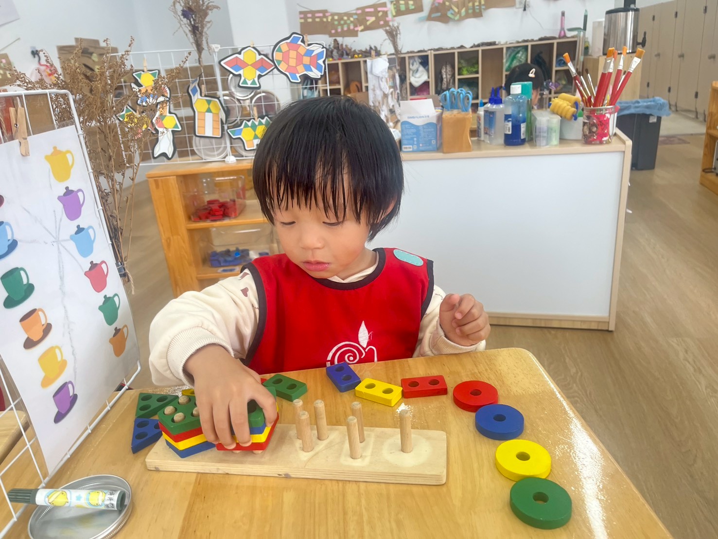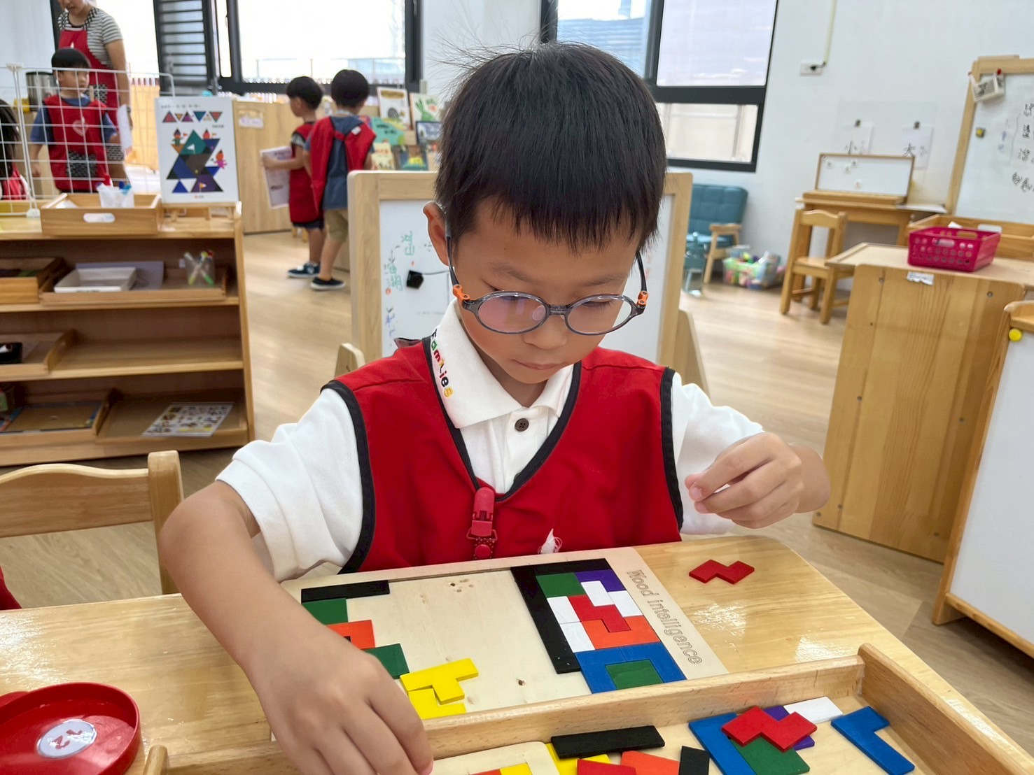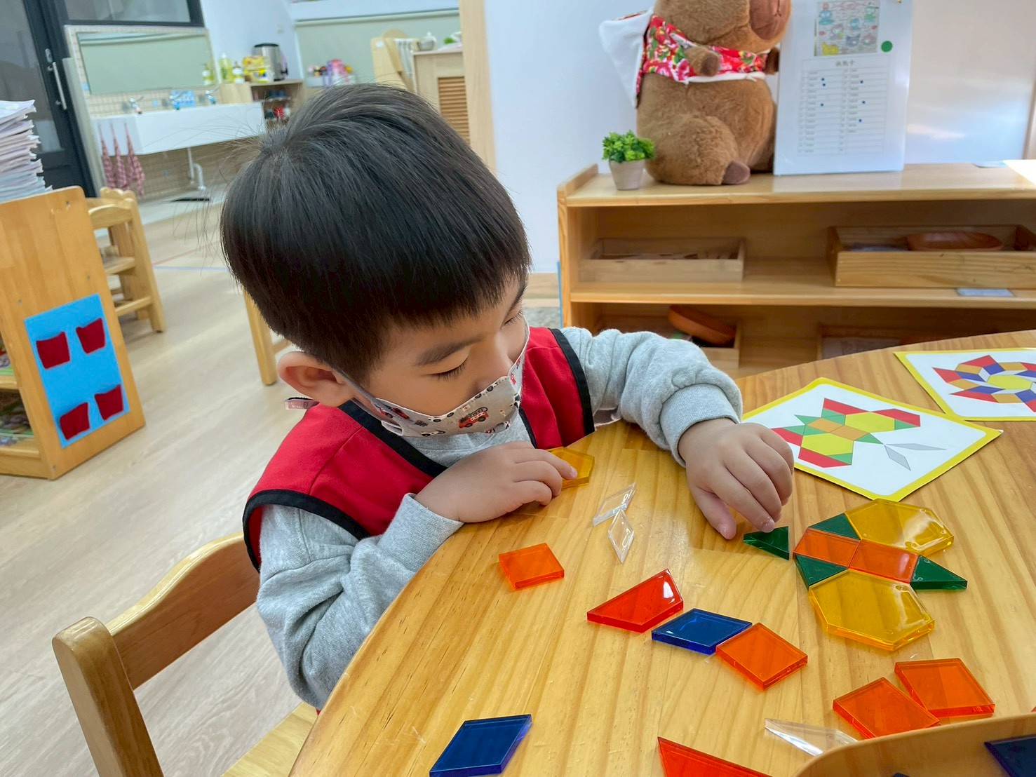 學習區中有顏色排列、形狀對應、重量認識、拼圖……孩子們都慢慢熟悉規則,甚至和他人一起合作共玩。