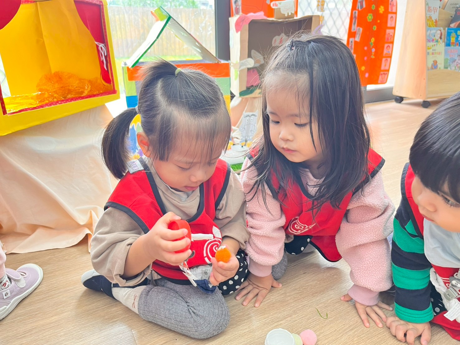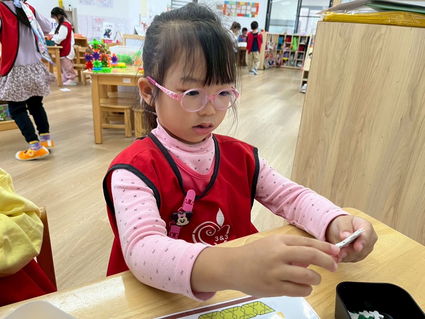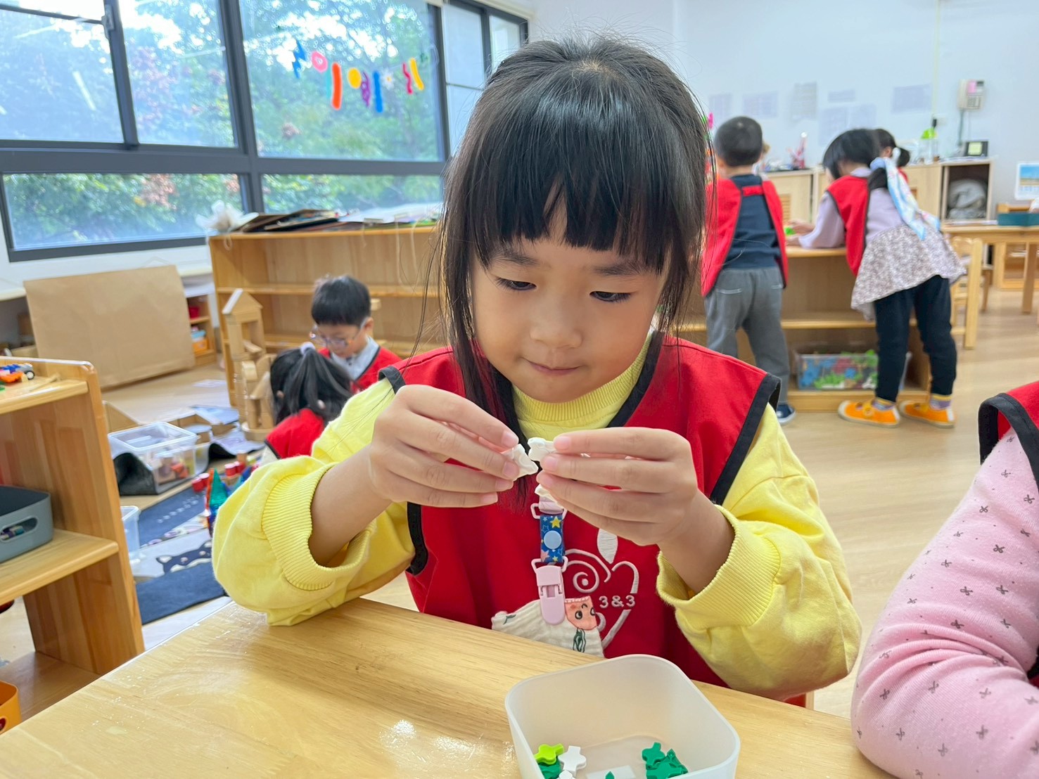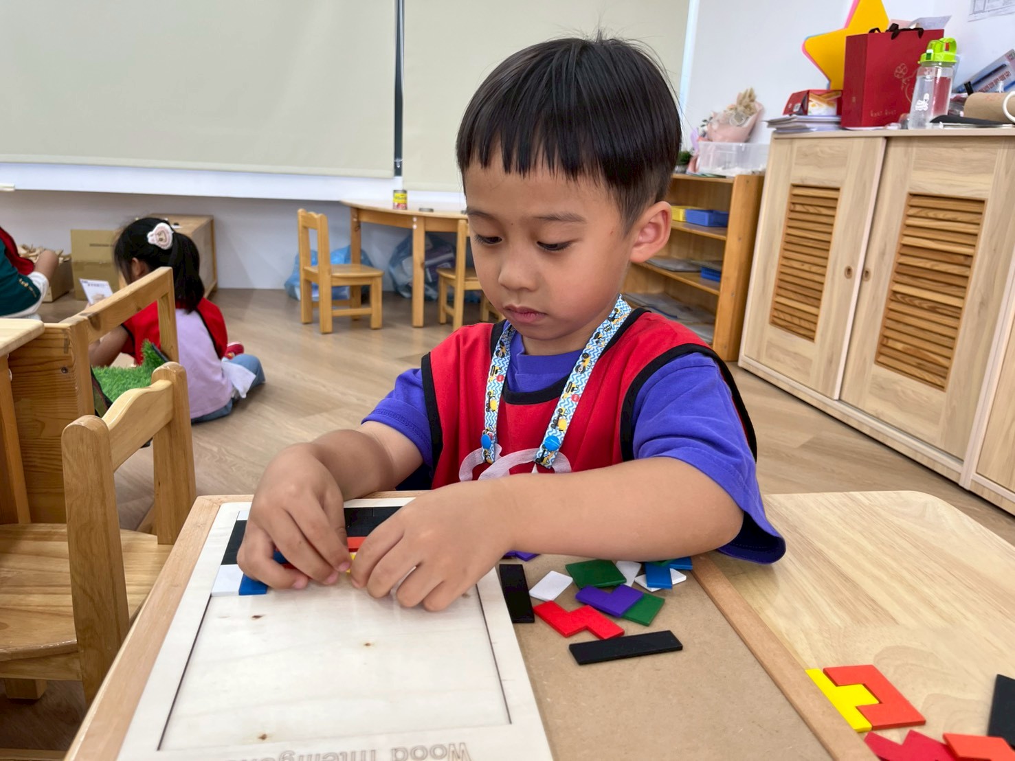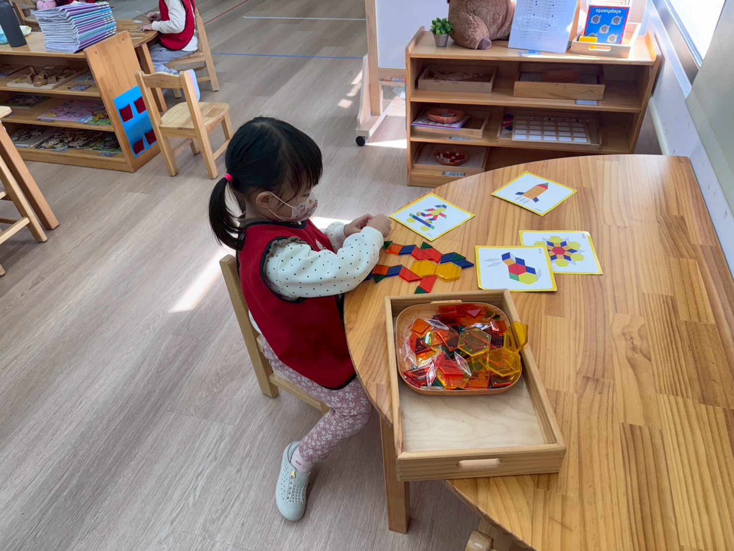 學習區中有顏色排列、形狀對應、重量認識、拼圖……孩子們都慢慢熟悉規則,甚至和他人一起合作共玩。