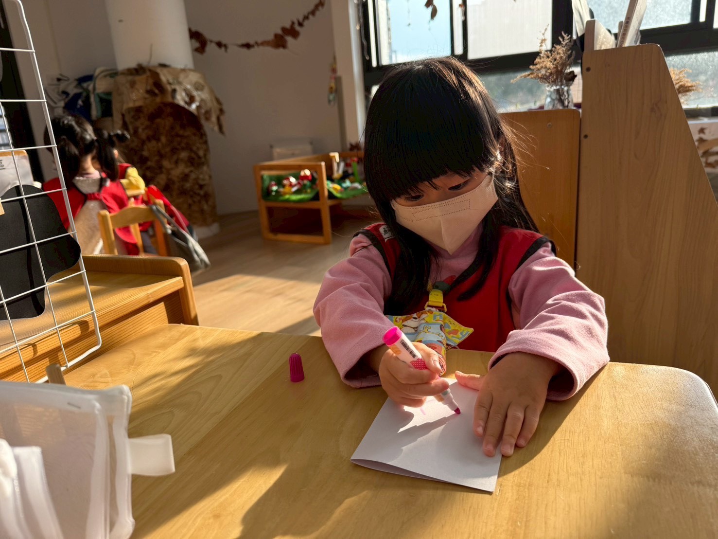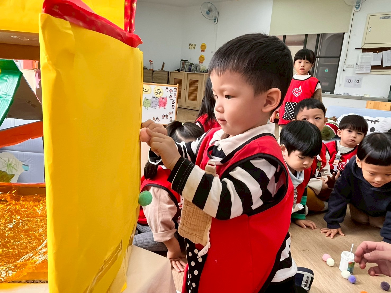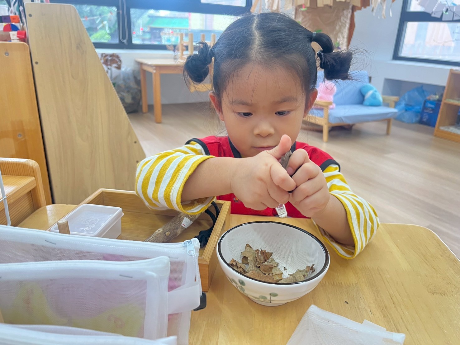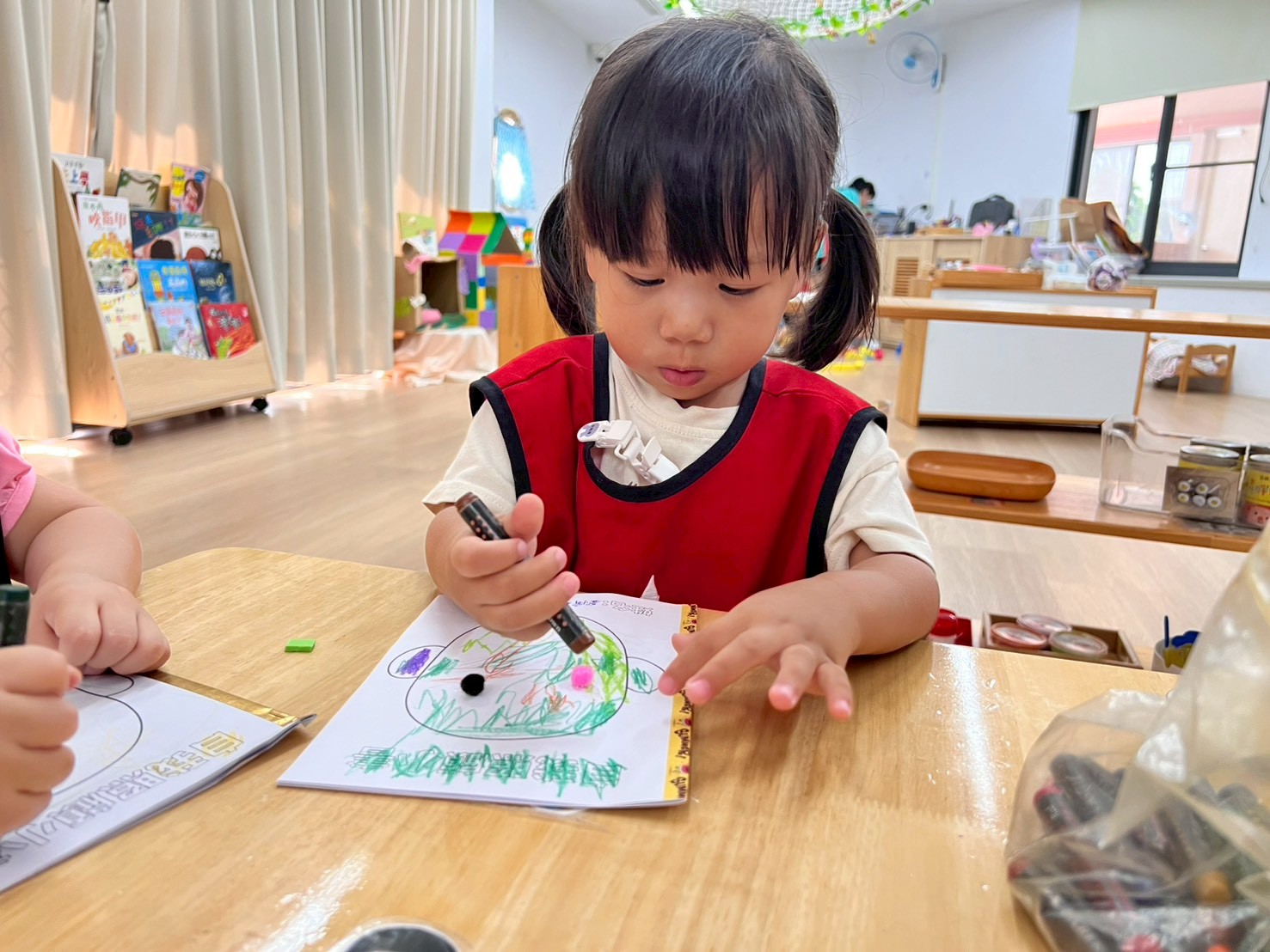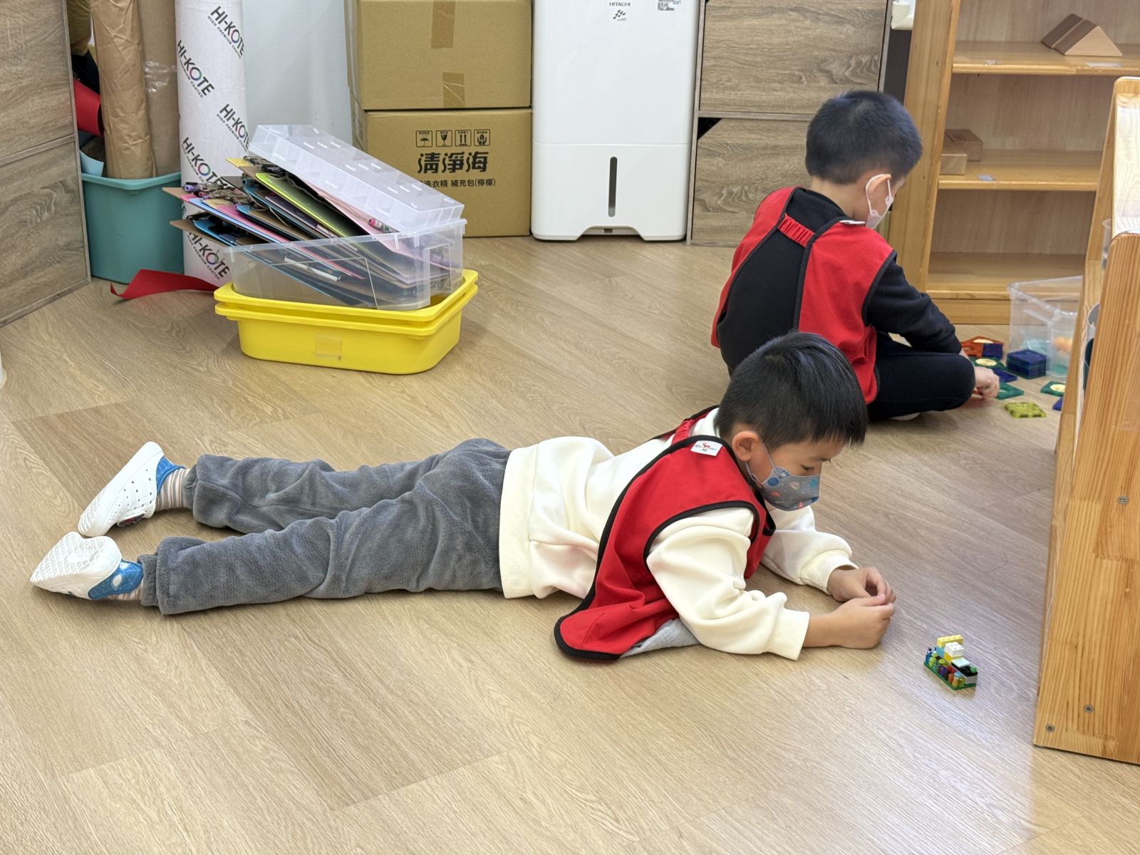 學習區中有顏色排列、形狀對應、重量認識、拼圖……孩子們都慢慢熟悉規則,甚至和他人一起合作共玩。
