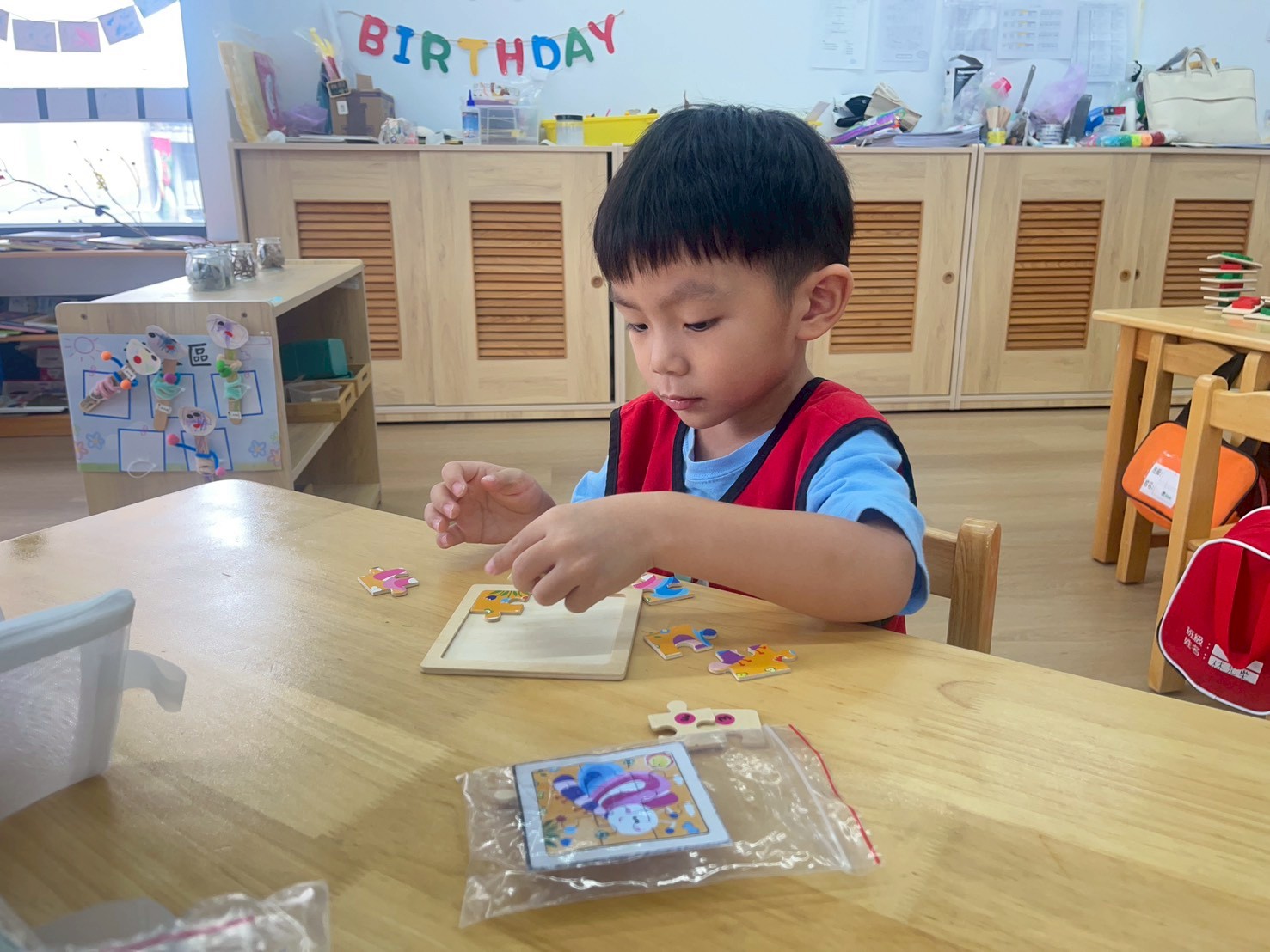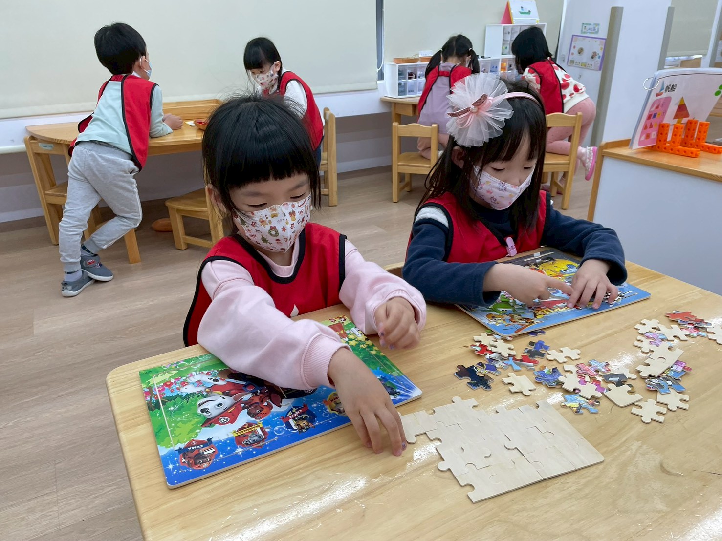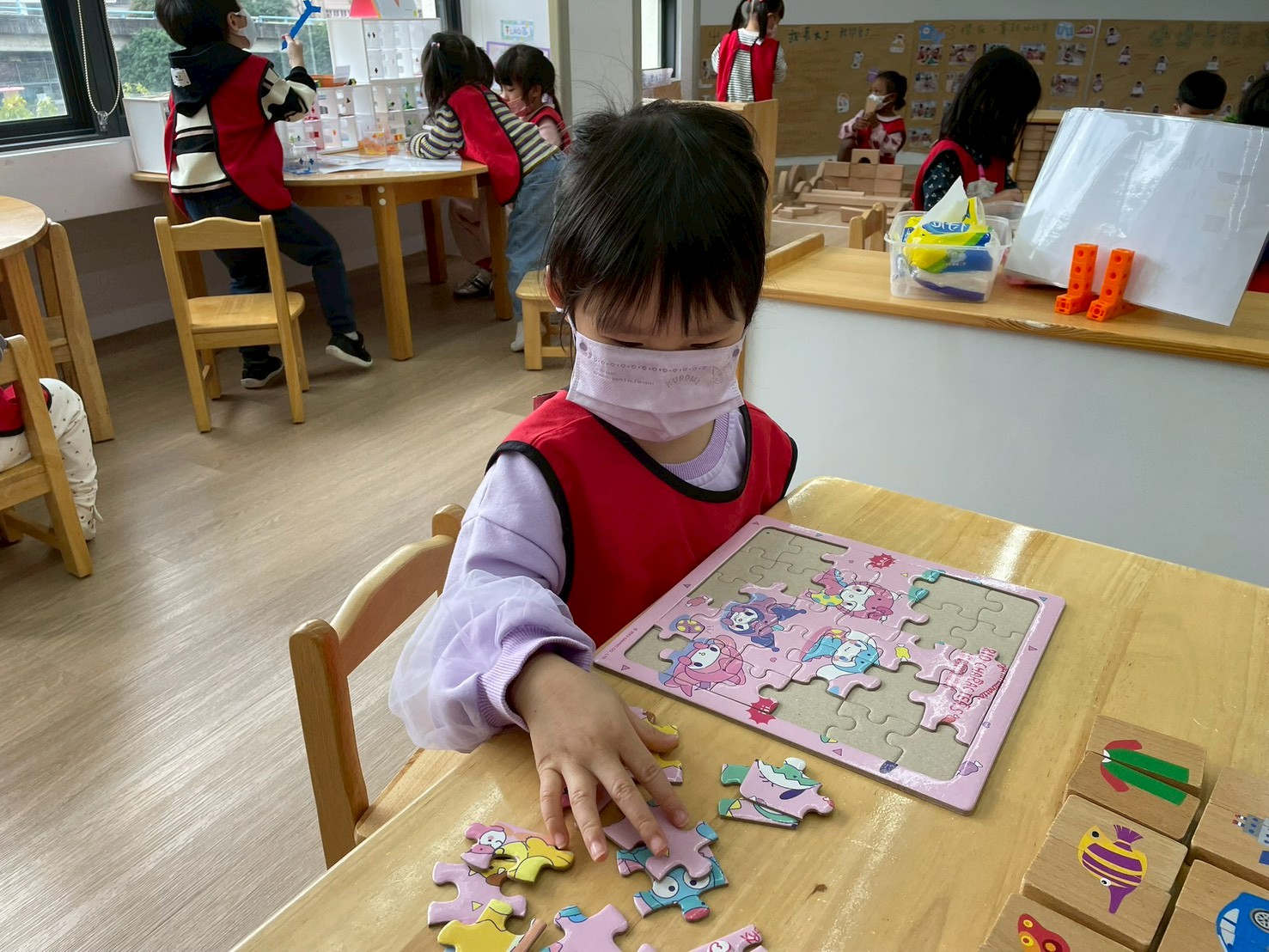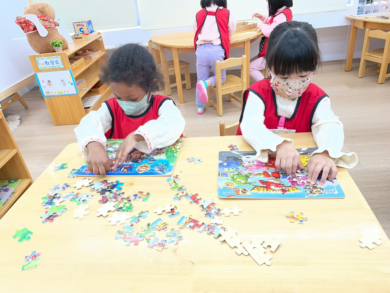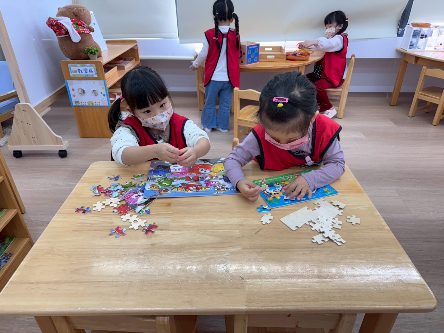 孩子們在數學區與拼圖區活動,透過拼圖、配對與排序練習數字、形狀與邏輯思考,培養觀察力、專注力與解決問題的能力,同時享受完成拼圖的成就感。
