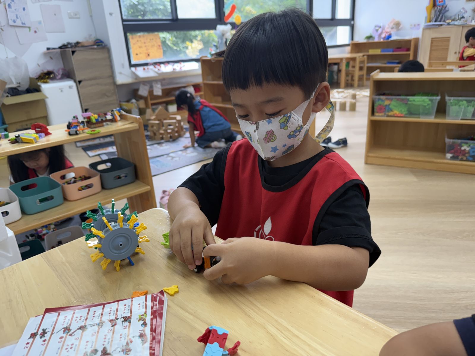 在積木區中,孩子們除了自由搭建外,現在開始多了合作遊戲,也會看著說明書拼出不同的物件,並且結合不同的遊戲,搭建出不同的場景喔!
