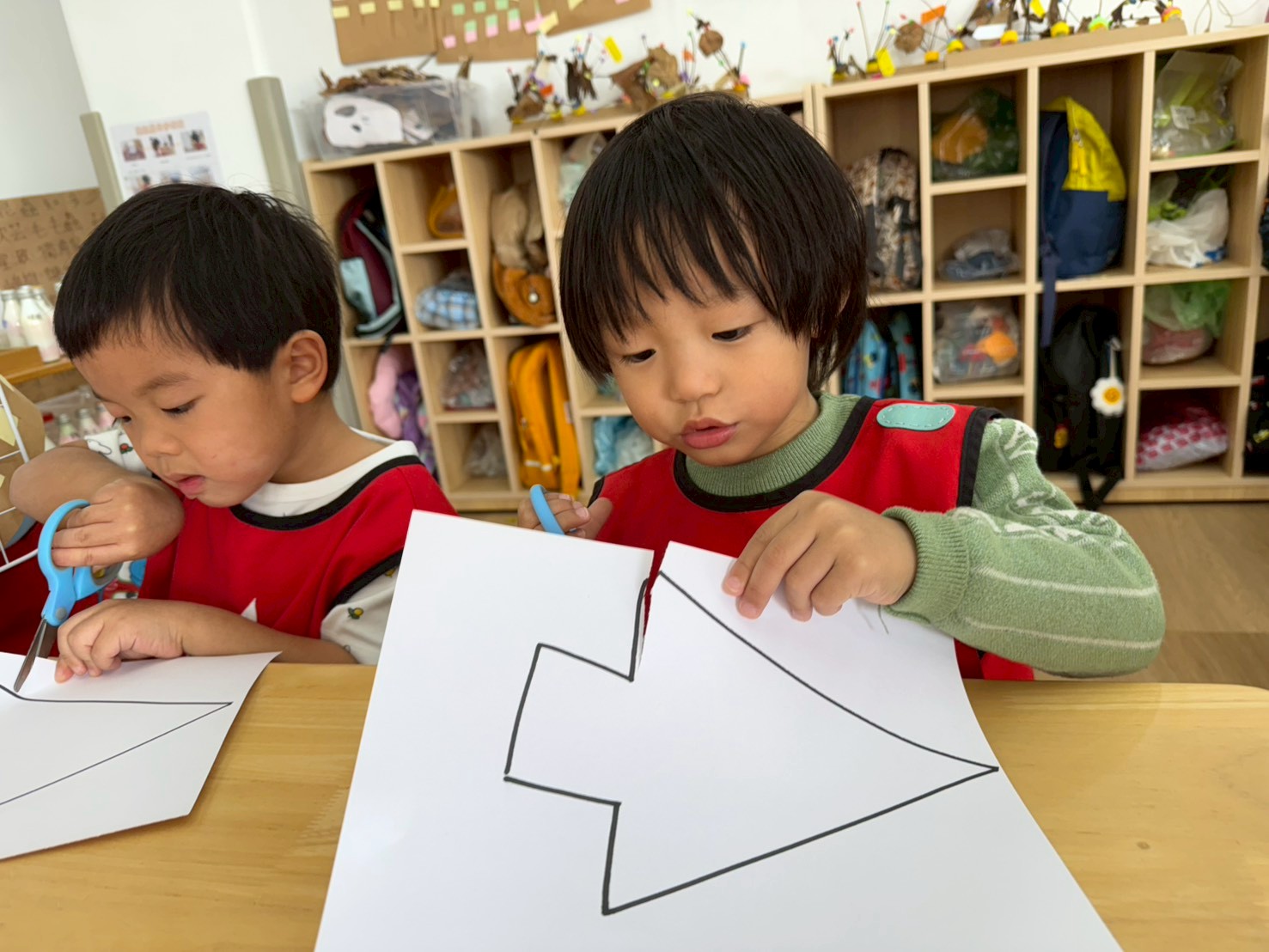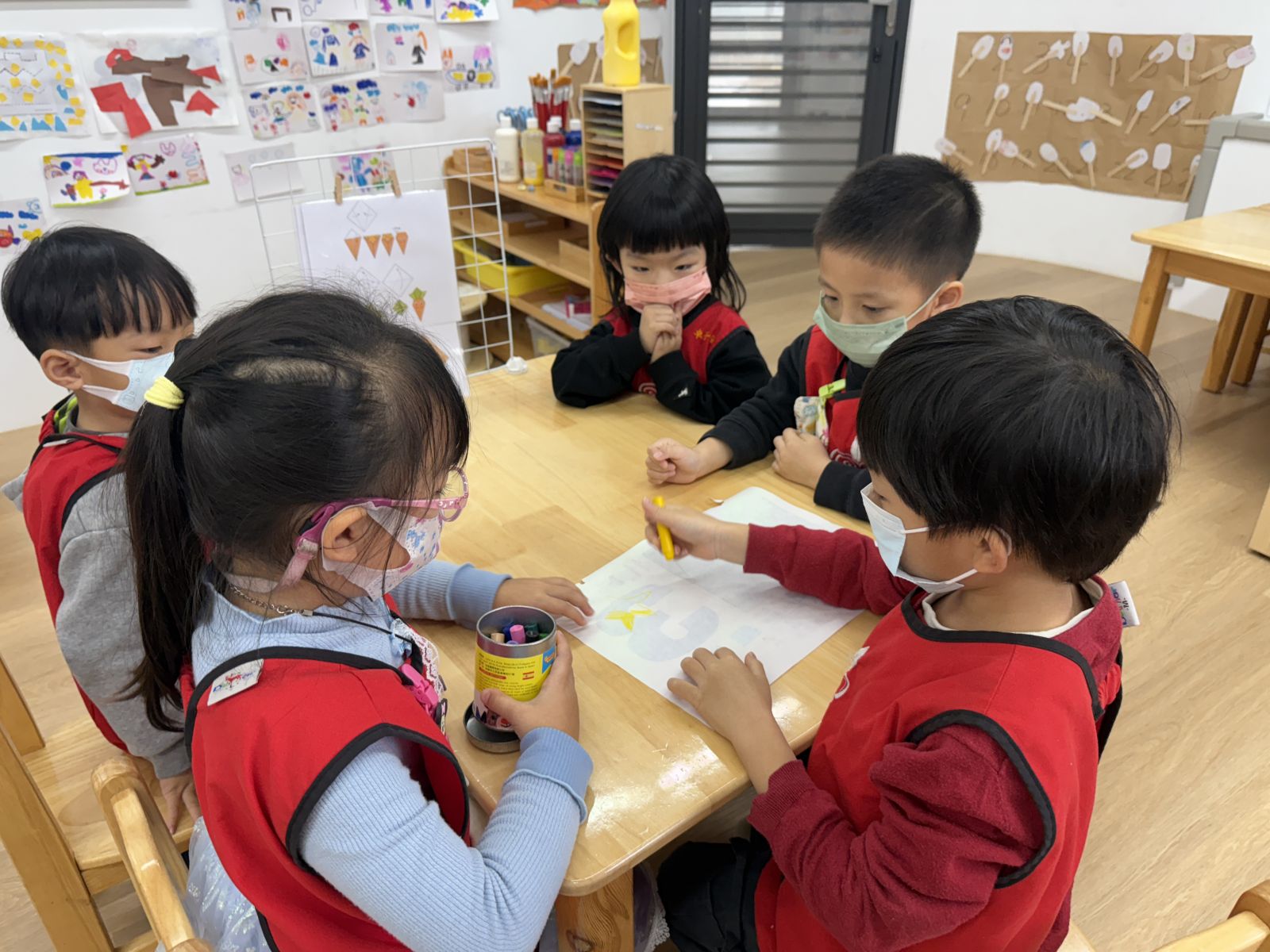 美勞區增加了對稱的剪工,孩子們透過不同的圖案,去練習剪工,剪完後貼在紙上進行繪畫,在黏土的捏塑上,有了主題麵糰的經驗,孩子們更加純熟了。