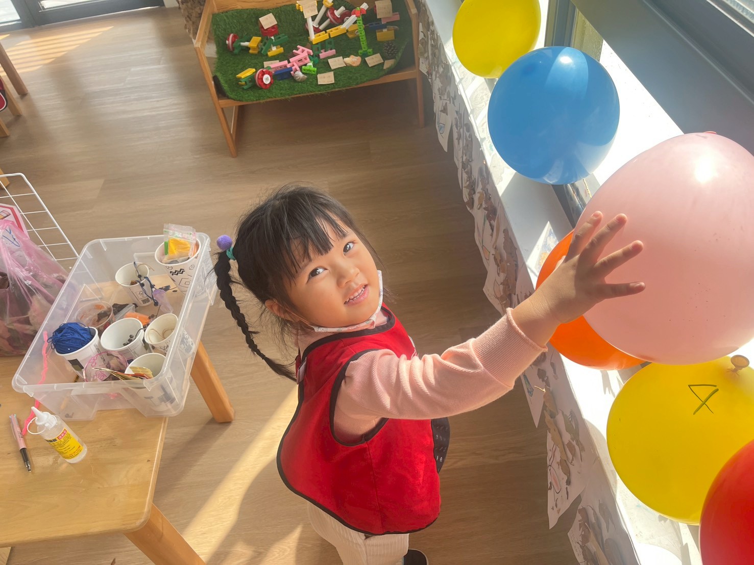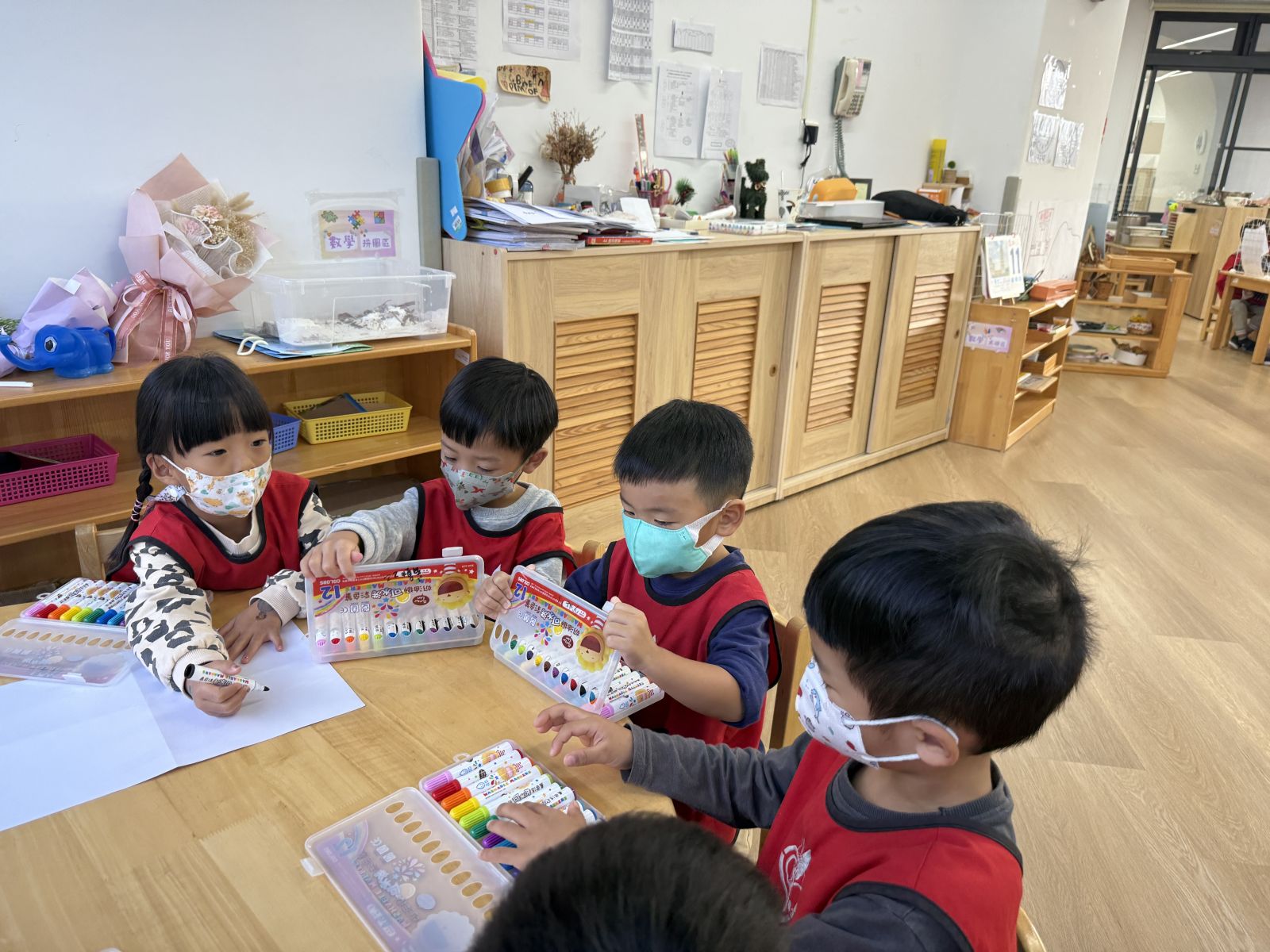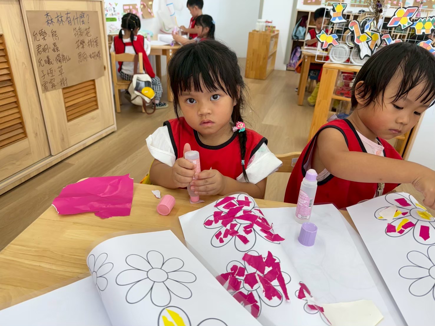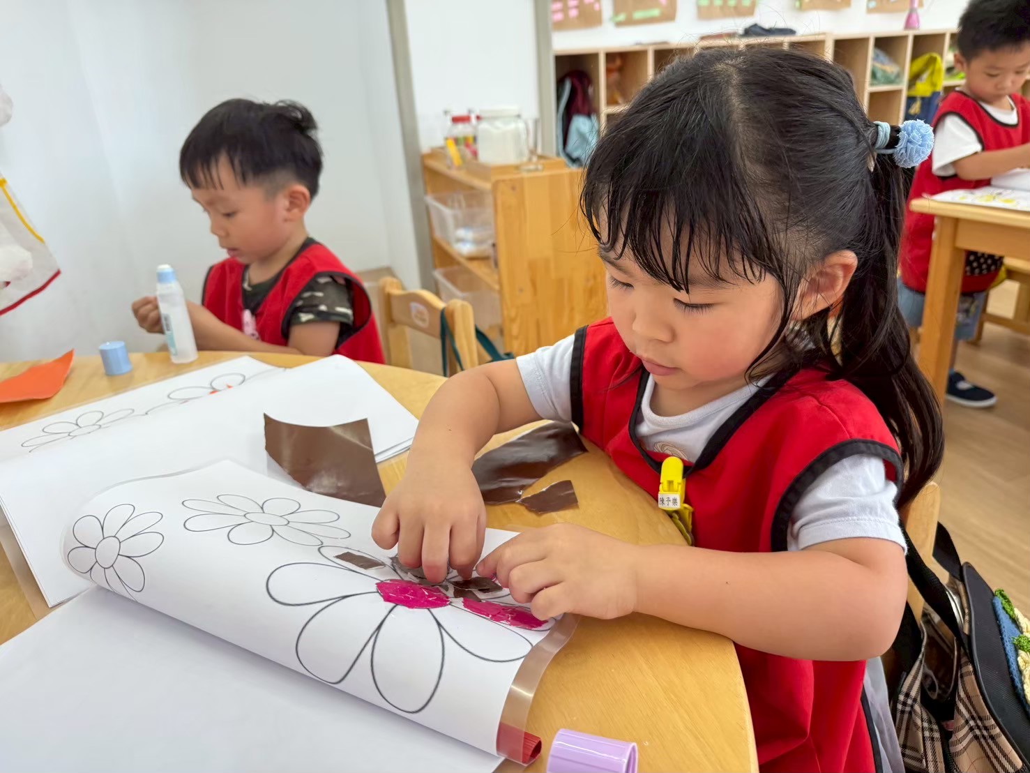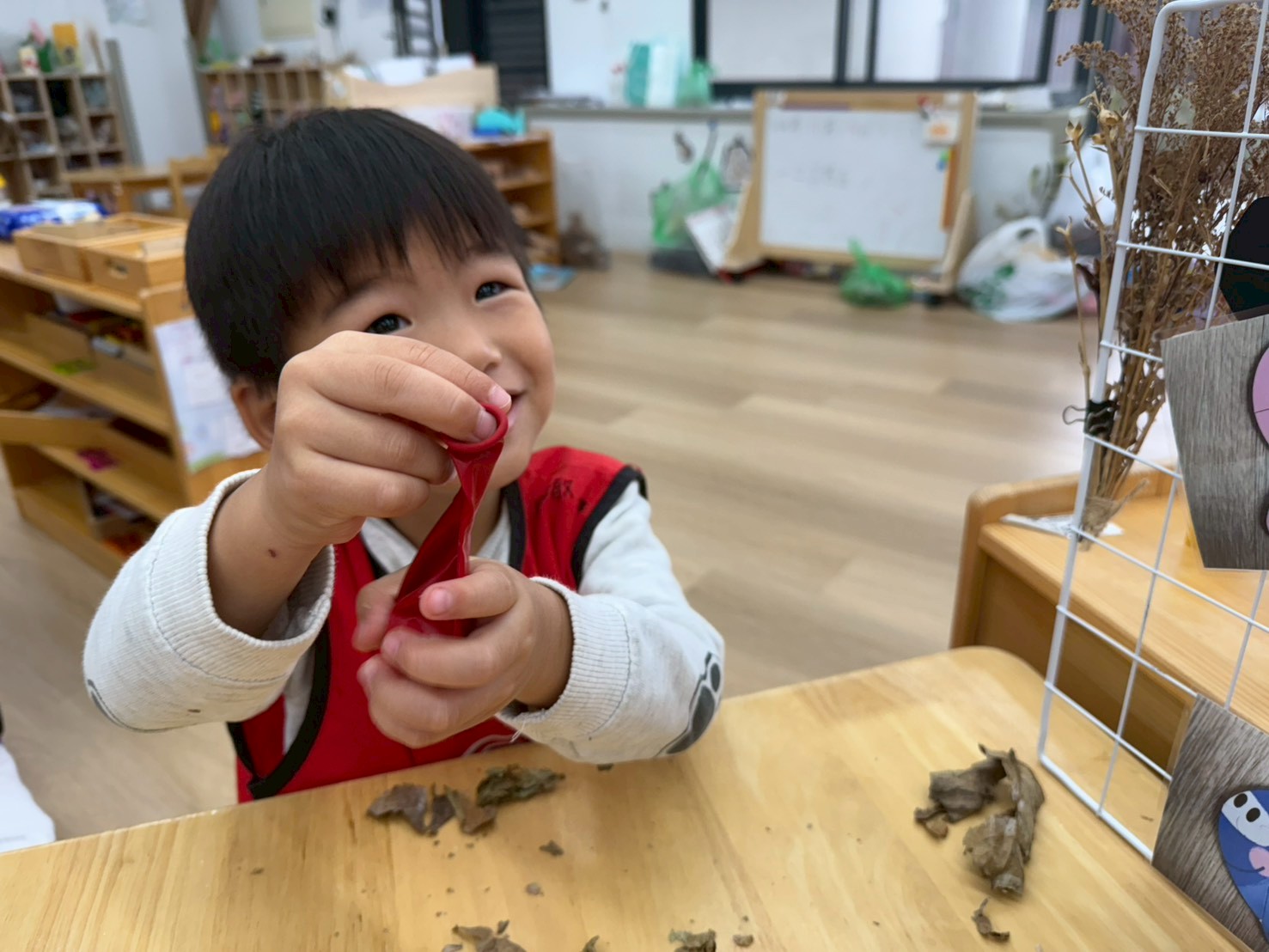 這個月的美勞區結合結合主題,放入鬆散素材讓孩子進行插花的活動,孩子們很喜歡美勞區,在創作上也很有自己的想法。