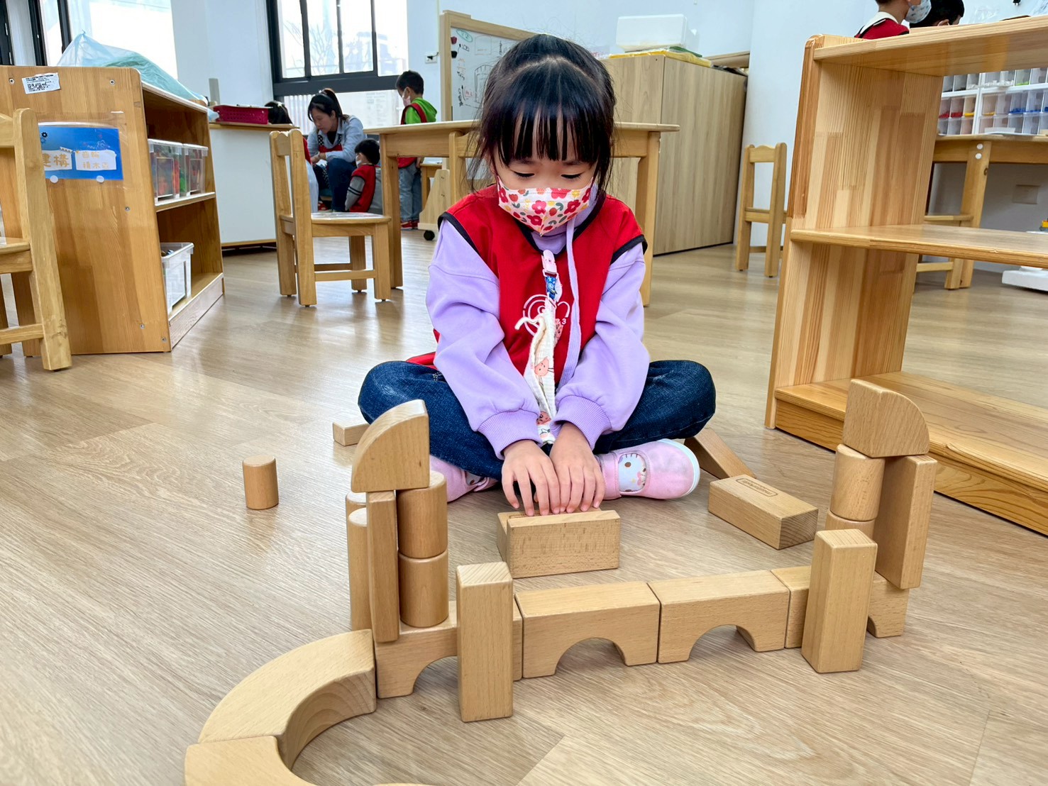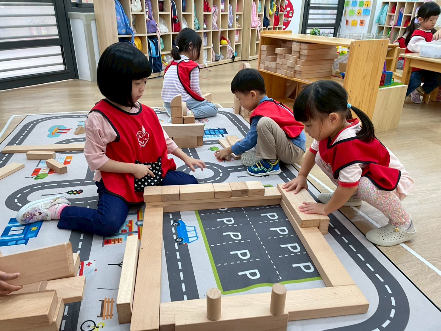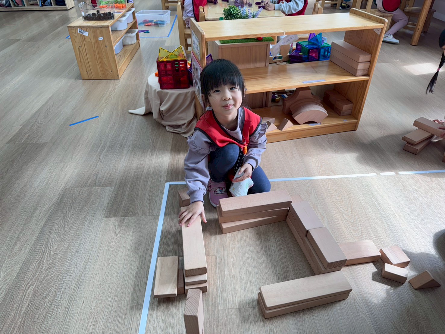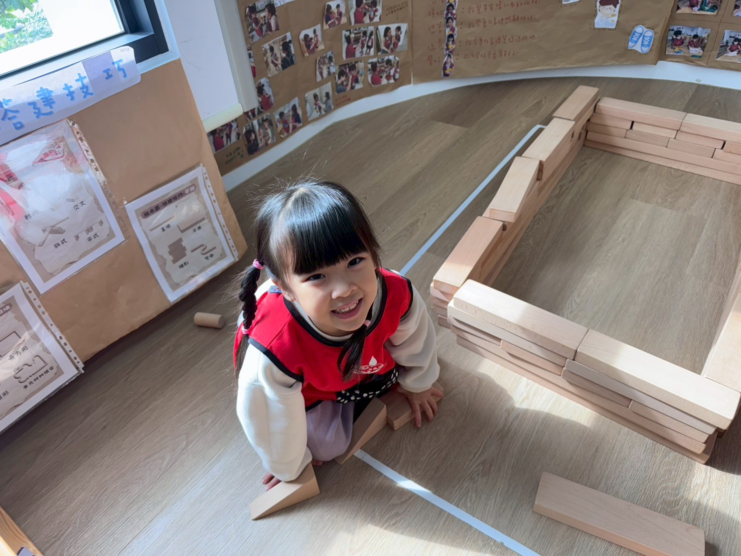 孩子透過操作體積較大的木頭積木,在搬運、堆疊與建構的過程中,能練習手眼協調與空間概念,也學習如何與同伴合作討論,一起完成多樣的建築作品。
